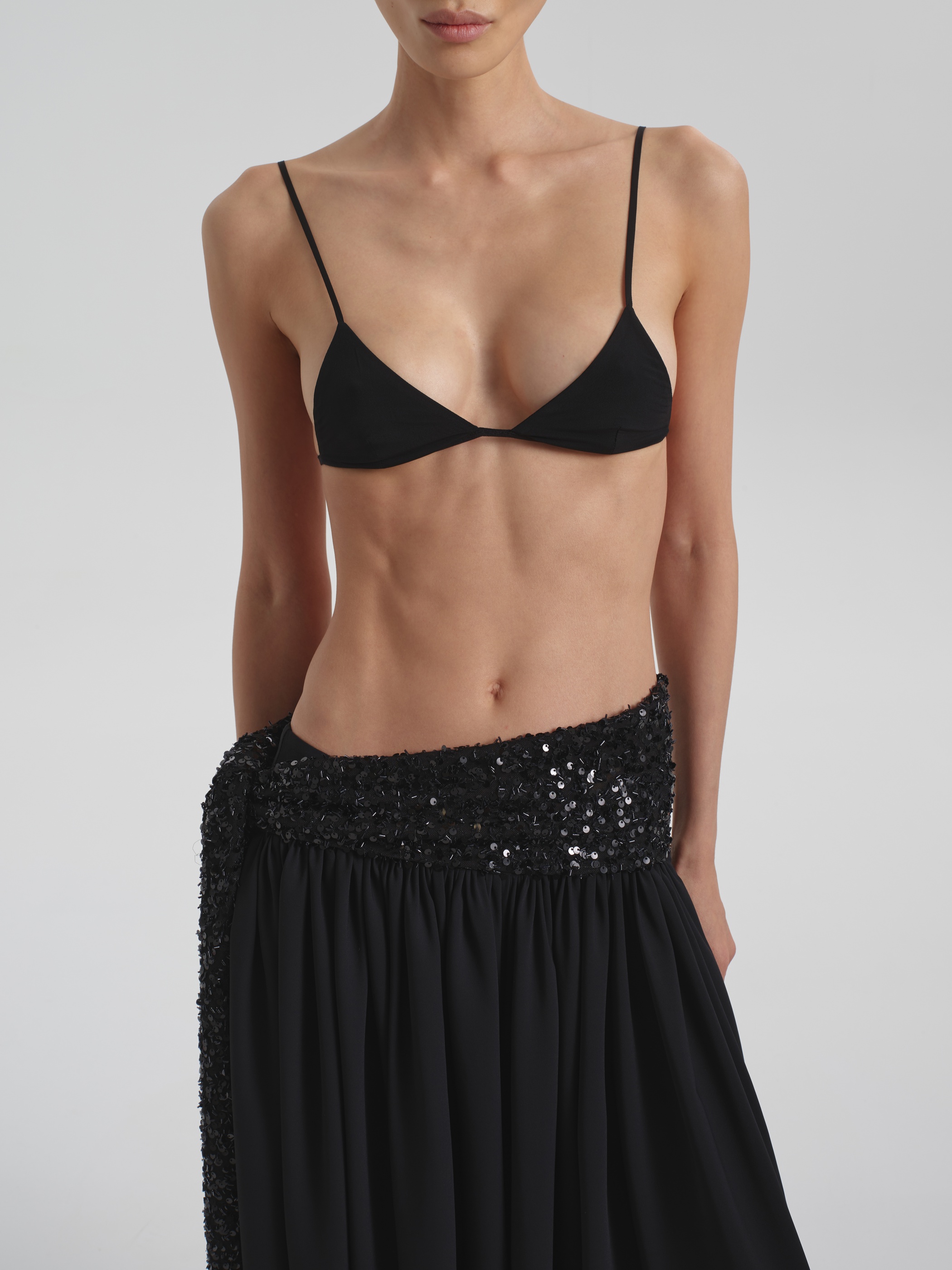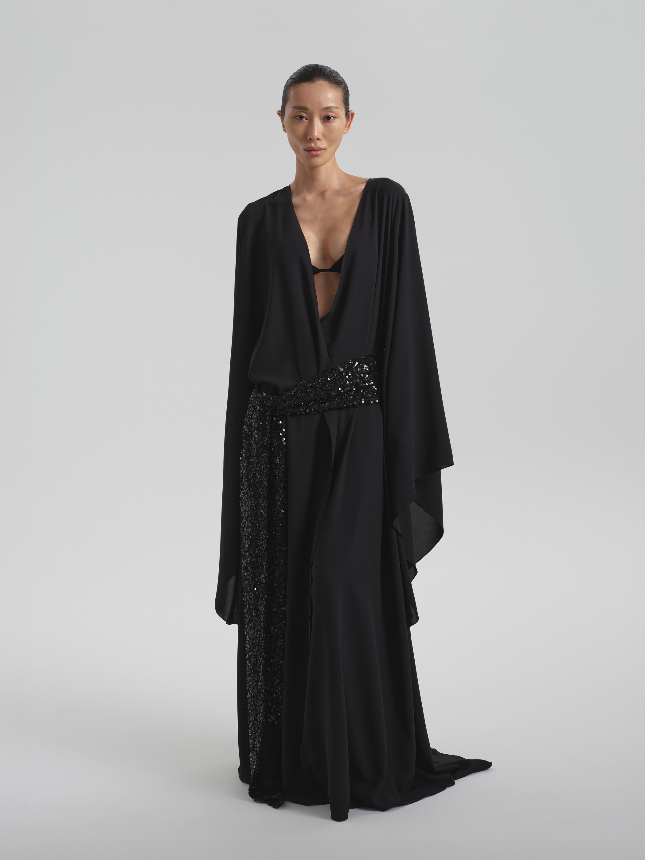 Шарф из легкой тонкой ткани, полностью украшенный мелкими золотистыми пайетками, гармонично сочетает строгость лаконичного силуэта и роскошь декоративного блеска. Его можно стилизовать как элегантный пояс, завершающий монохромный образ или платье свободного кроя, либо как вечерний акцент — в виде шарфа на шее. Этот аксессуар легко адаптируется под разные ситуации: от сдержанного повседневного стиля до торжественного выхода.