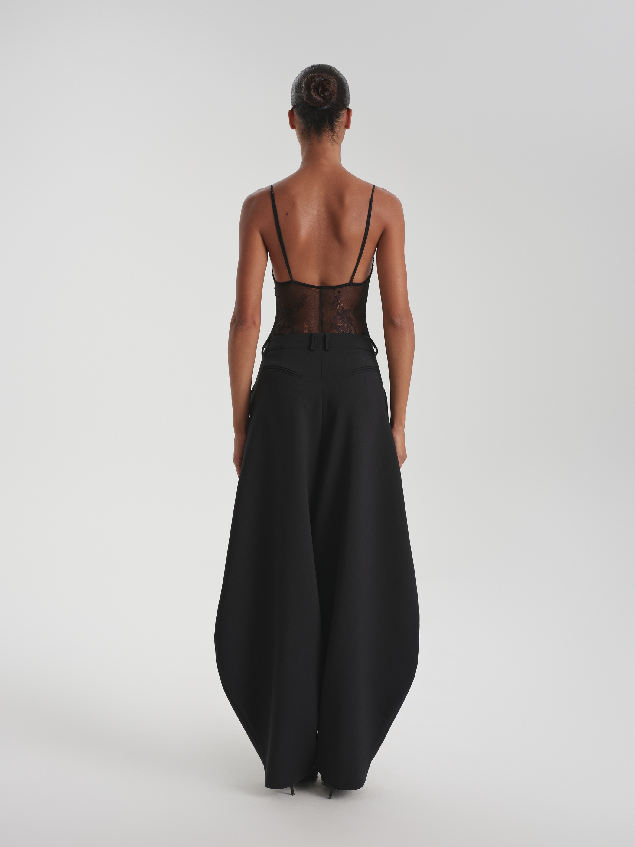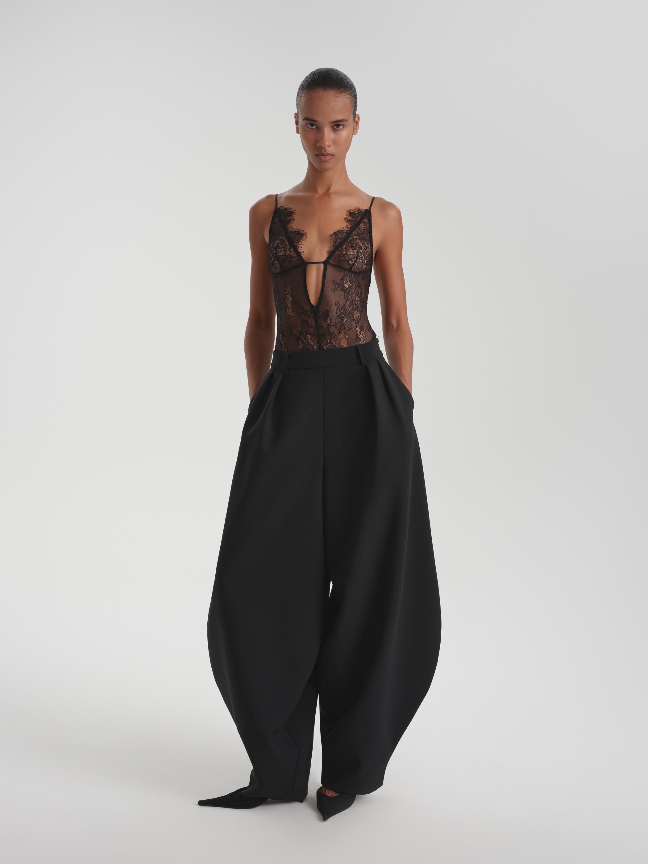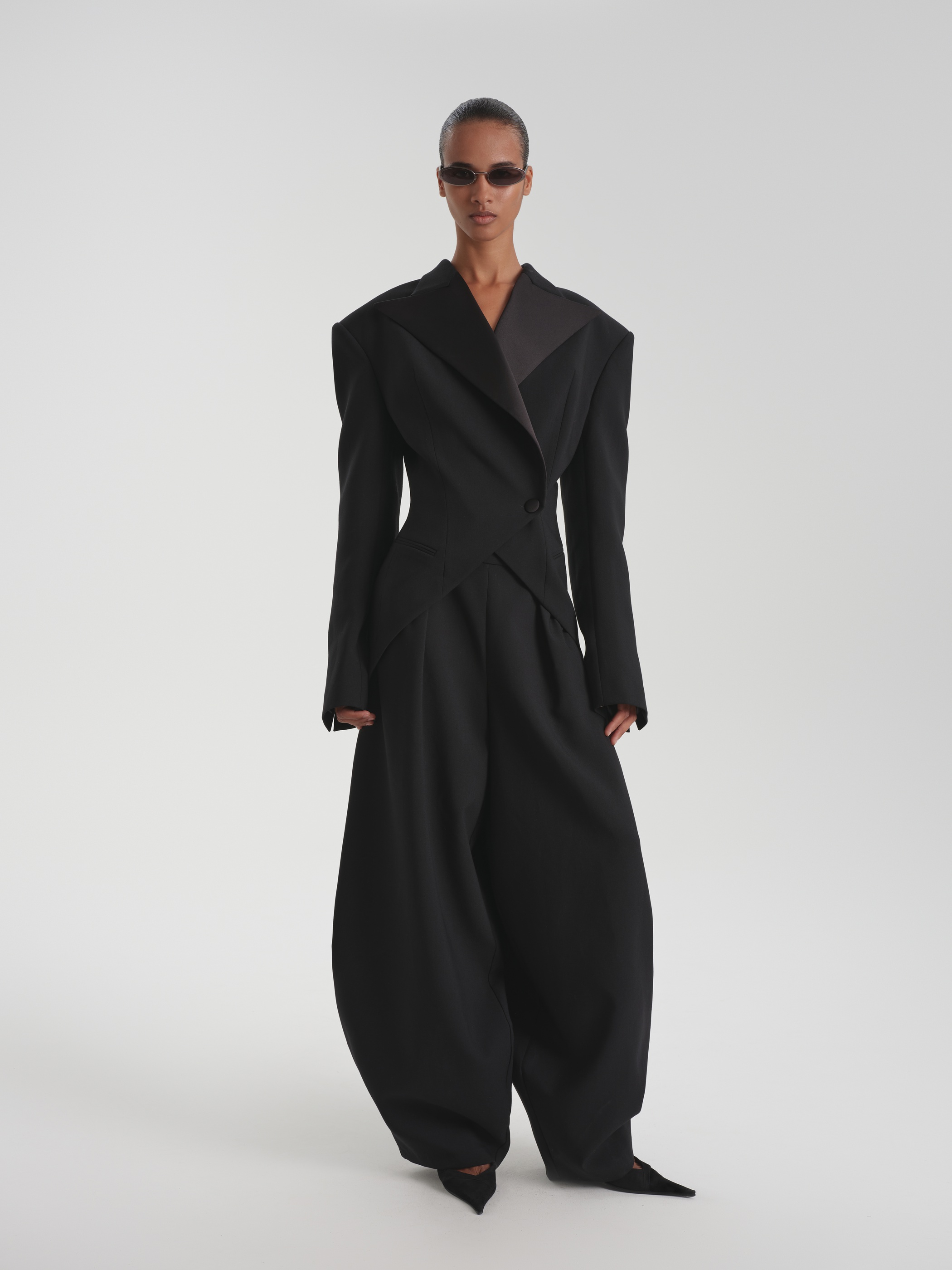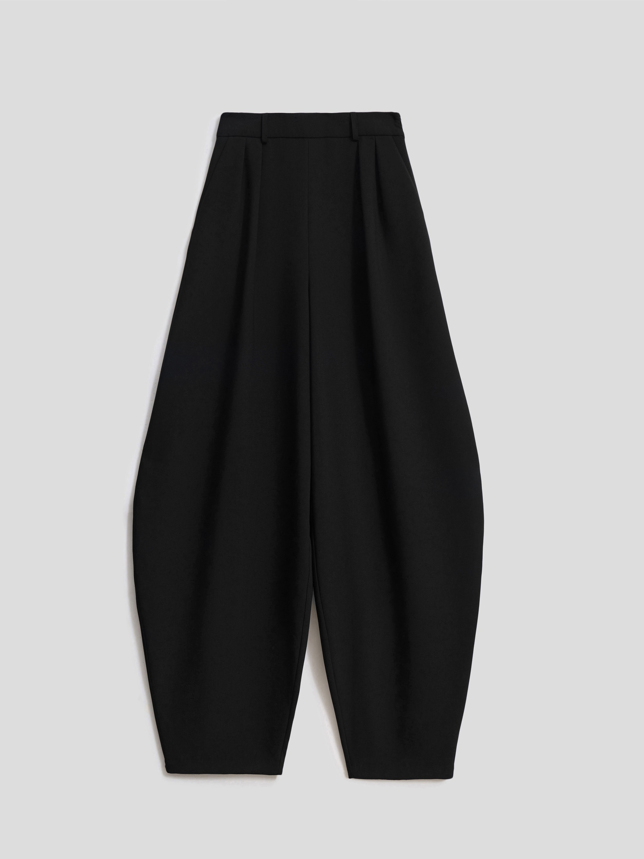 Брюки о-силуэта выполнены в свободном крое с мягким расширением к центру и плавным заужением к низу. Модель имеет среднюю посадку, спереди — декоративные складки, придающие динамику силуэту, и два боковых кармана для функциональности. Модель идеально подходит для создания современного и элегантного образа — подойдёт как для повседневного гардероба, так и для вечернего выхода. Рекомендуем сочетать с облегающими верхами для контраста объёмов.