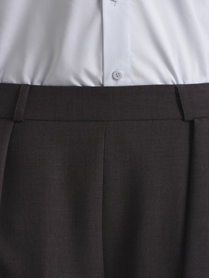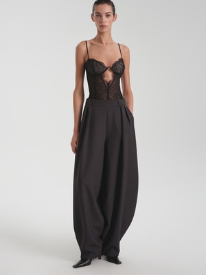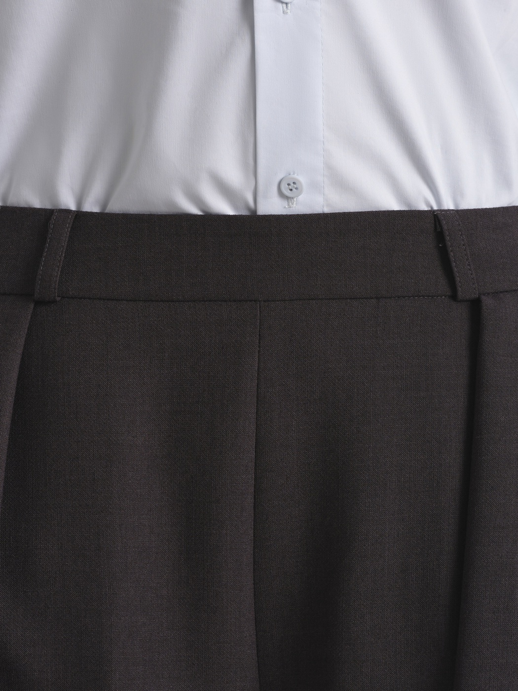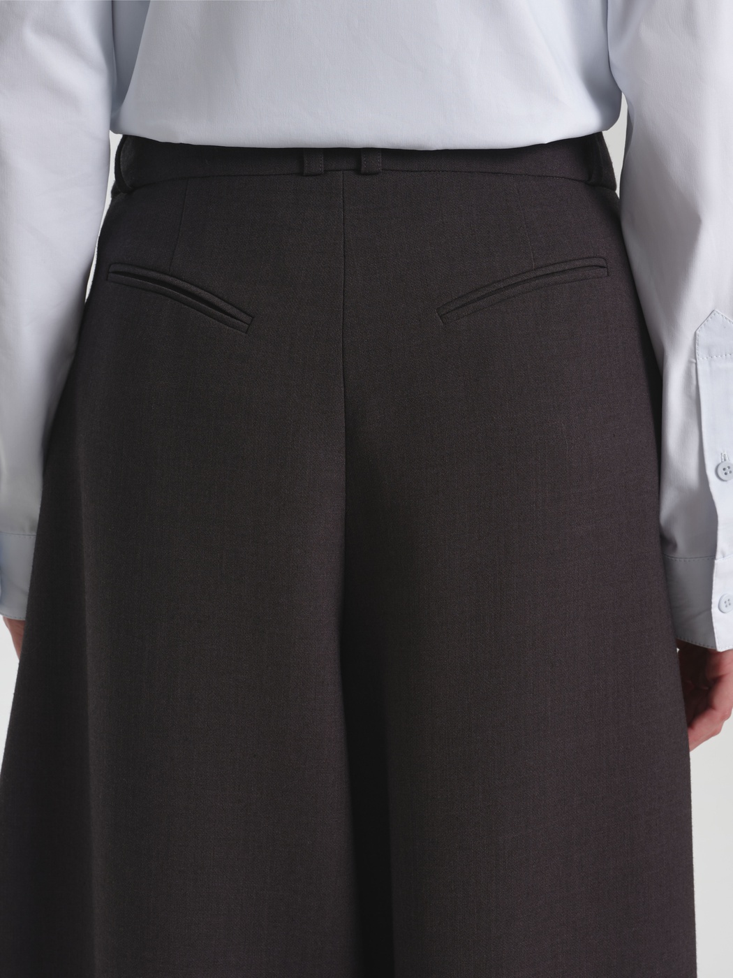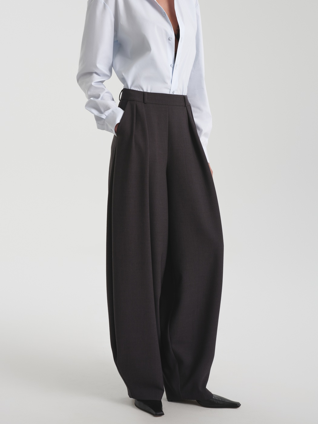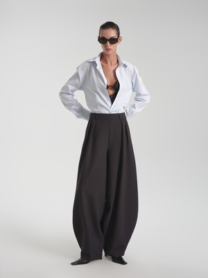 Брюки о-силуэта выполнены в свободном крое с мягким расширением к центру и плавным заужением к низу. Модель имеет среднюю посадку, спереди — декоративные складки, придающие динамику силуэту, и два боковых кармана для функциональности. Модель идеально подходит для создания современного и элегантного образа — подойдёт как для повседневного гардероба, так и для вечернего выхода. Рекомендуем сочетать с облегающими верхами для контраста объёмов.