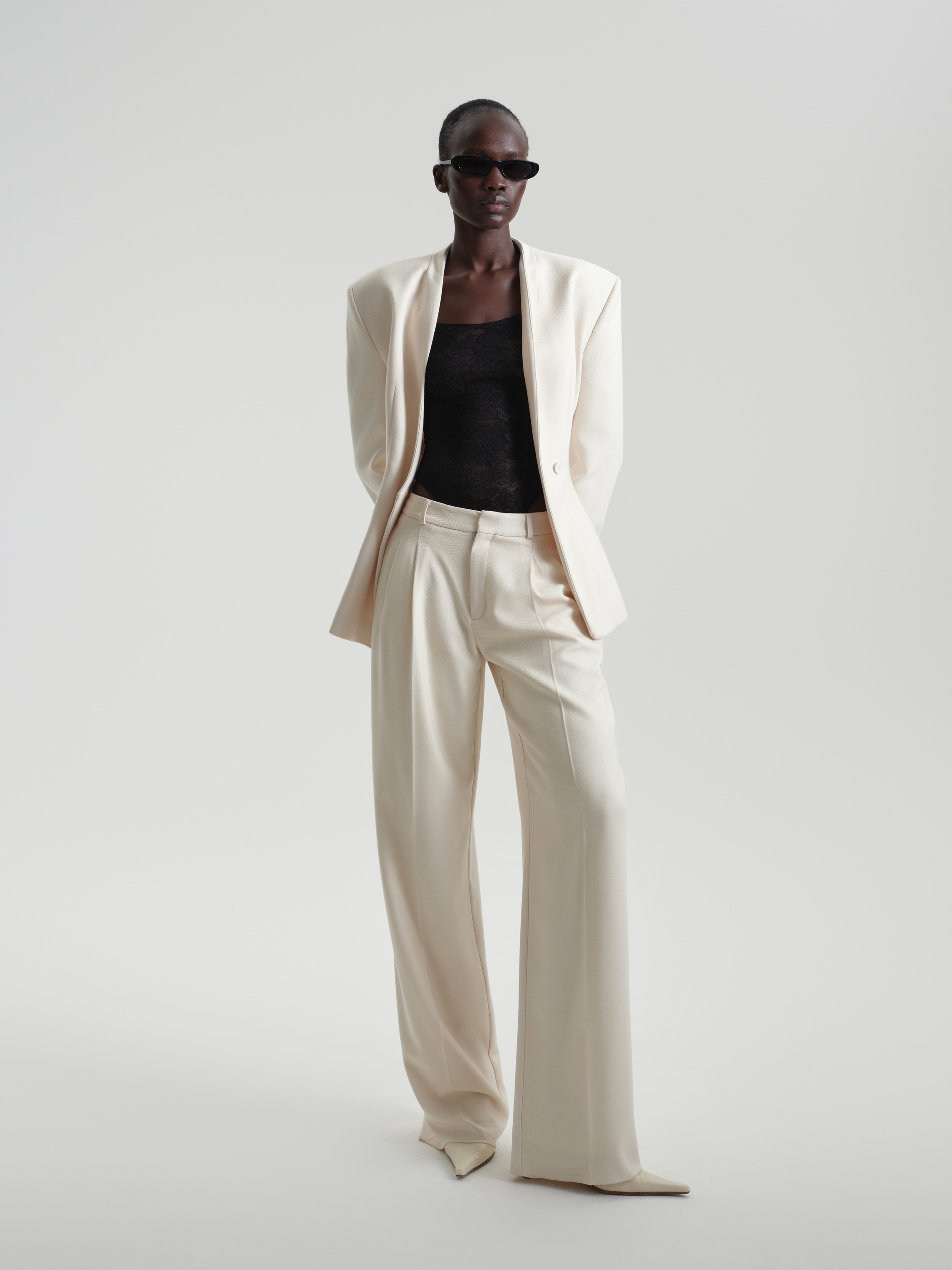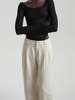 Прямые объемные брюки с защипами, переходящими в стрелки и посадкой чуть ниже талии — для повседневных расслабленных образов. Застегиваются на молнию и крючок. Сочетайте с жакетом и базовым трикотажем аналогичного оттенка для создания монохромного образа.