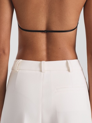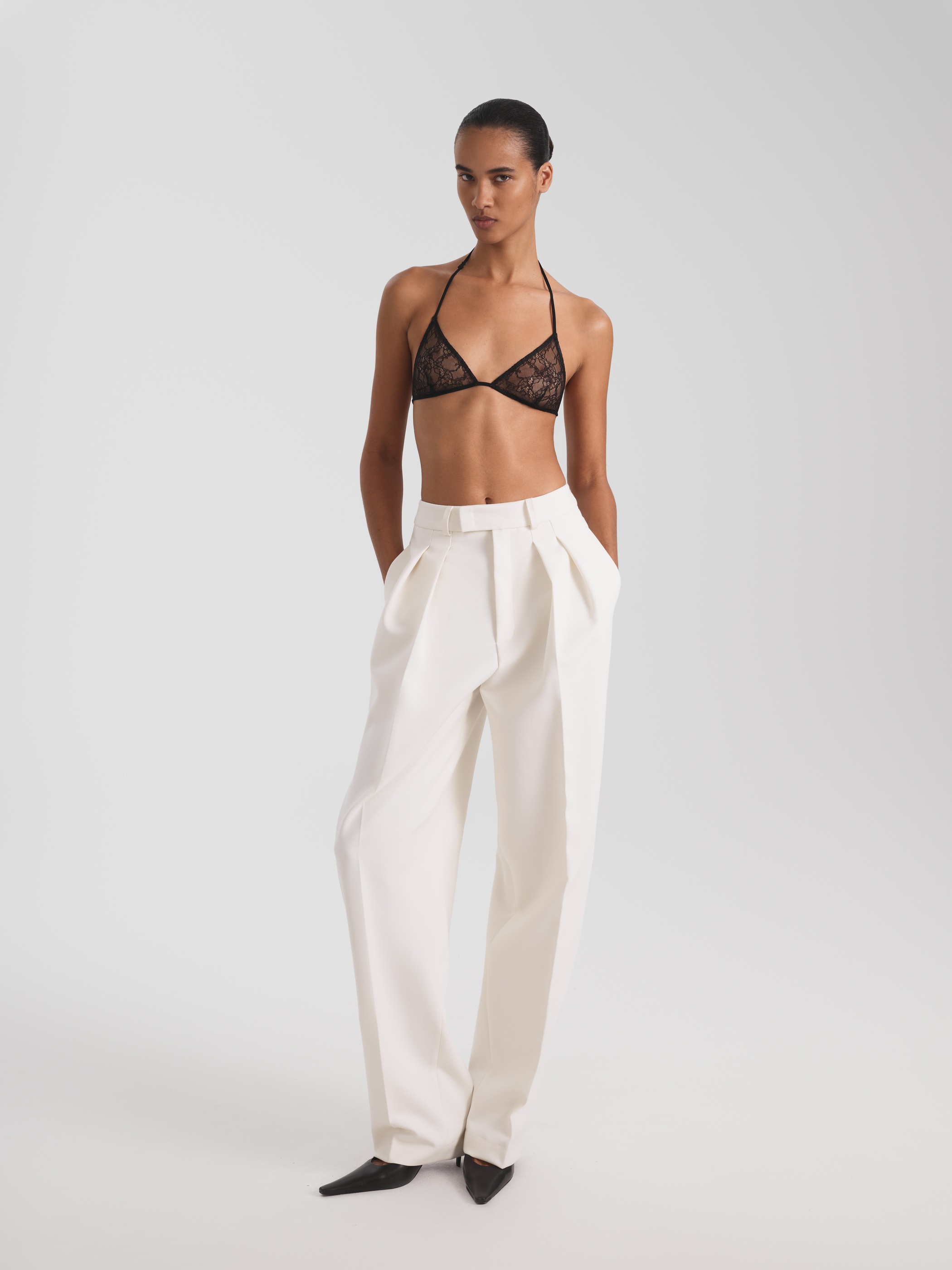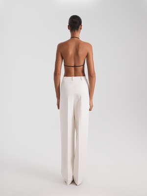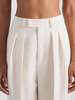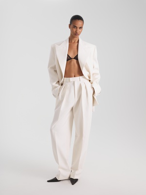 Брюки выполнены из плотной костюмной ткани. Двойные защипы спереди обеспечивают свободу движения, а прямой крой визуально удлиняет силуэт. Для создания монохромного образа сочетайте брюки с жакетом смокингом.
