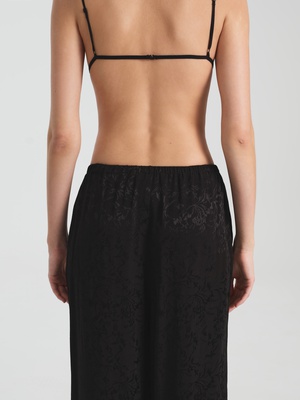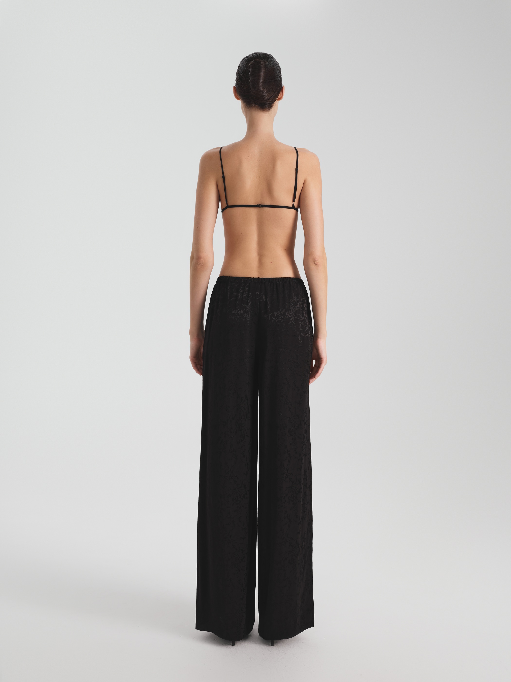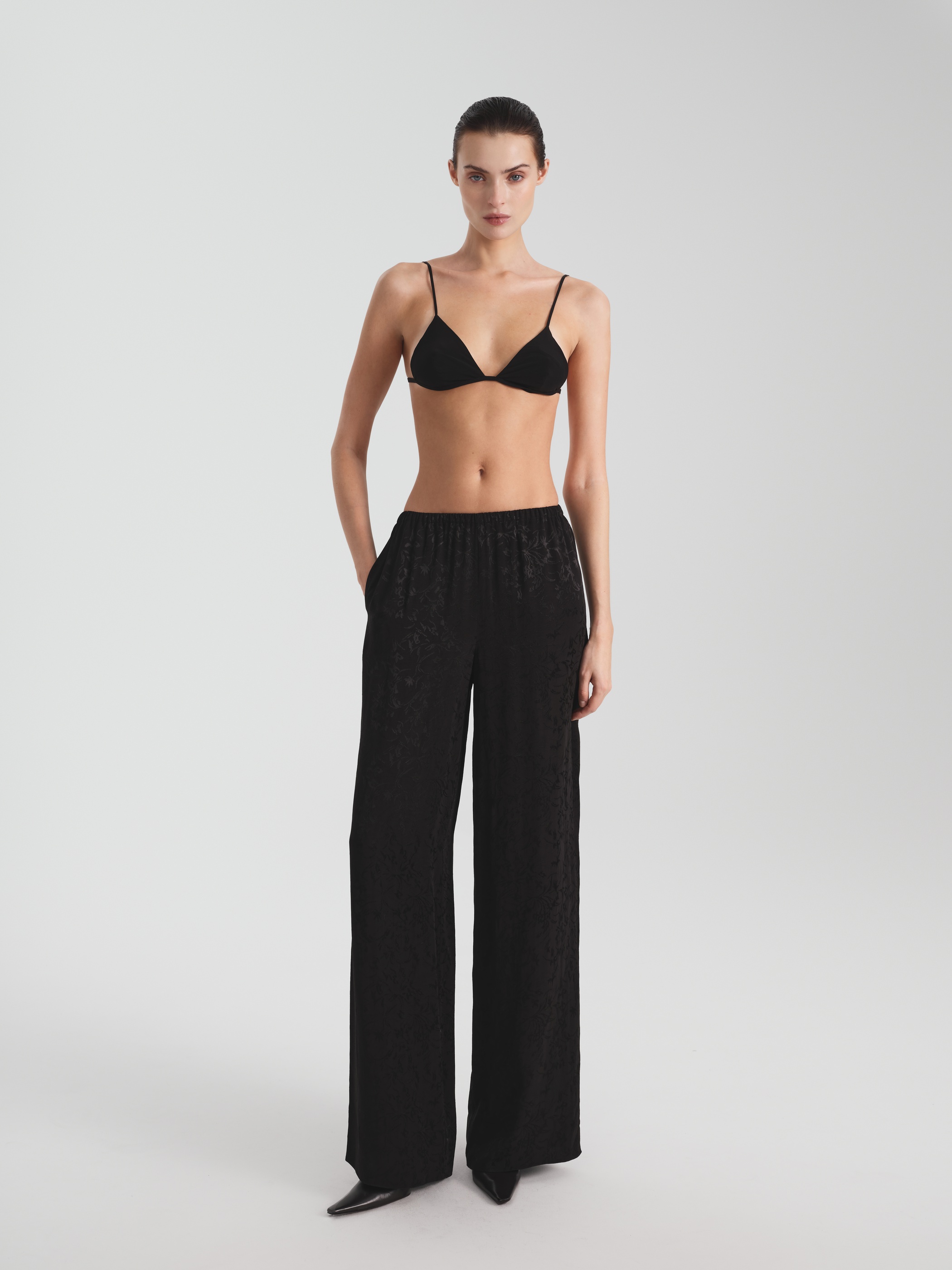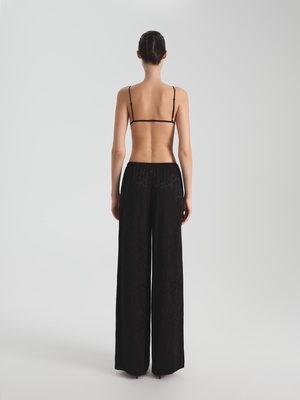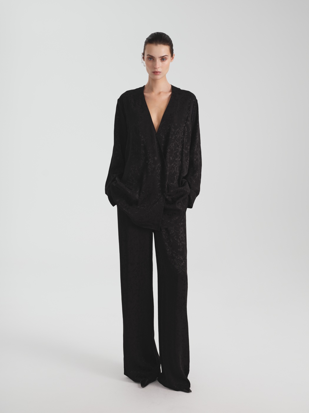 Для расслабленных, но изысканных образов — широкие брюки пижамного кроя с высокой талией и тонкой эластичной резинкой: комфорт и лаконичный силуэт. Брюки выполнены из струящейся ткани c добавлением шелка и жаккардовым узором с деликатным блеском. Прямой, умеренно объёмный силуэт с карманами и низкой посадкой — оммаж вечной идее домашней элегантности: когда комфорт становится выражением вкуса.