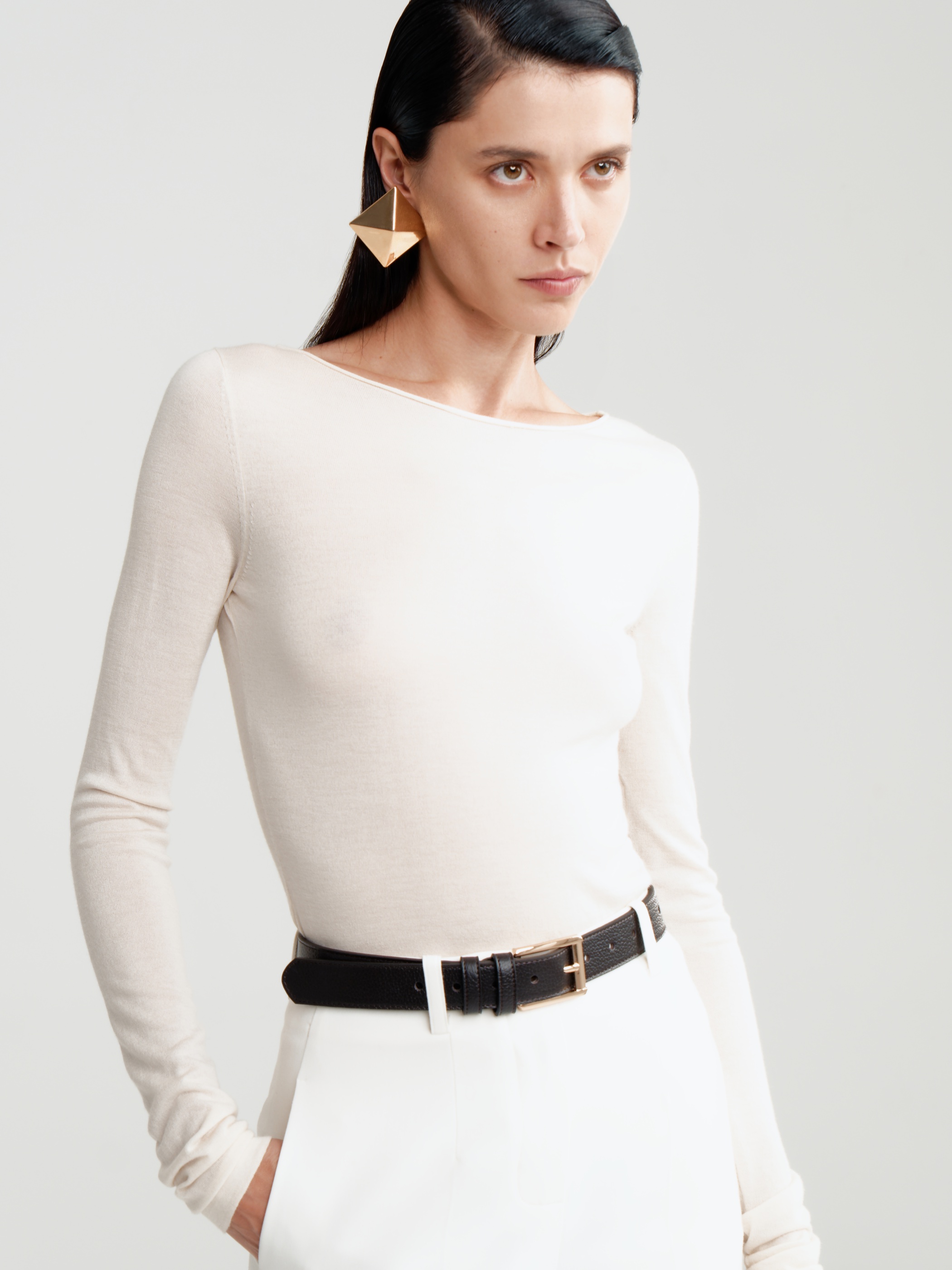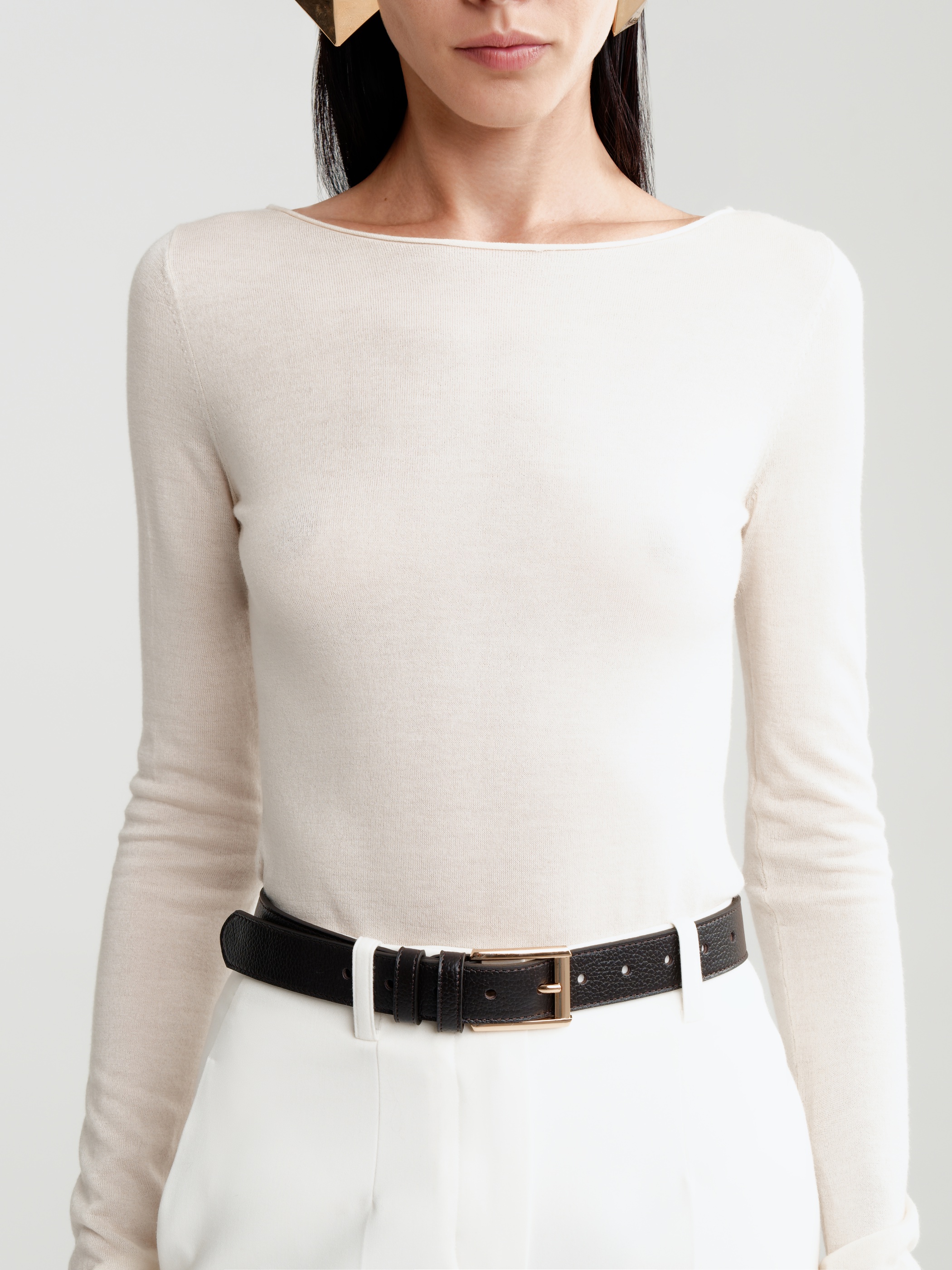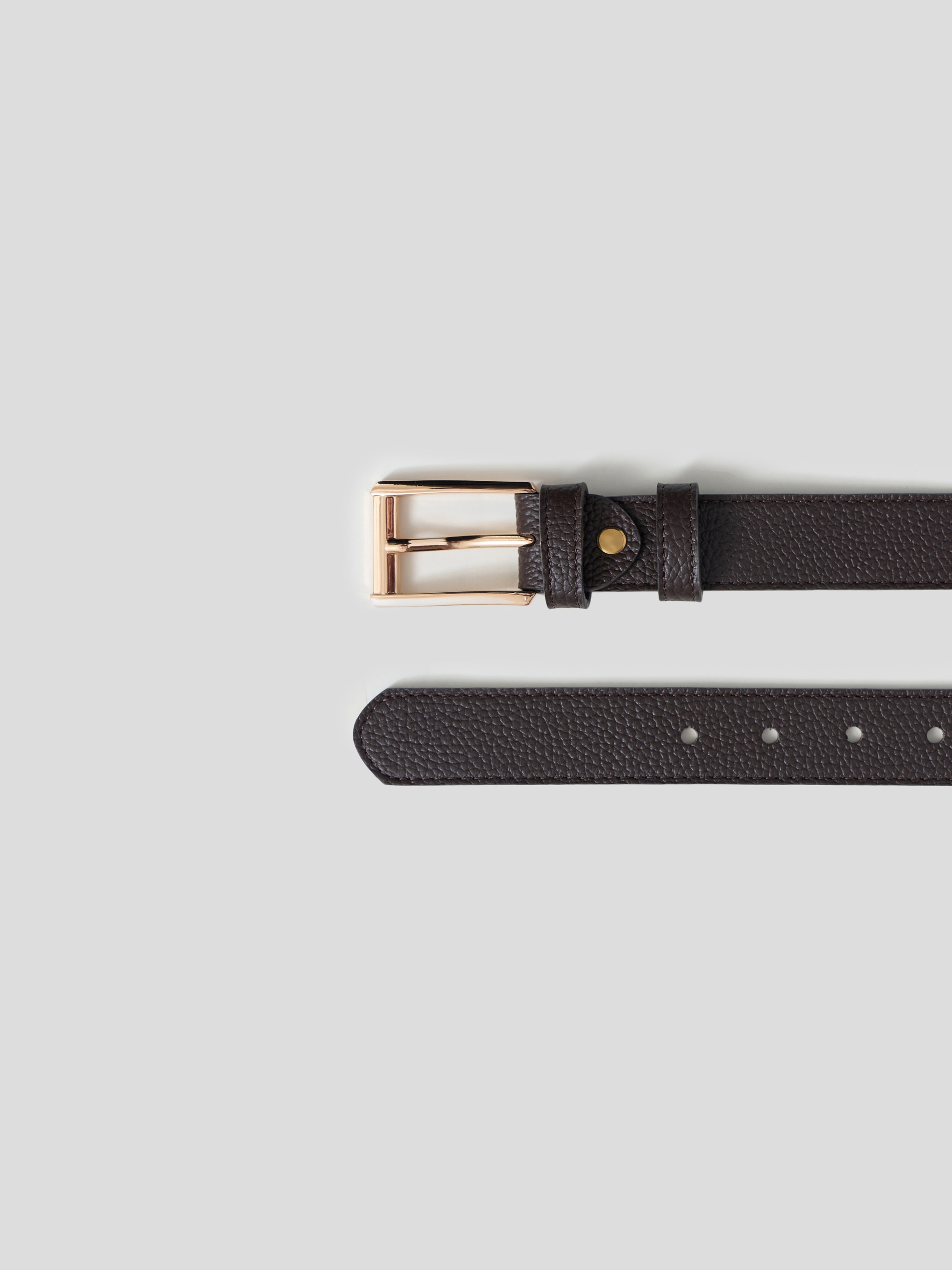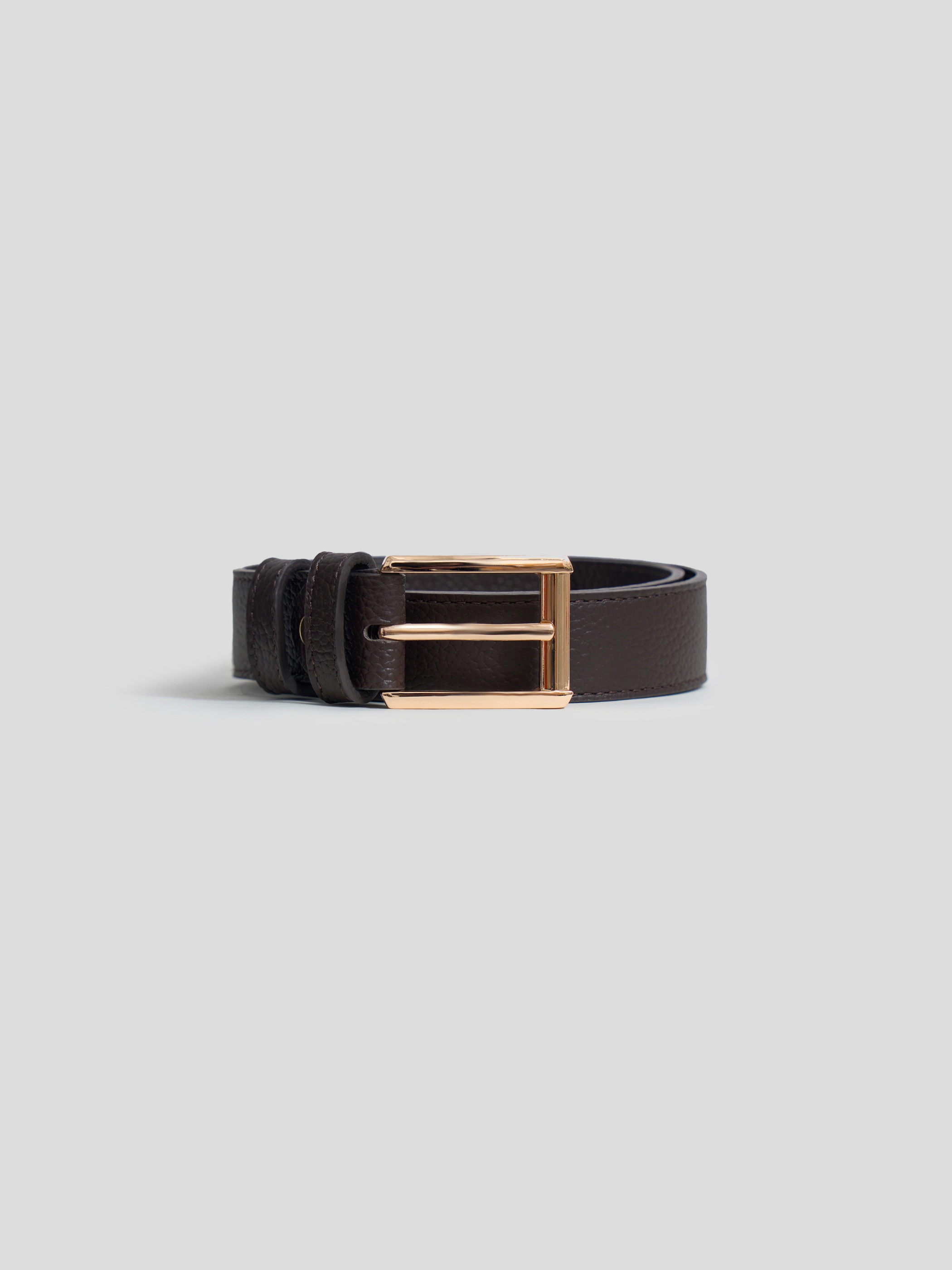 This classic belt in a deep chocolate color made of natural grained leather is an indispensable accessory in the wardrobe. The buckle is made in gold color.