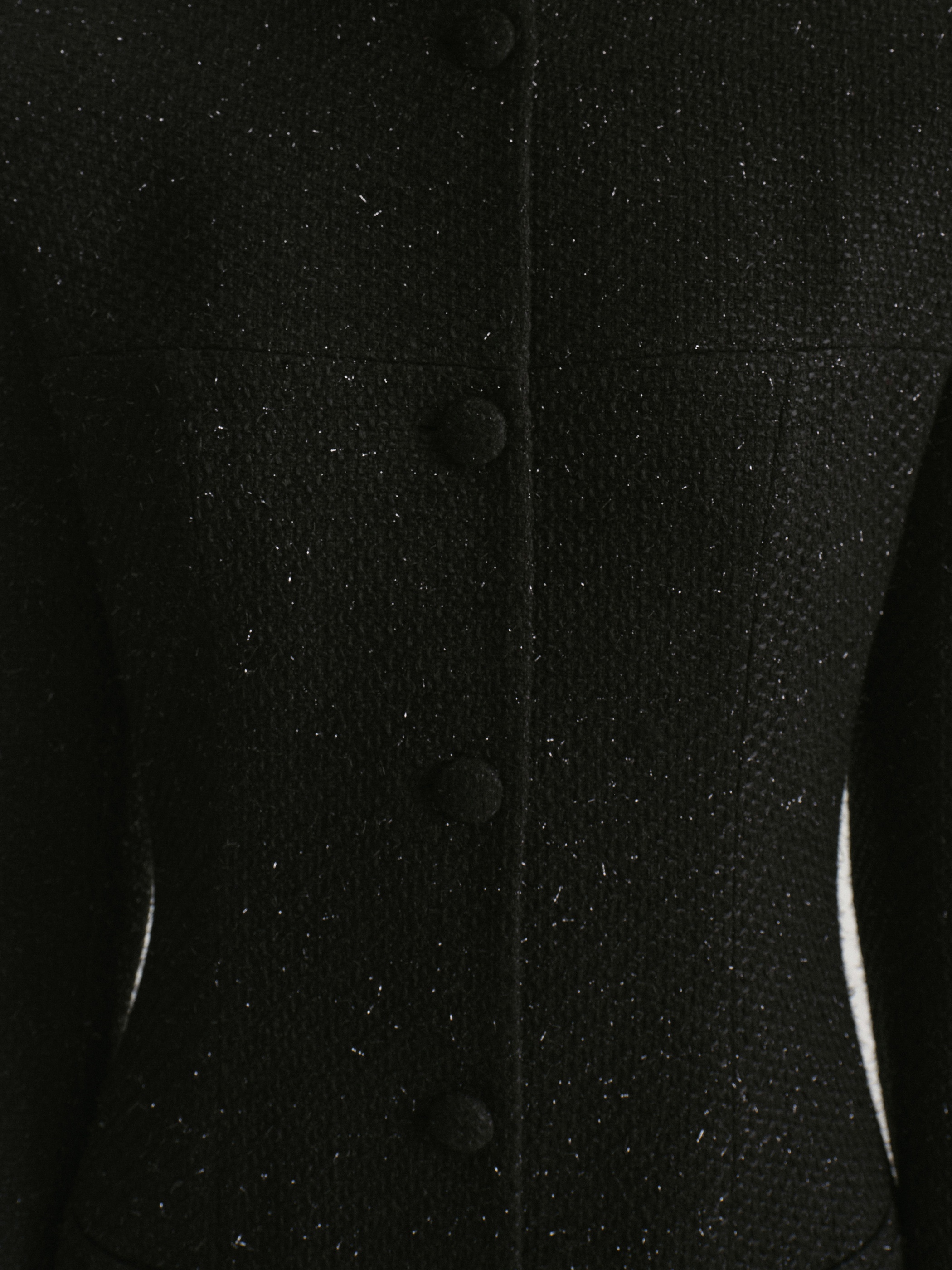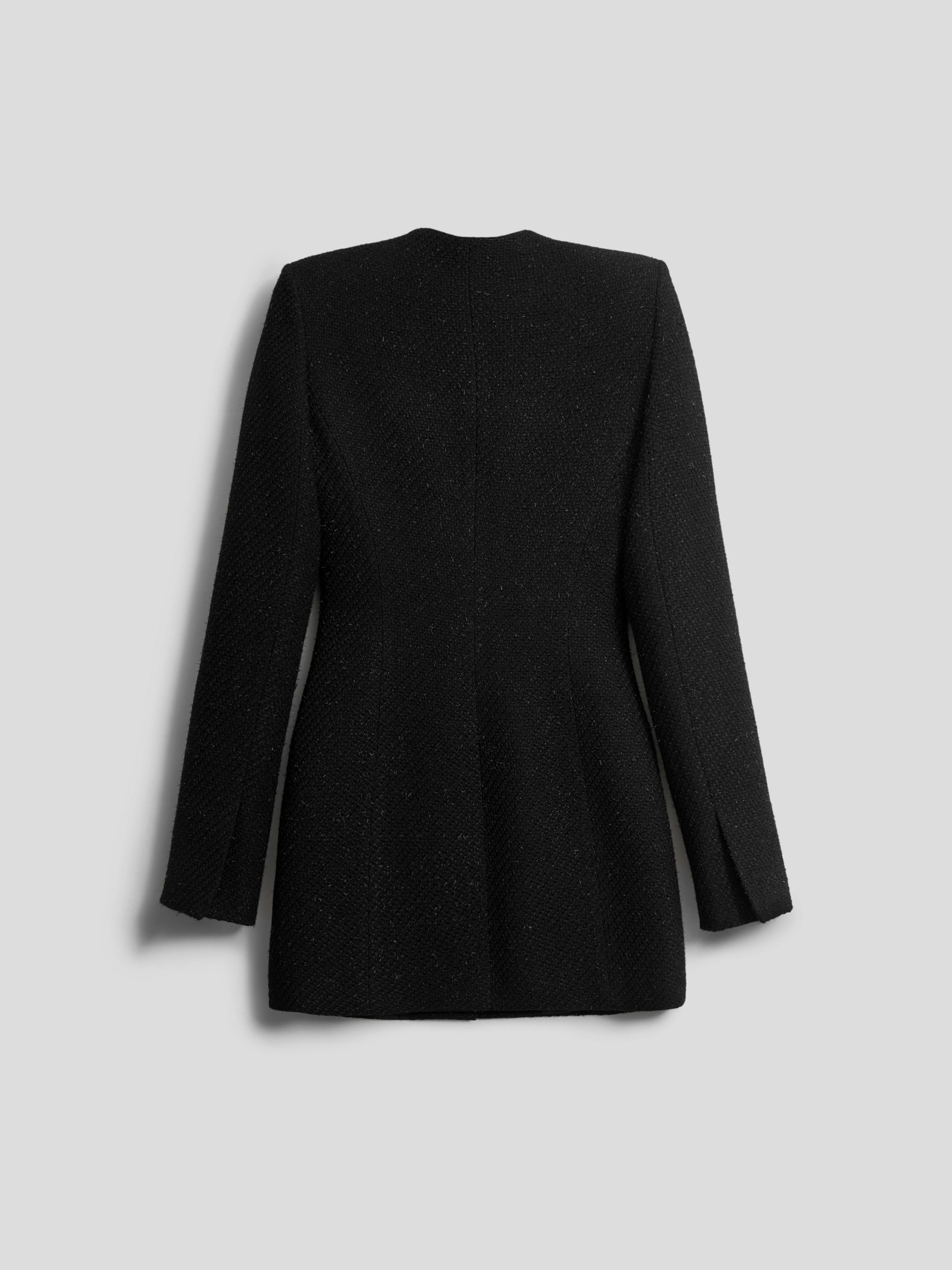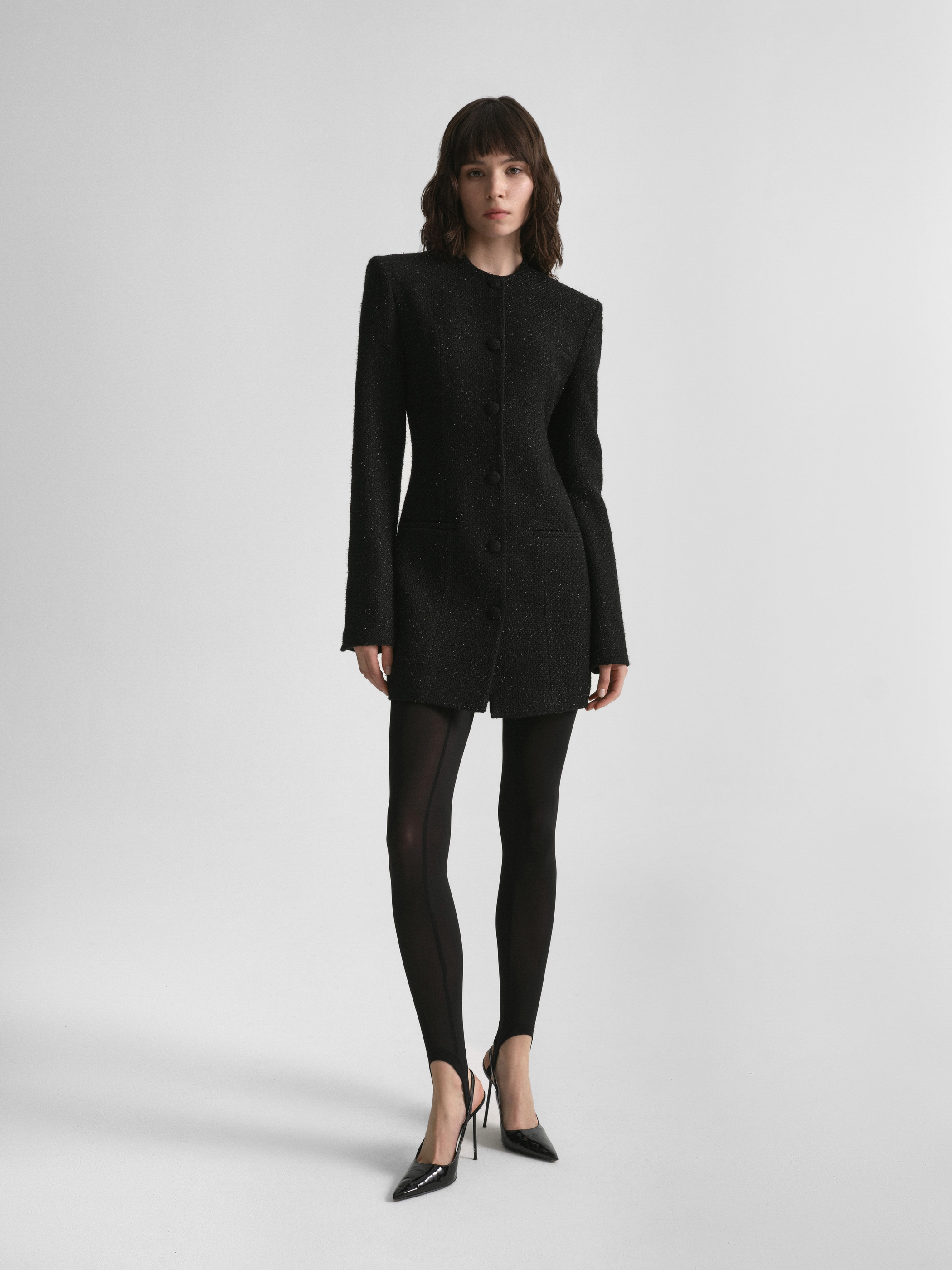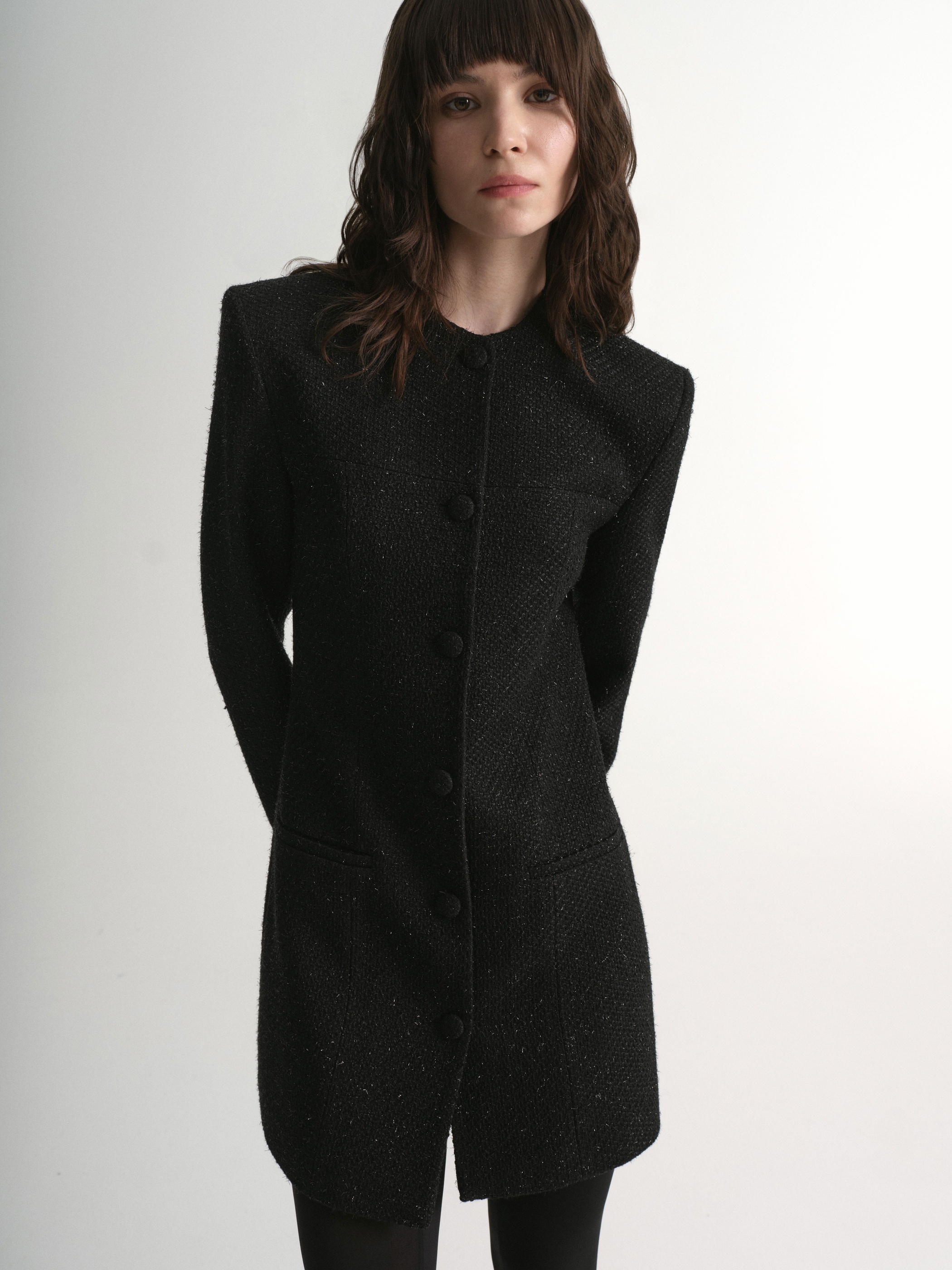 Elegant jacket dress in boucle fabric with fitted silhouette and mini length. The round neckline and strict shoulder line add sophistication to the look, while welt pockets and embossed seams emphasize the thoughtful cut. The central closure with tight buttons completes the look.