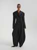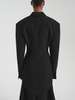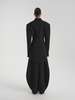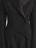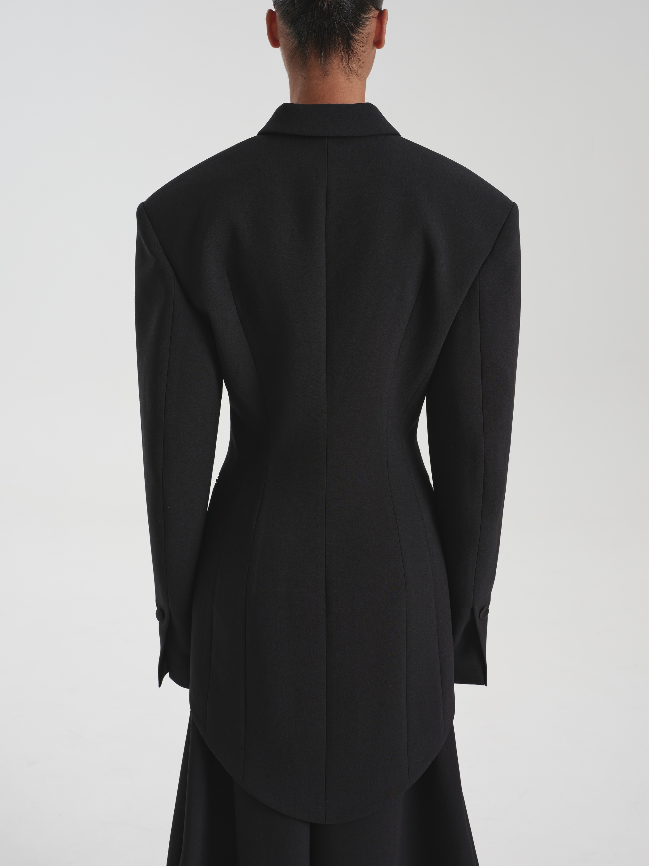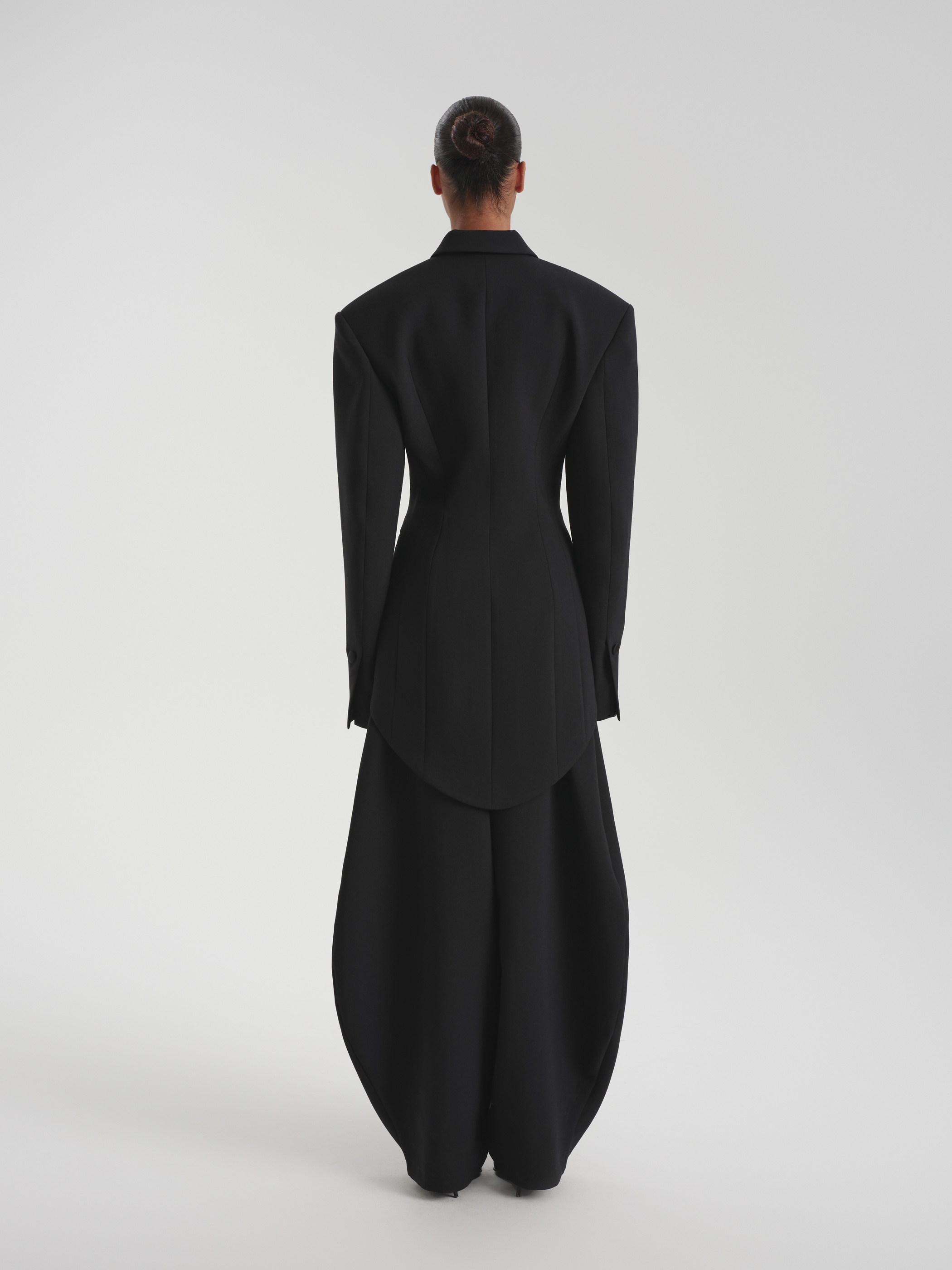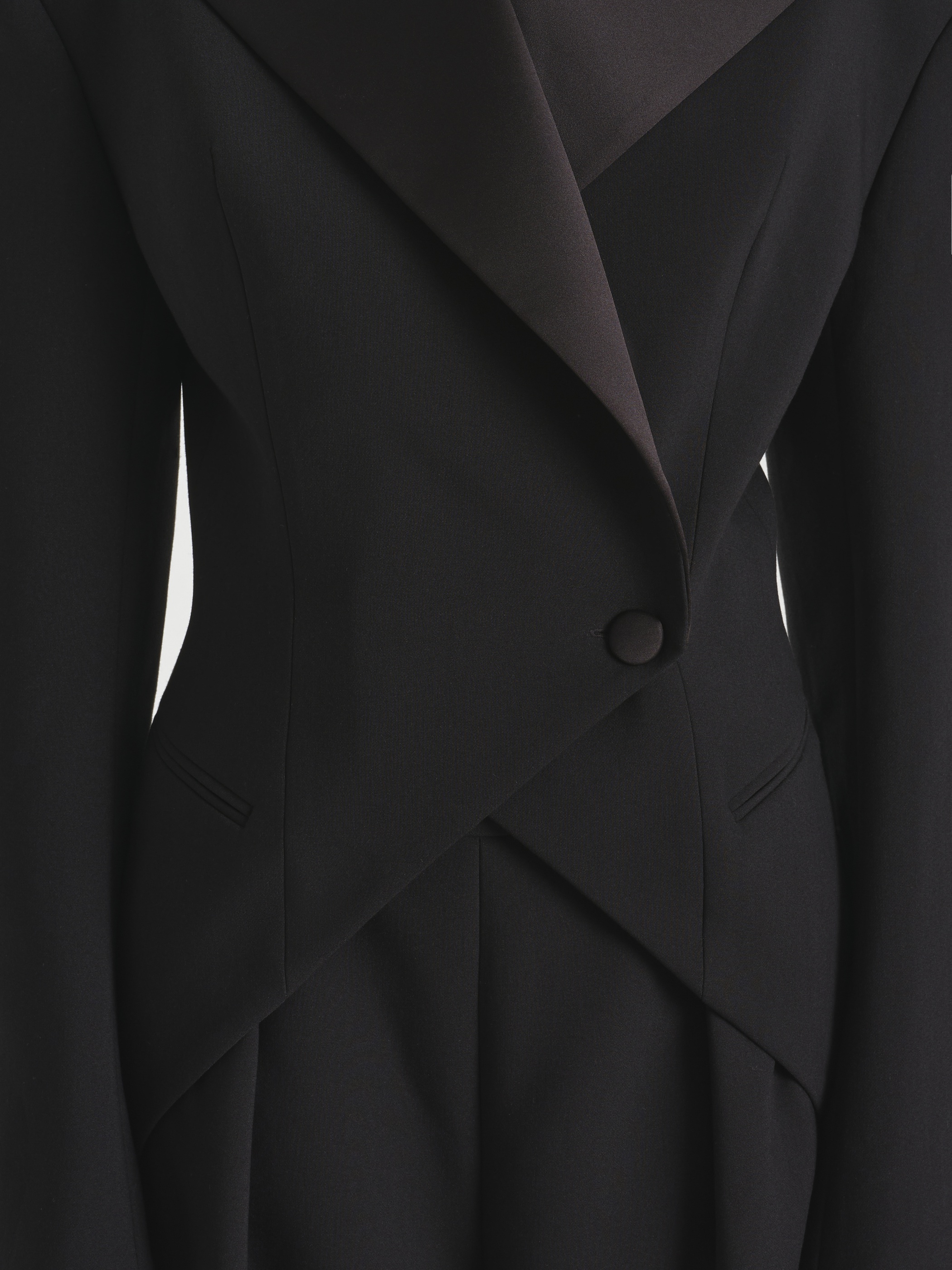 The black tailcoat jacket is austerity, rewritten in a modern way. The moderate volume, fitted silhouette and elongated back refer to the classic tailcoat, but without theatricality. The extended shoulders and long sleeves accentuate the shape without overloading the look. A turn—down collar with large lapels and a double-breasted closure are the details arranged according to the canons. The length below the hips allows you to wear the jacket with both trousers and dresses.