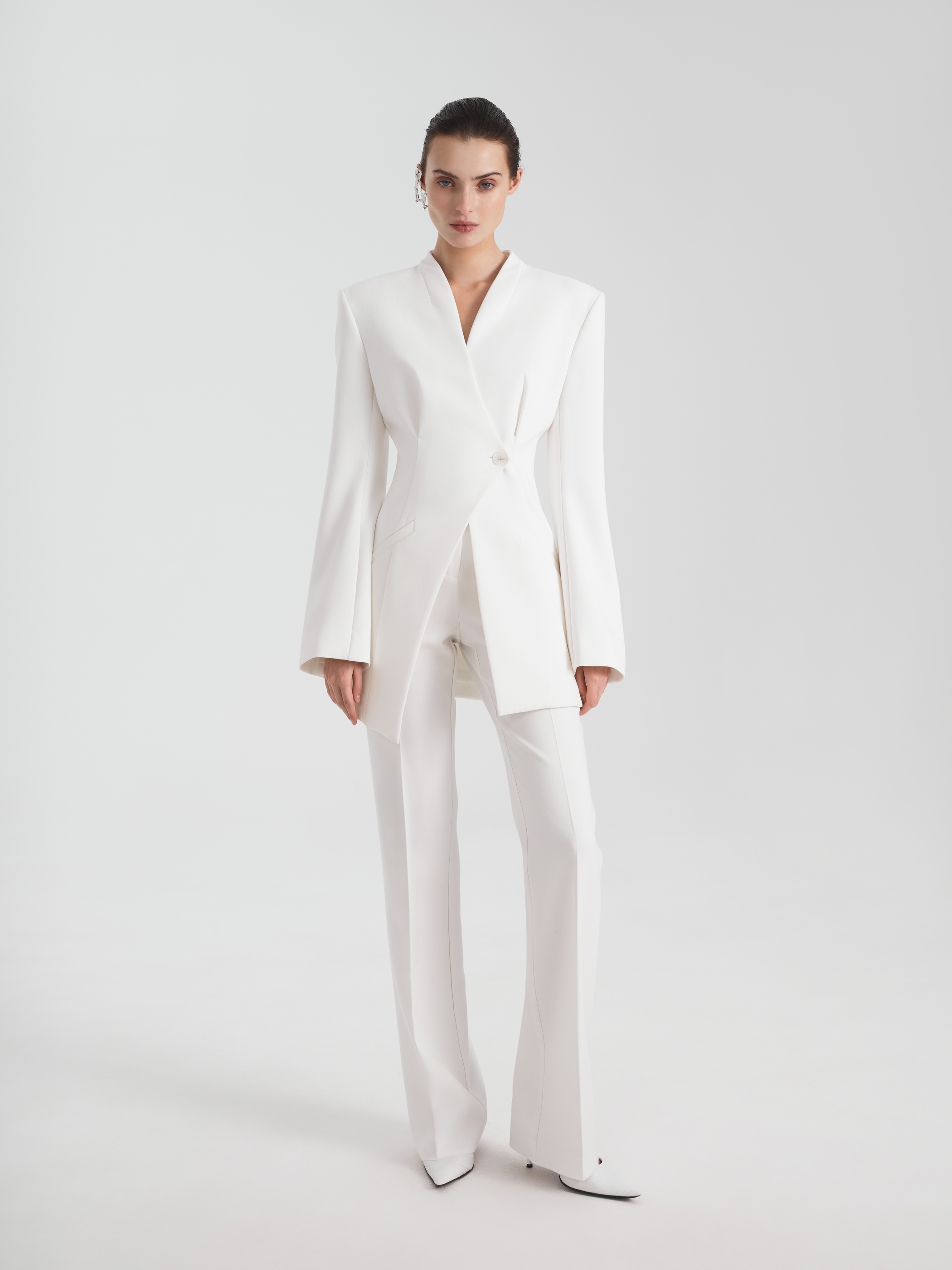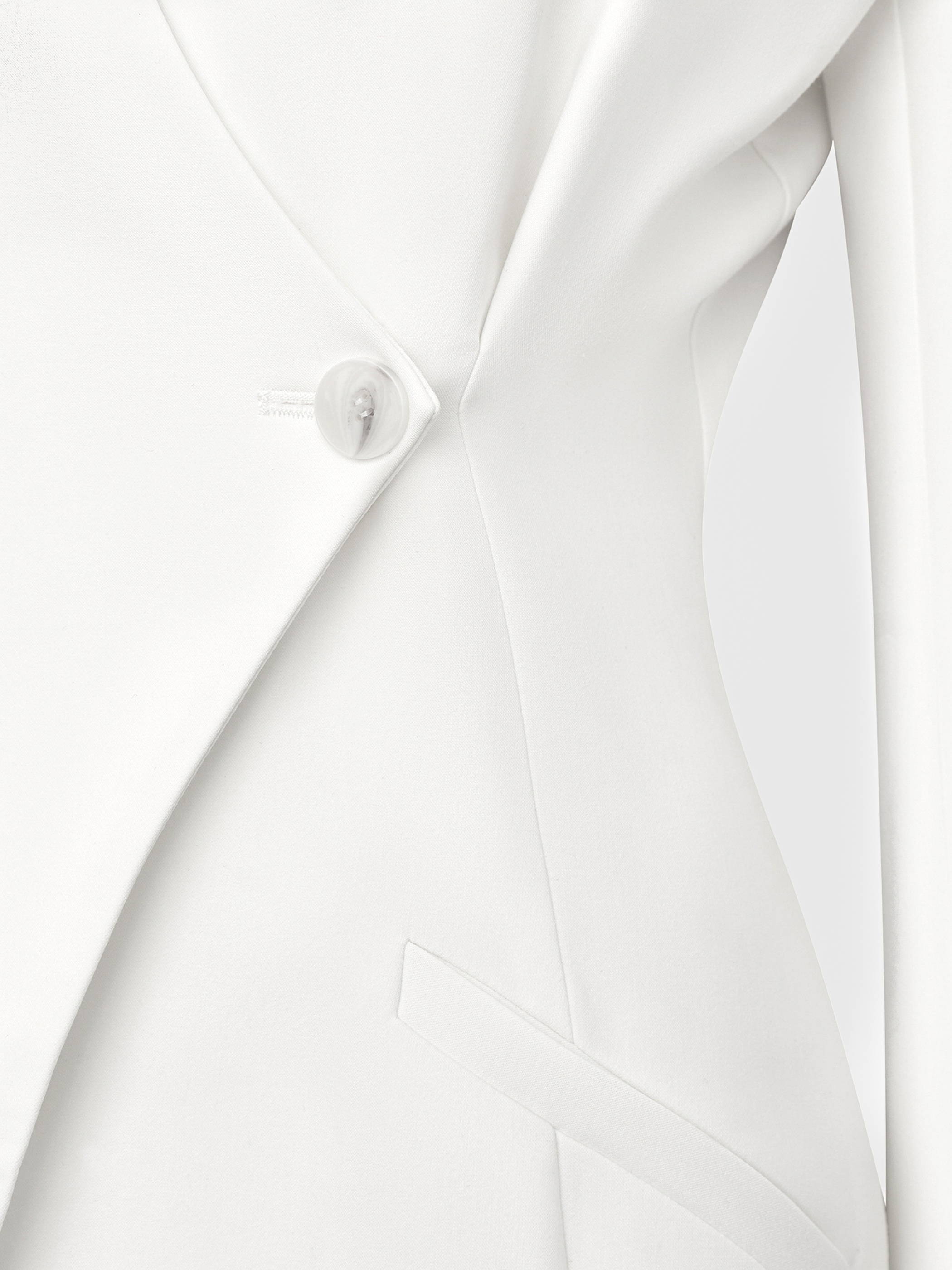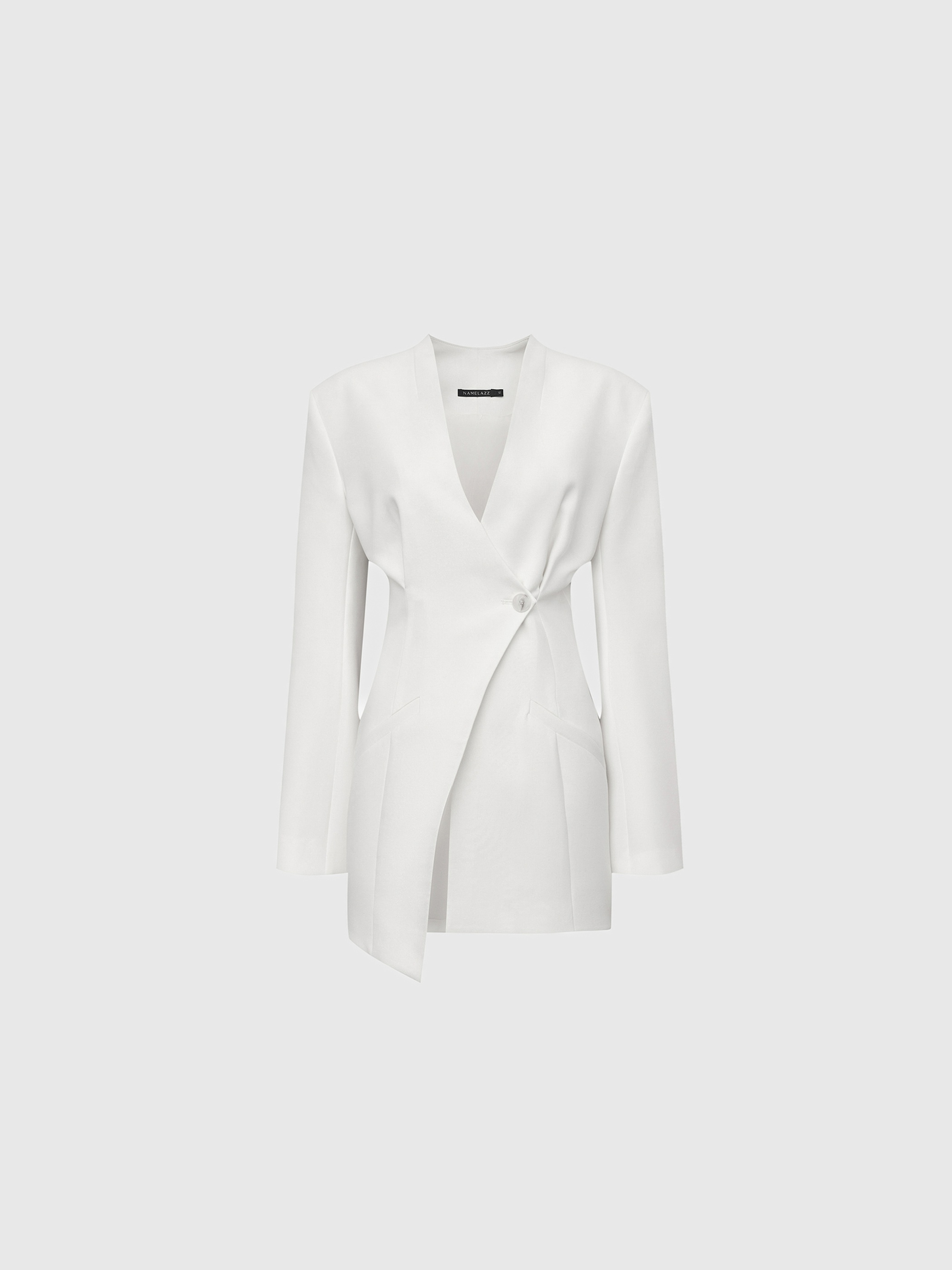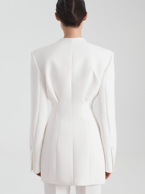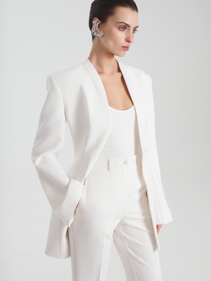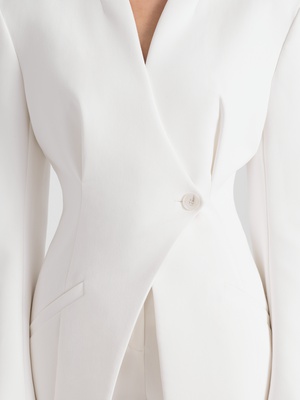 Oversize jacket with accent waist is a bestseller from the Namelazz brand. The model features a voluminous silhouette, a seamless stand collar, and an asymmetrical hem, creating a striking look. It is an ideal choice for stylish office and evening outfits.