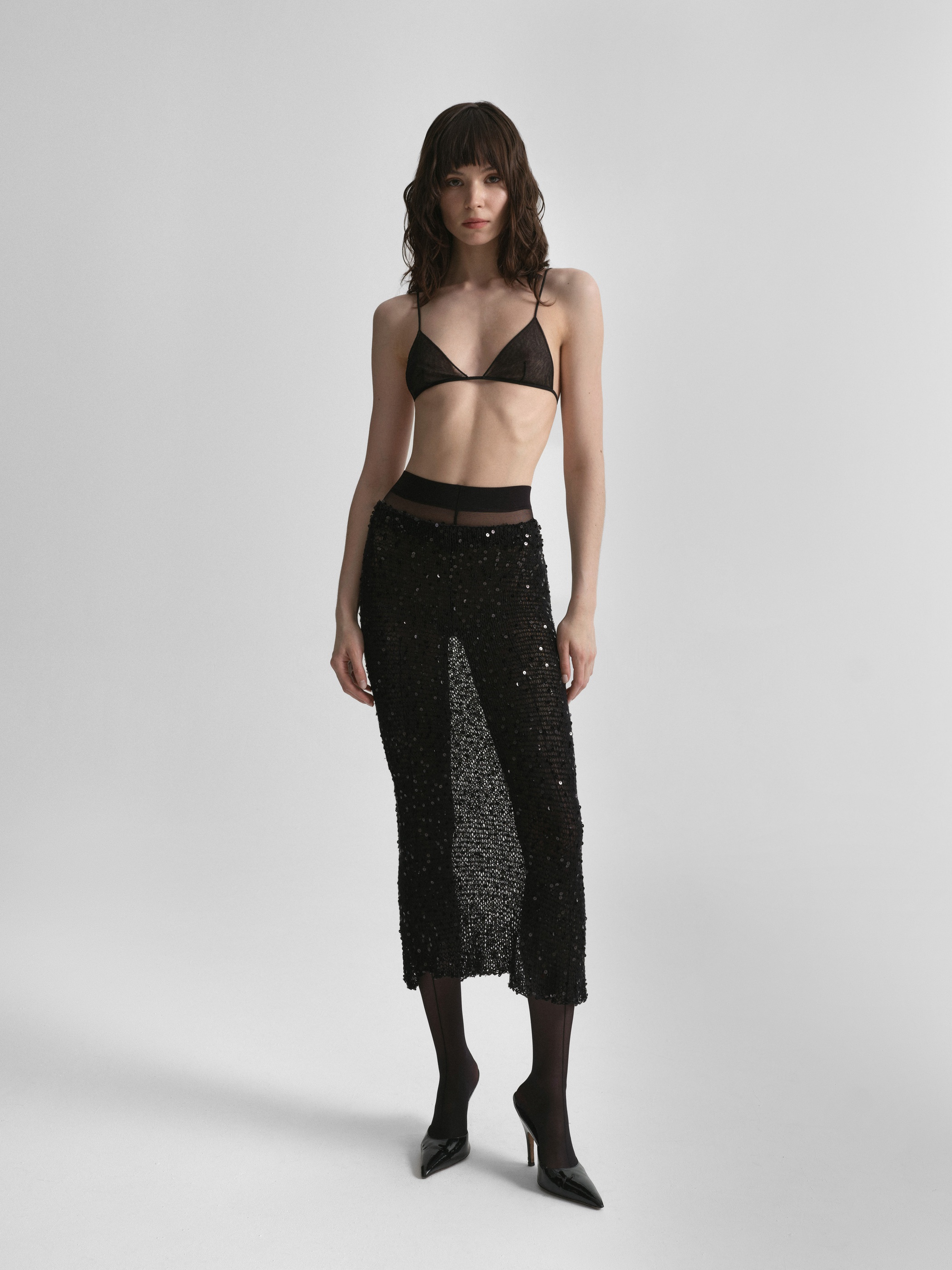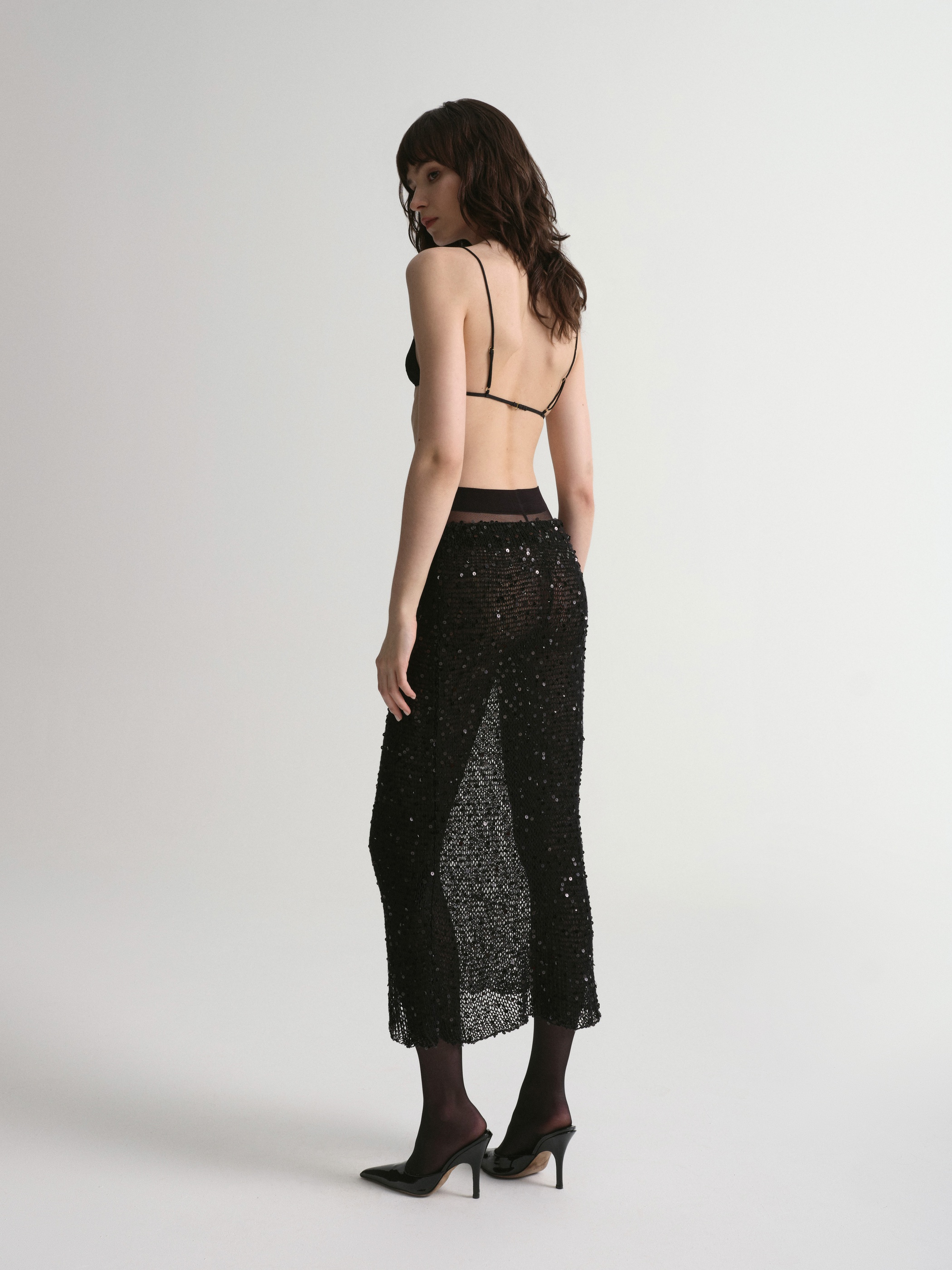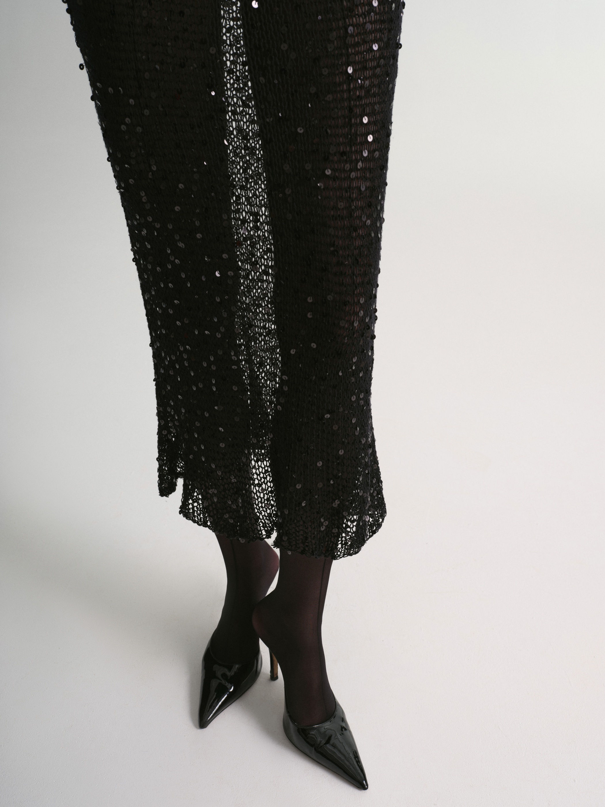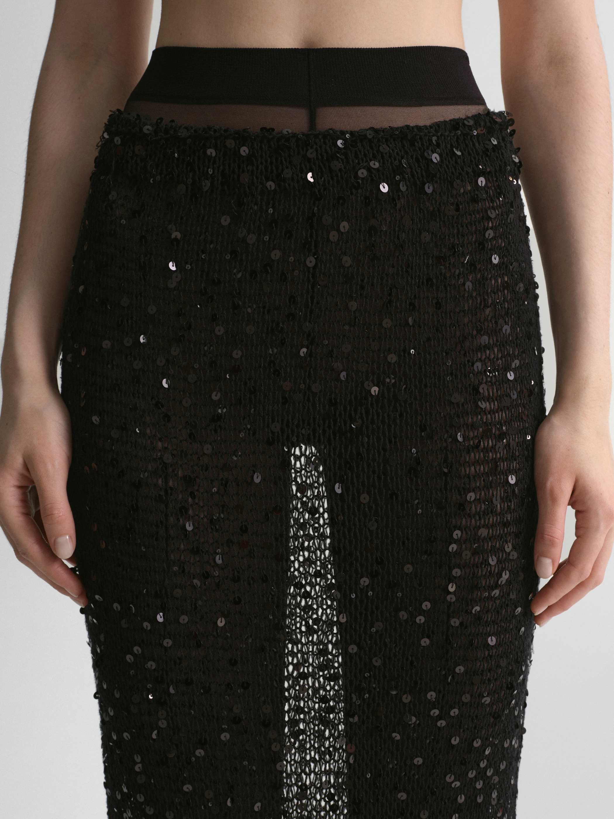 Юбка миди воздушной вязки с пайетками — стильное решение для любого образа. Средняя посадка, прямой крой и эластичный пояс обеспечивают комфорт, а пайетки на внешней стороне добавляют блеска. Идеально сочетается с лонгсливом из новой коллекции.