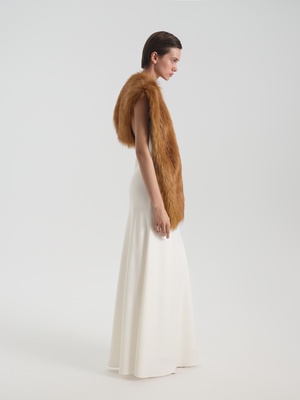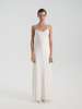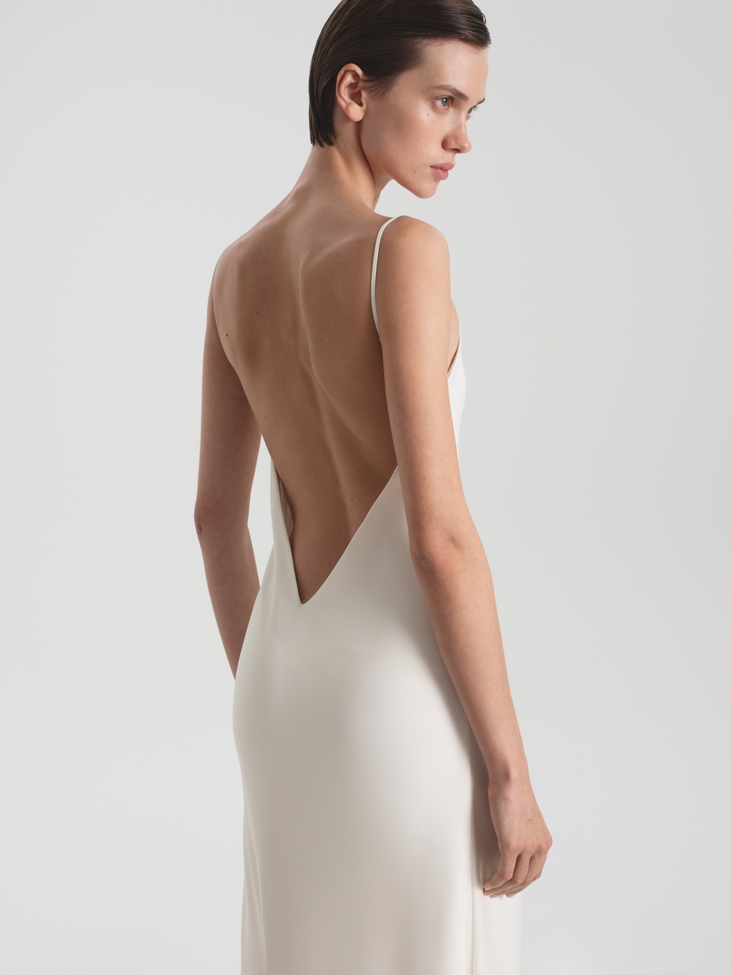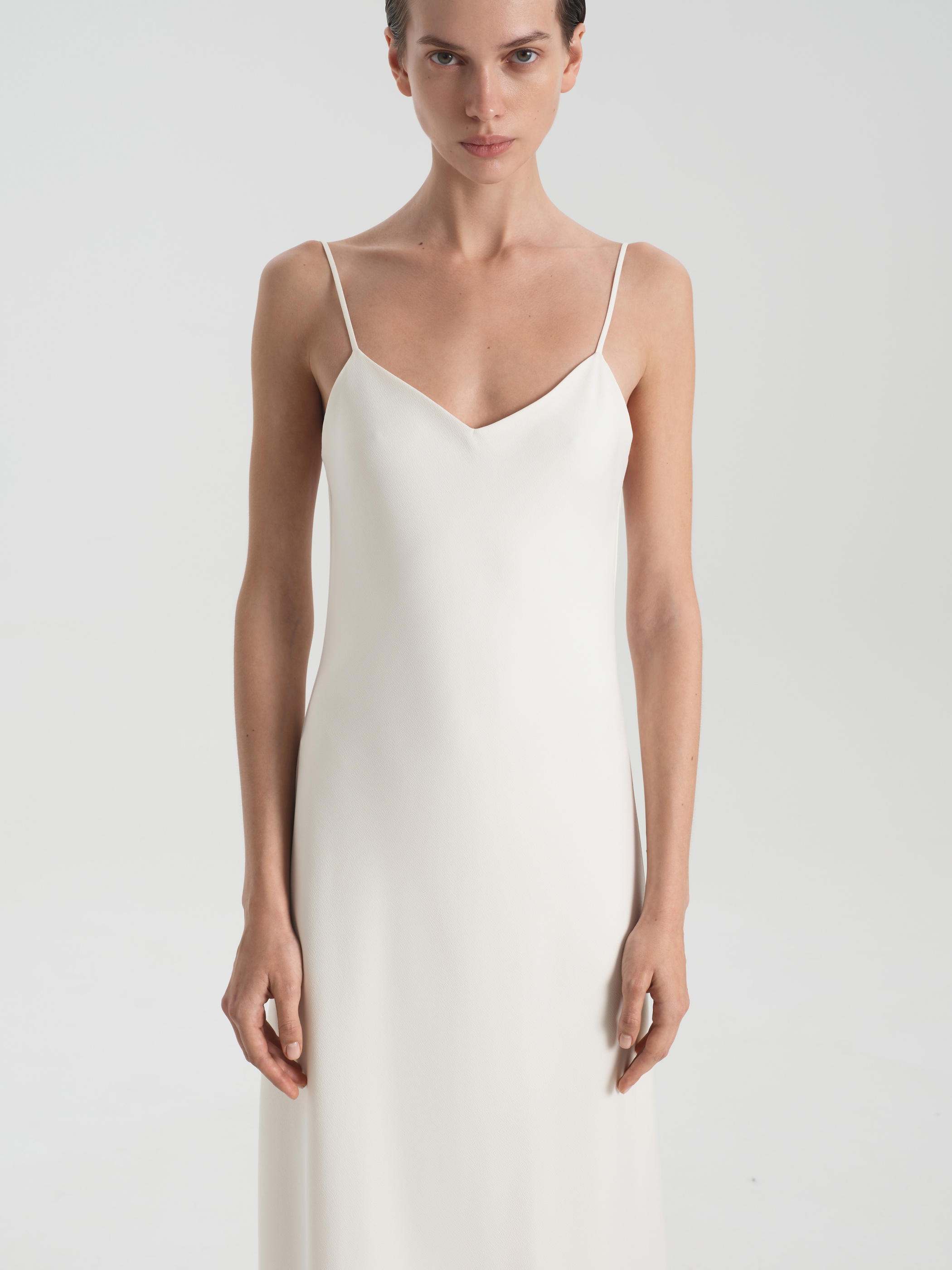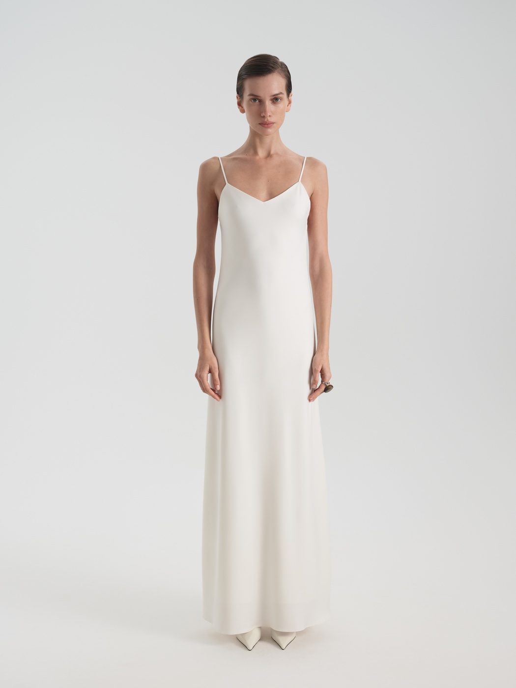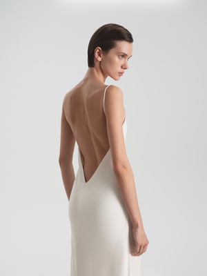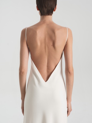 Приталенная комбинация в длине макси выполнена из струящейся ткани с легким блеском. Изделие дополнено эффектным глубоким V-образным декольте и вырезом по спинке. Такая модель станет как минималистичным праздничным образом, так и повседневным решением.