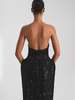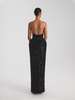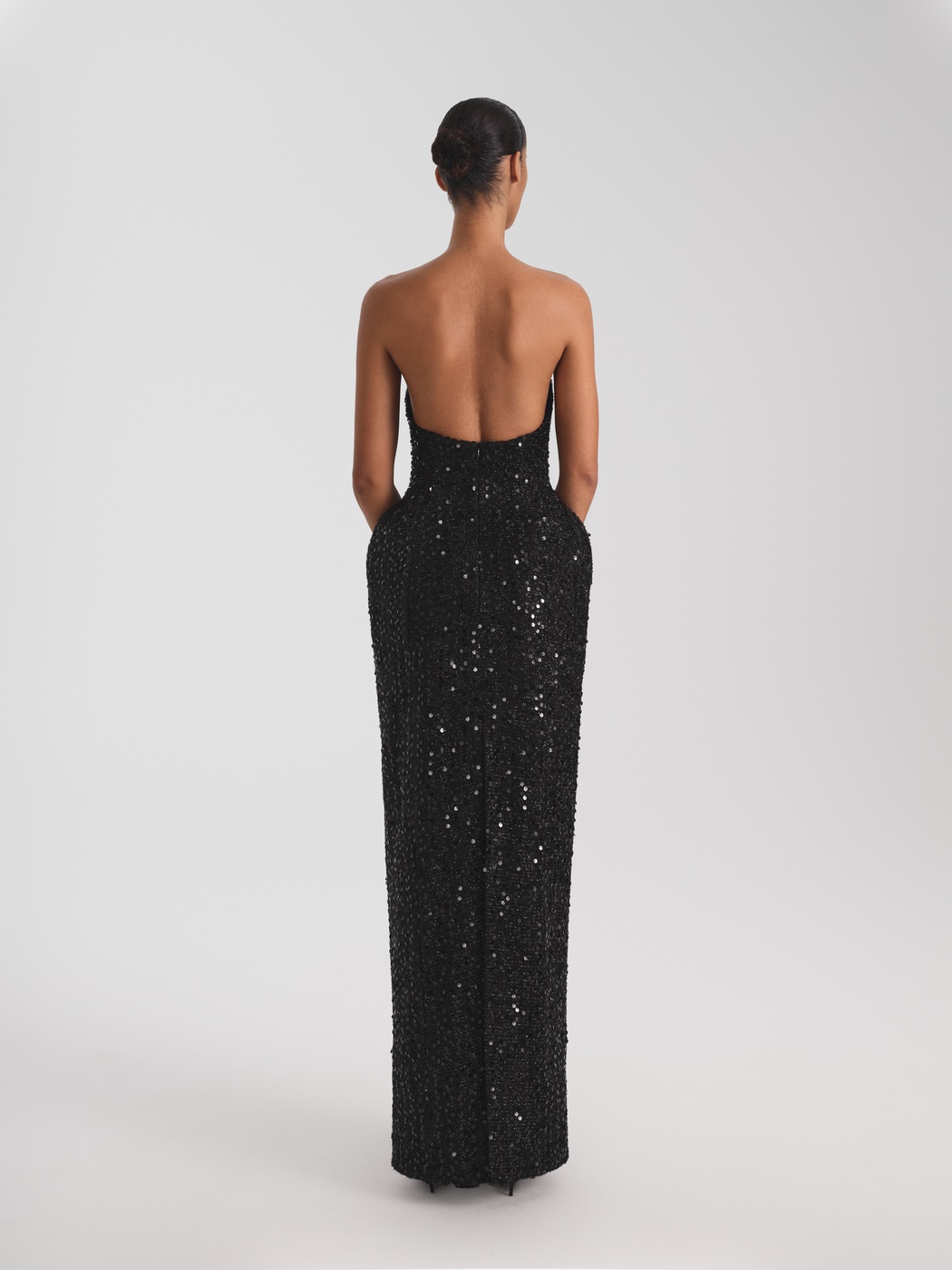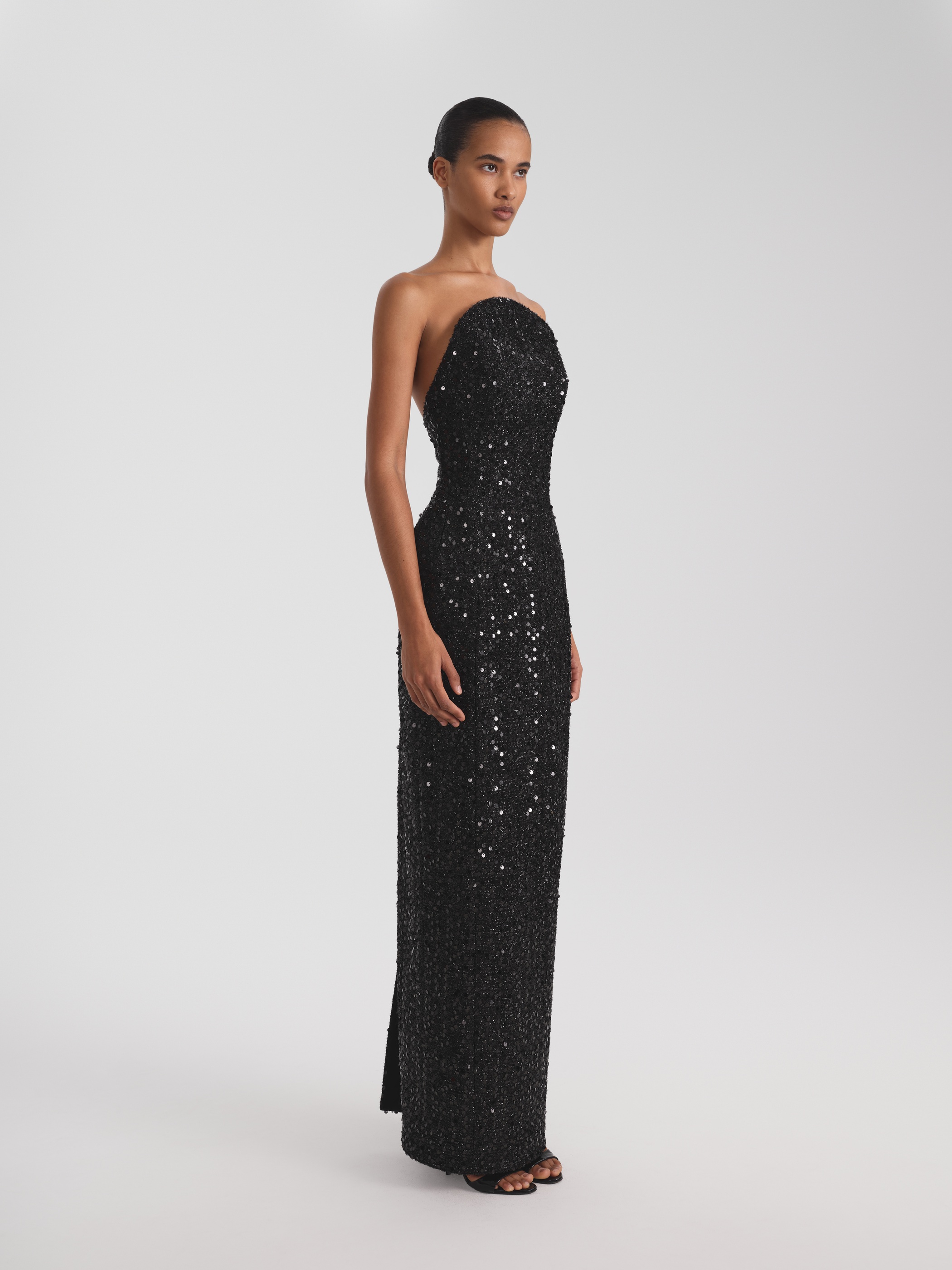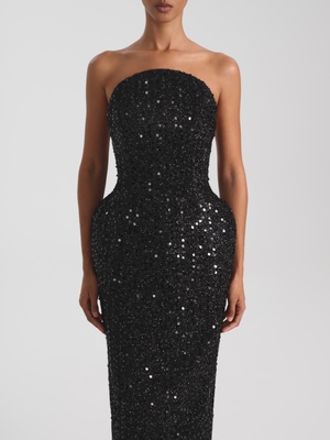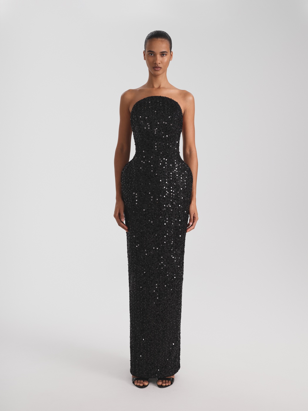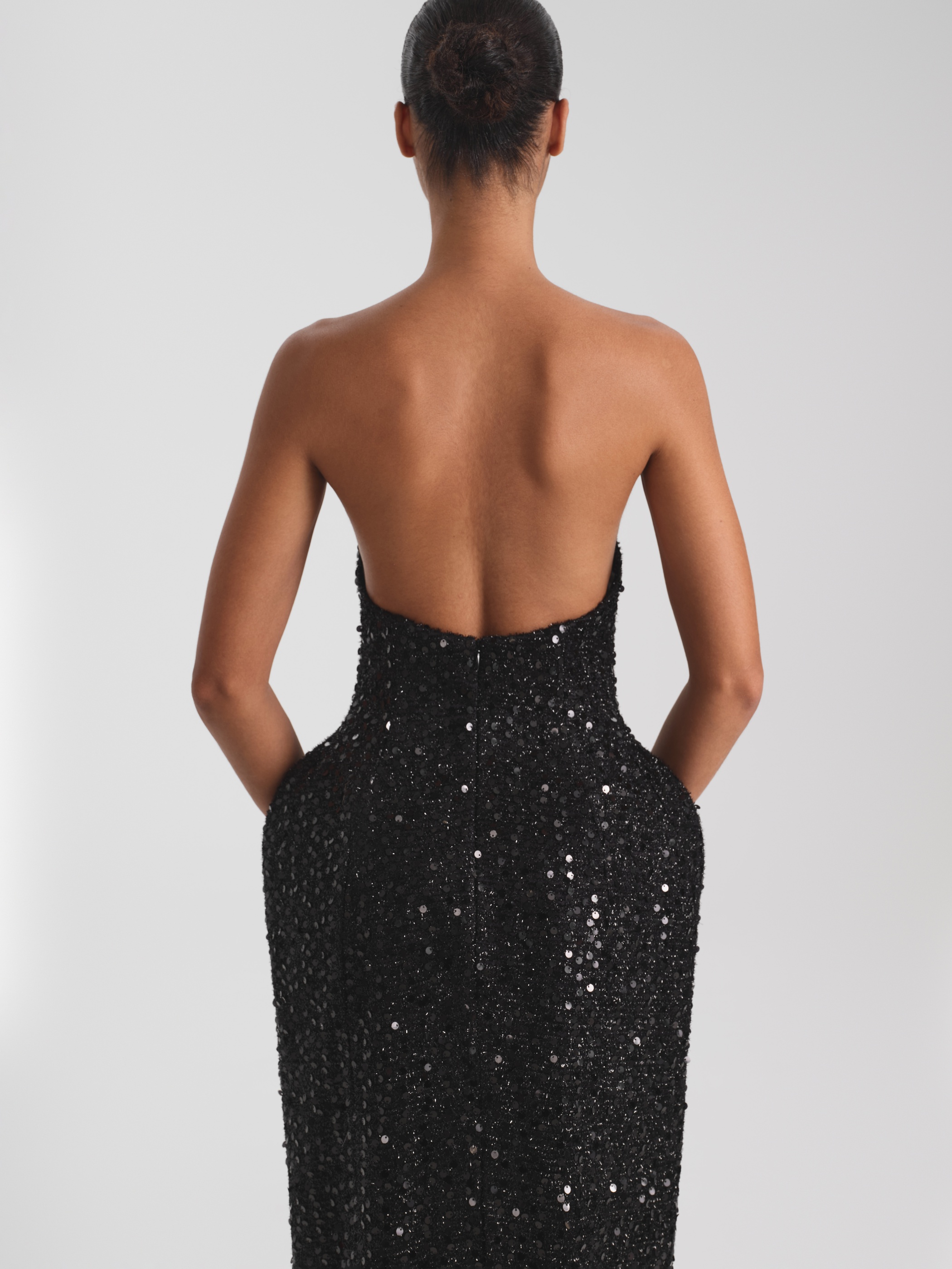 Платье макси из ткани с равномерным блеском пайеток, отражающим свет и создающим благородный блеск. Верхняя часть платья — корсетный лиф, ставший каноническим для Namelazz. Для моделирования фигуры в корсетный лиф добавлены рельефы из регилина и вытачки.