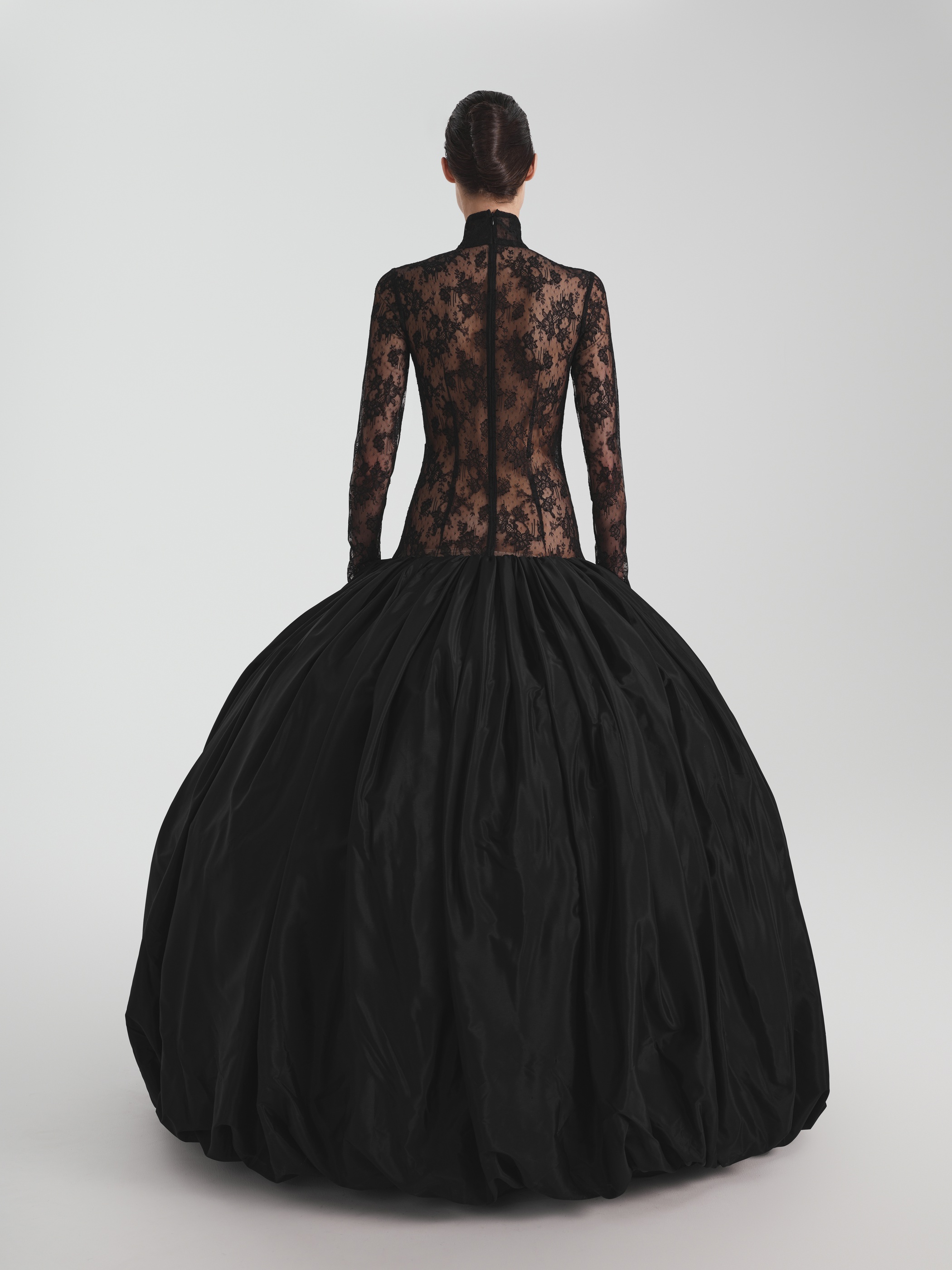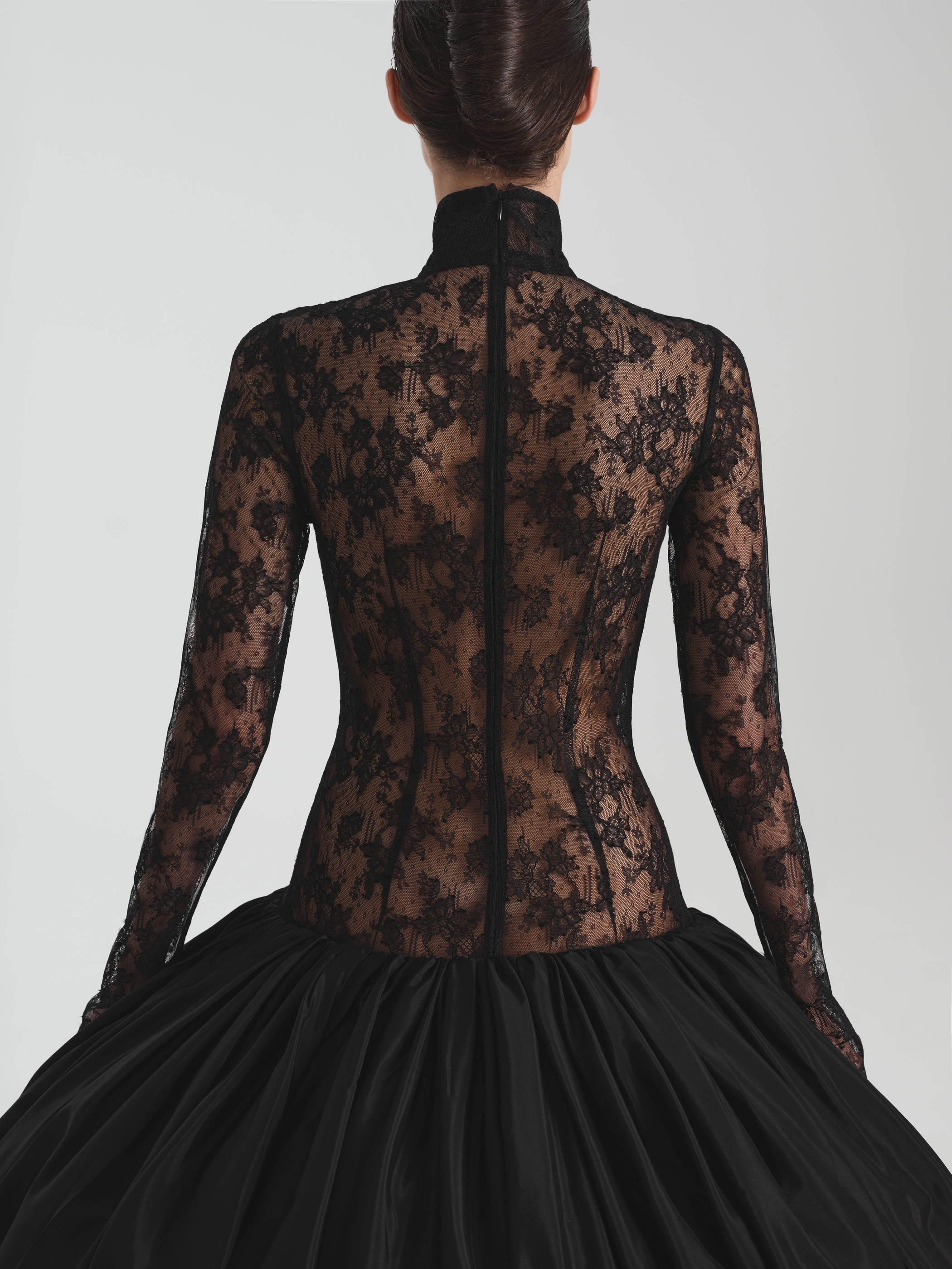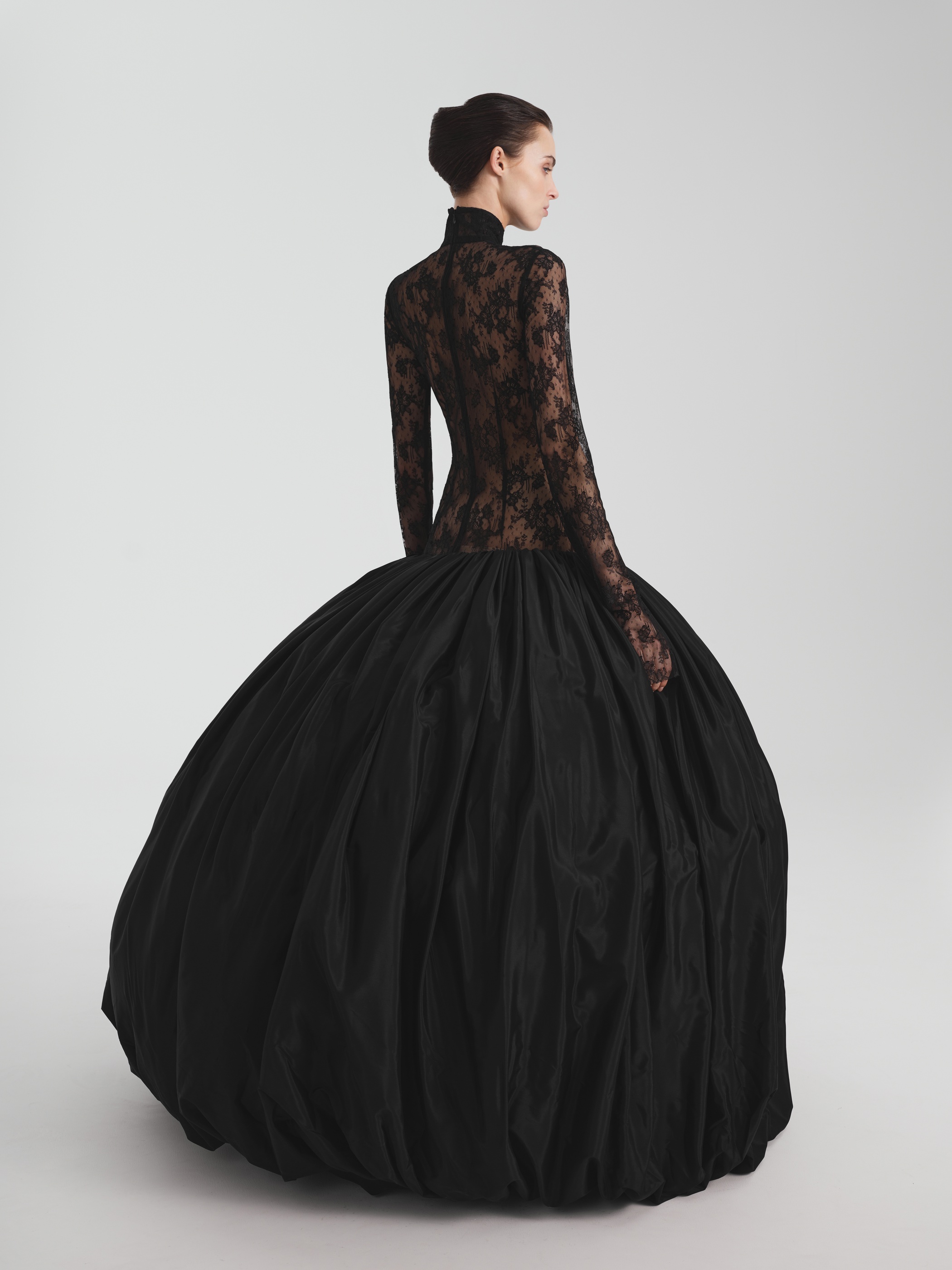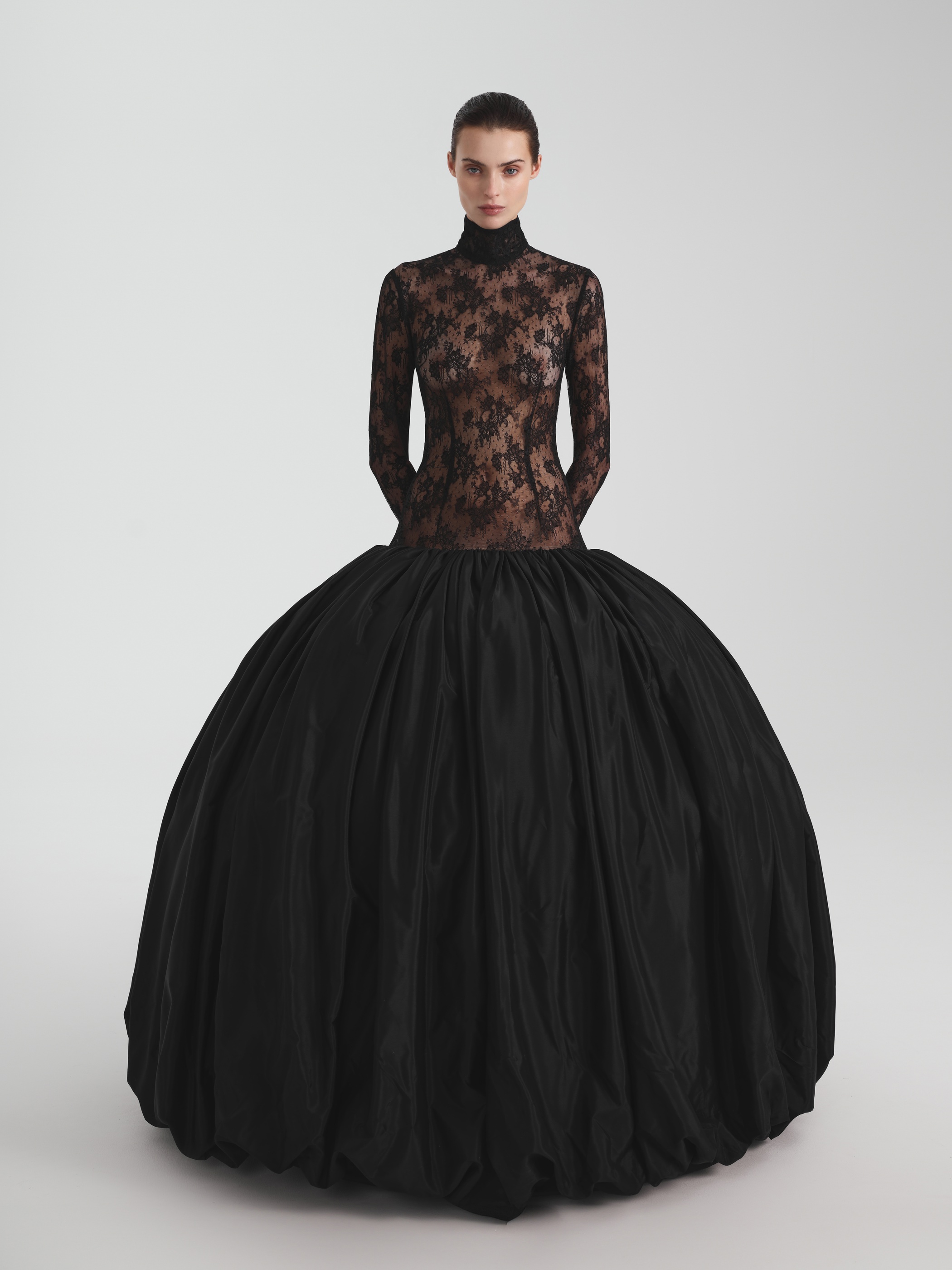 Платье построено на архитектурном контрасте: прилегающего верха и объемной юбки. Верх из прозрачного кружева с высоким воротником-стойкой и длинными рукавами подчеркивает силуэт. Юбка из плотной гладкой ткани расширяется от притачного пояса, добавляя динамики и объёма. Застежка — потайная молния по среднему шву спинки — сохраняет целостность дизайна.