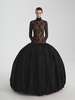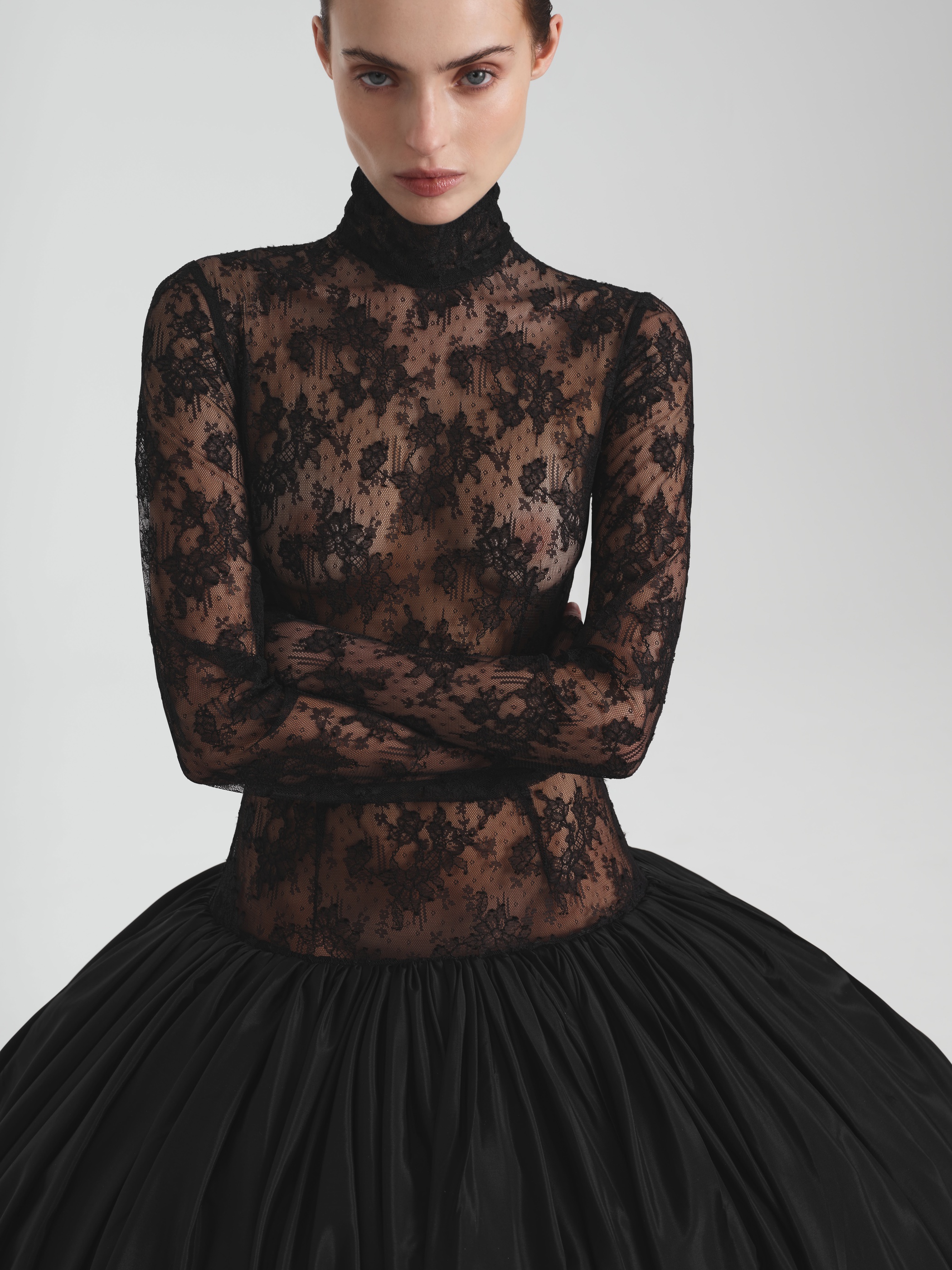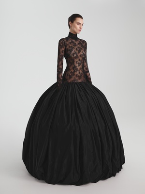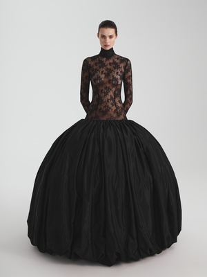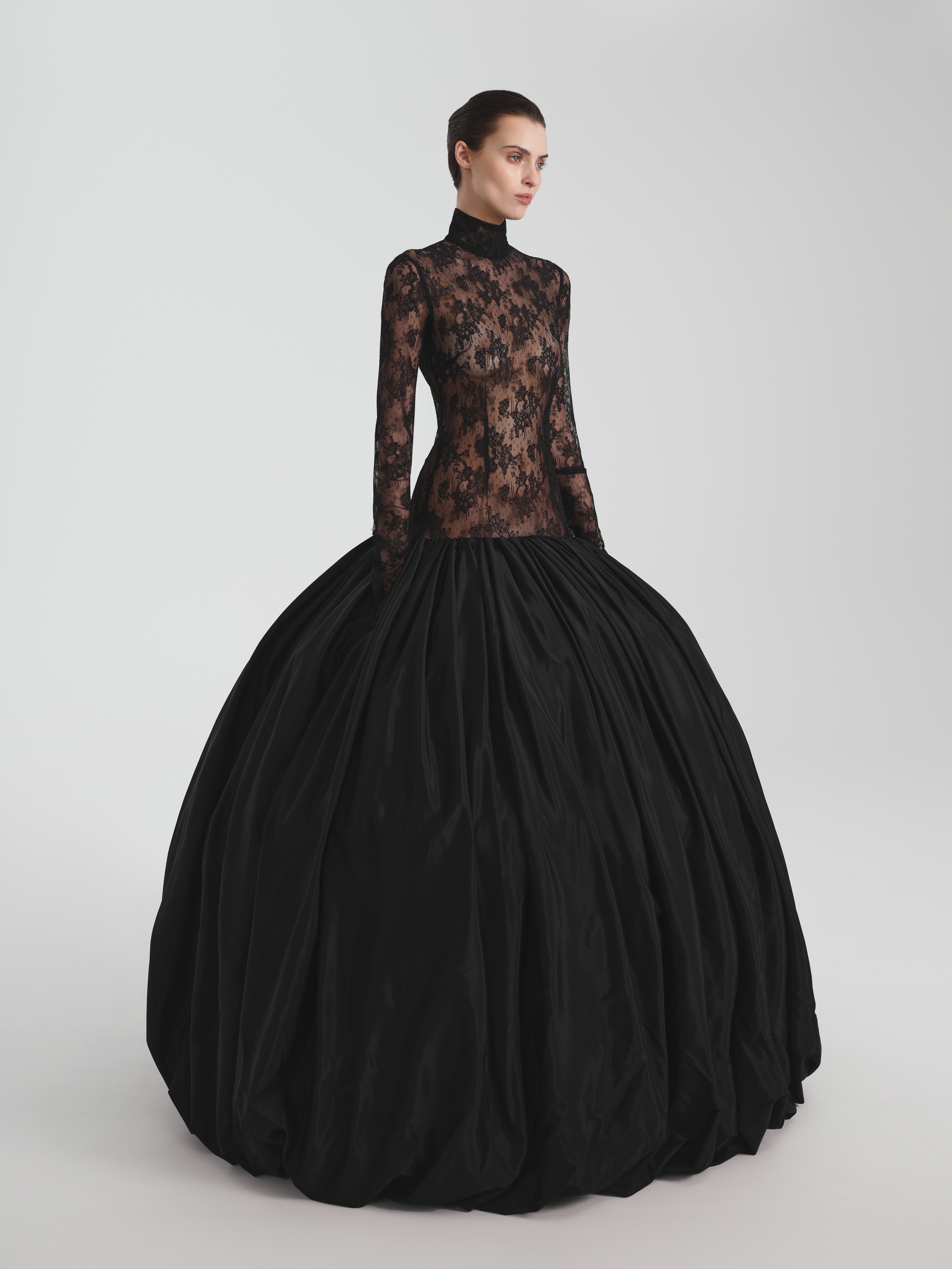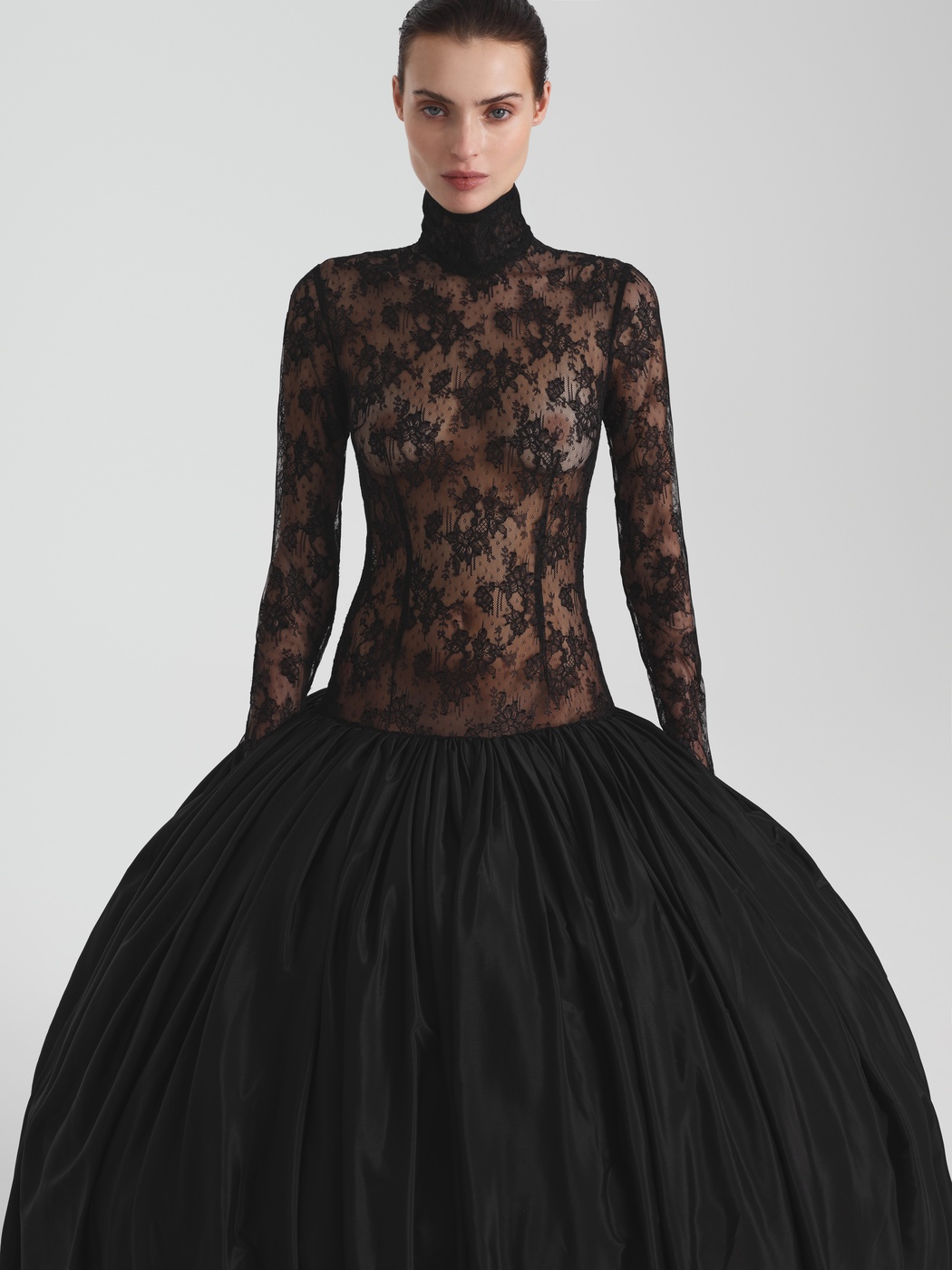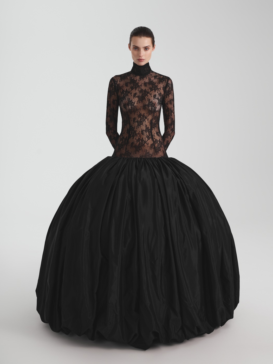 Платье построено на архитектурном контрасте: прилегающего верха и объемной юбки. Верх из прозрачного кружева с высоким воротником-стойкой и длинными рукавами подчеркивает силуэт. Юбка из плотной гладкой ткани расширяется от притачного пояса, добавляя динамики и объёма. Застежка — потайная молния по среднему шву спинки — сохраняет целостность дизайна.