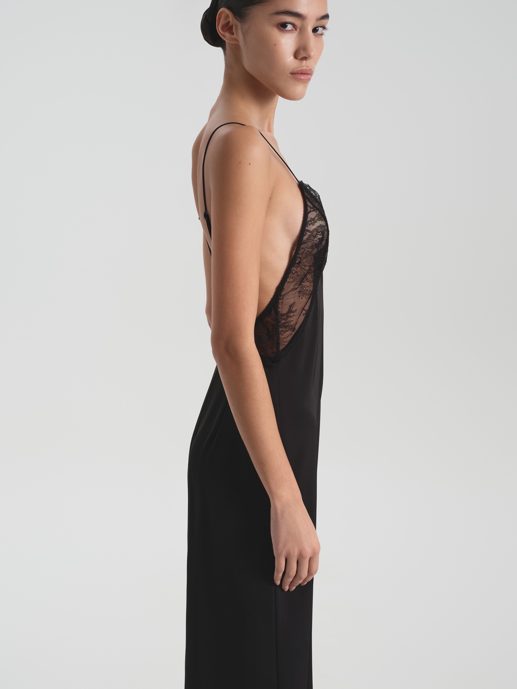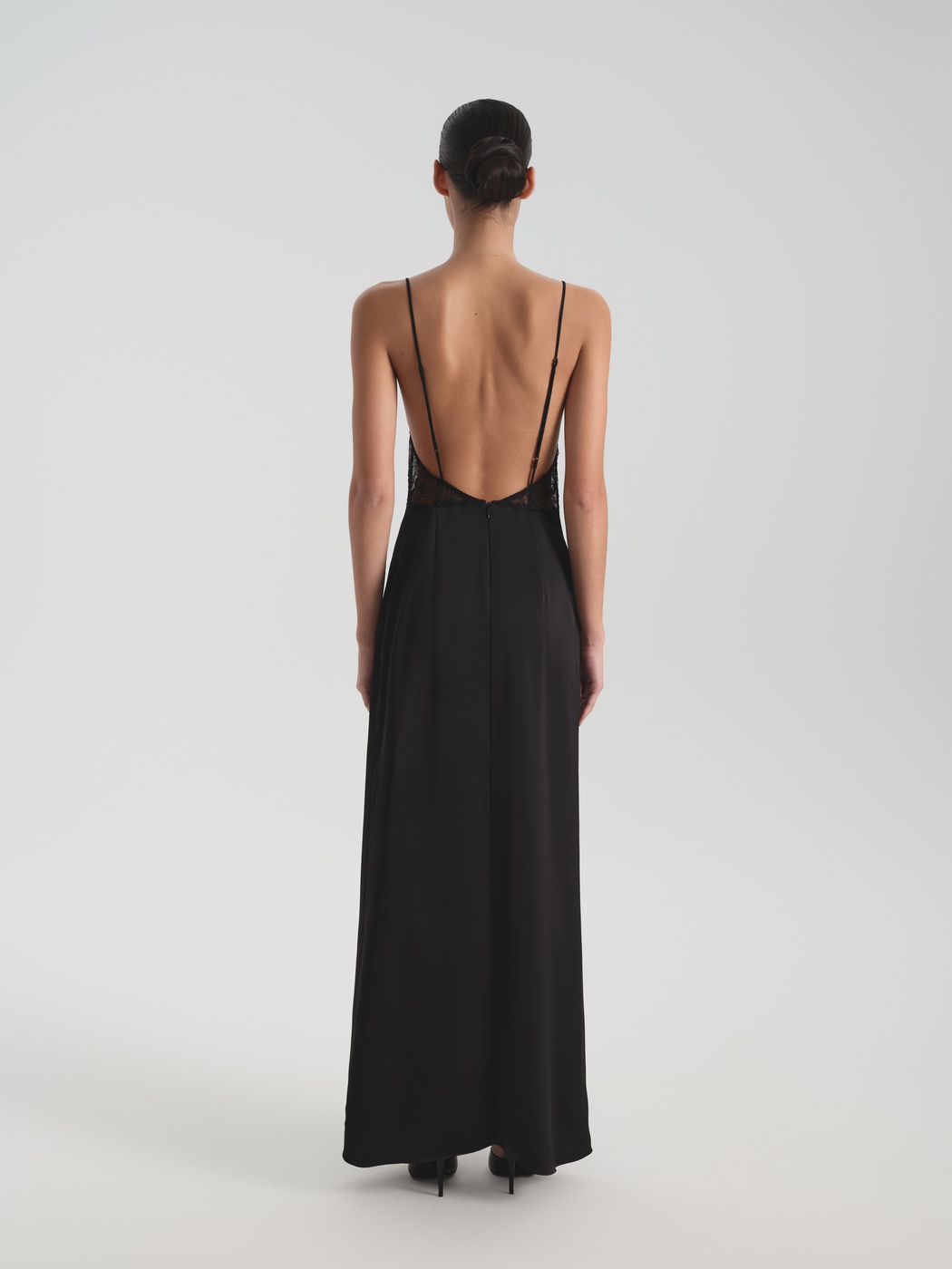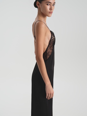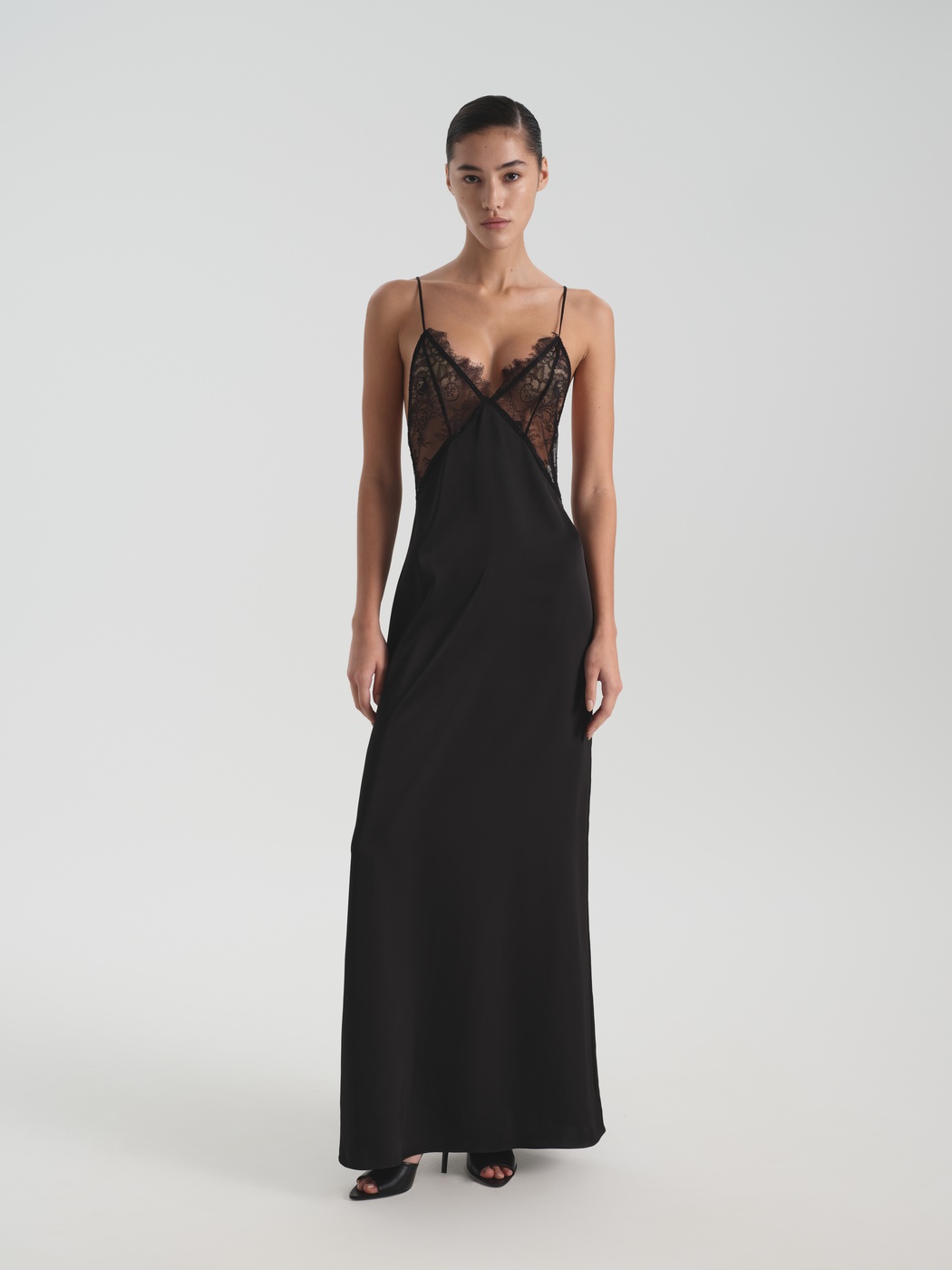 Элегантное платье-комбинация с глубоким V-образным декольте и кружевной вставкой на лифе. Модель подчеркивает фигуру благодаря прилегающему силуэту и длине до пола. Изделие выполнено из качественного материала, приятного к телу. Платье станет идеальным выбором для особенных случаев.