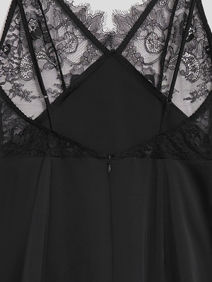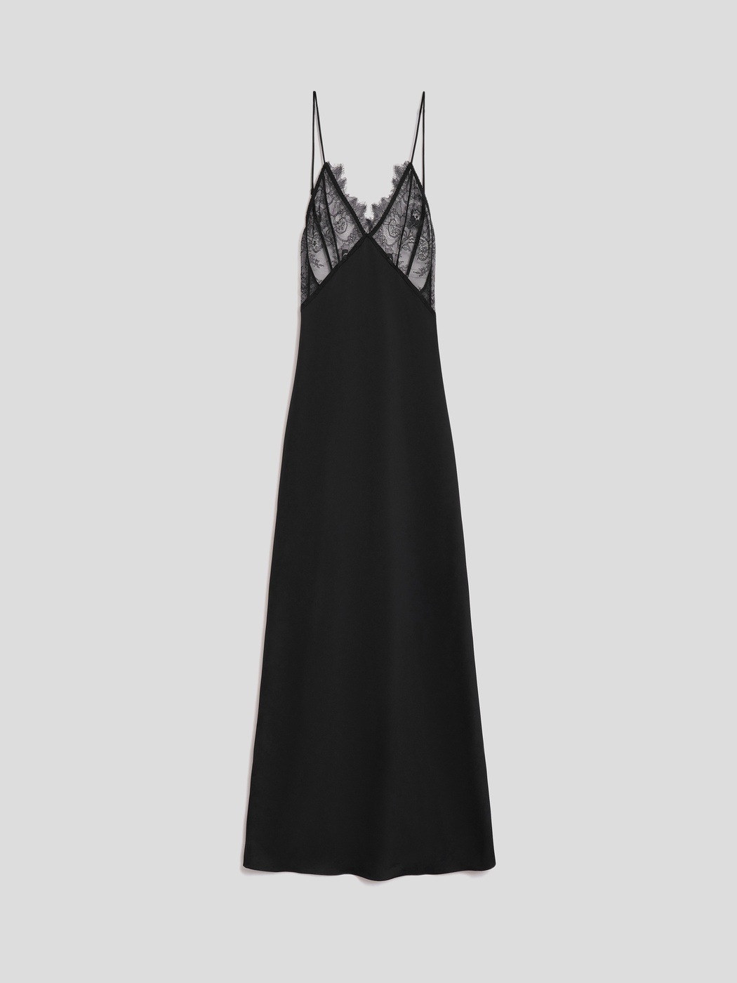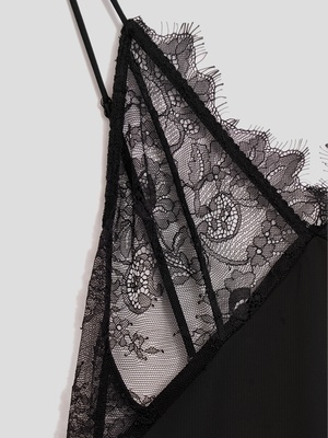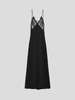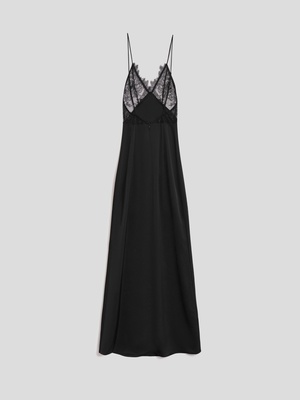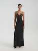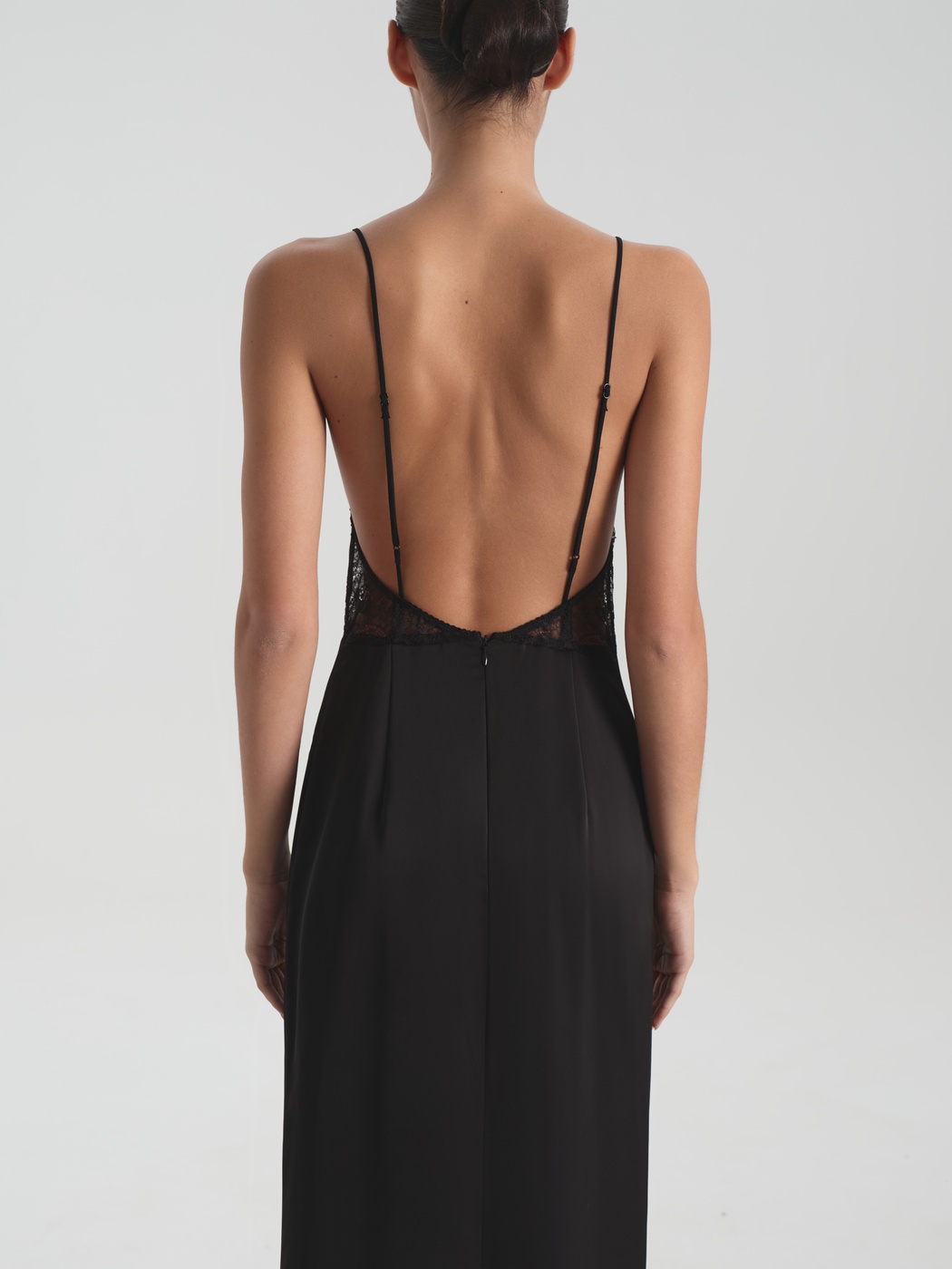 Элегантное платье-комбинация с глубоким V-образным декольте и кружевной вставкой на лифе. Модель подчеркивает фигуру благодаря прилегающему силуэту и длине до пола. Изделие выполнено из качественного материала, приятного к телу. Платье станет идеальным выбором для особенных случаев.