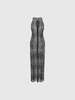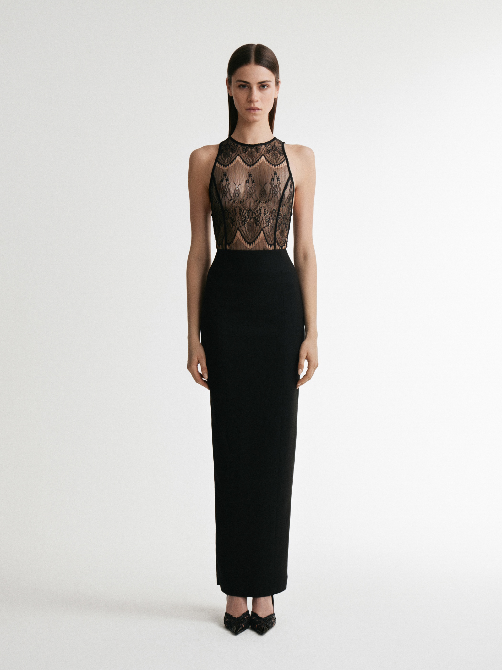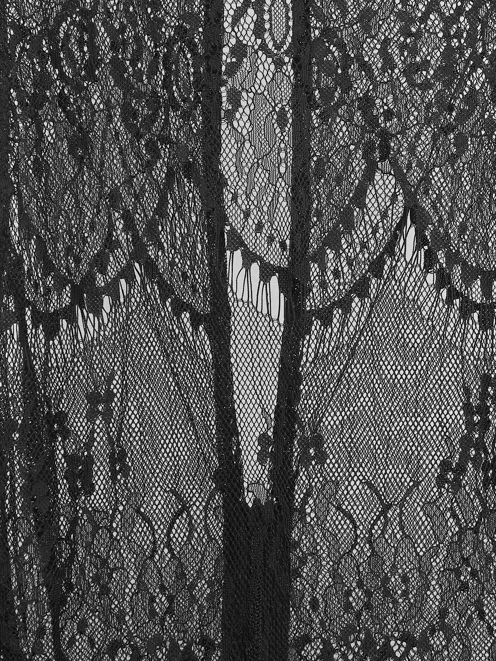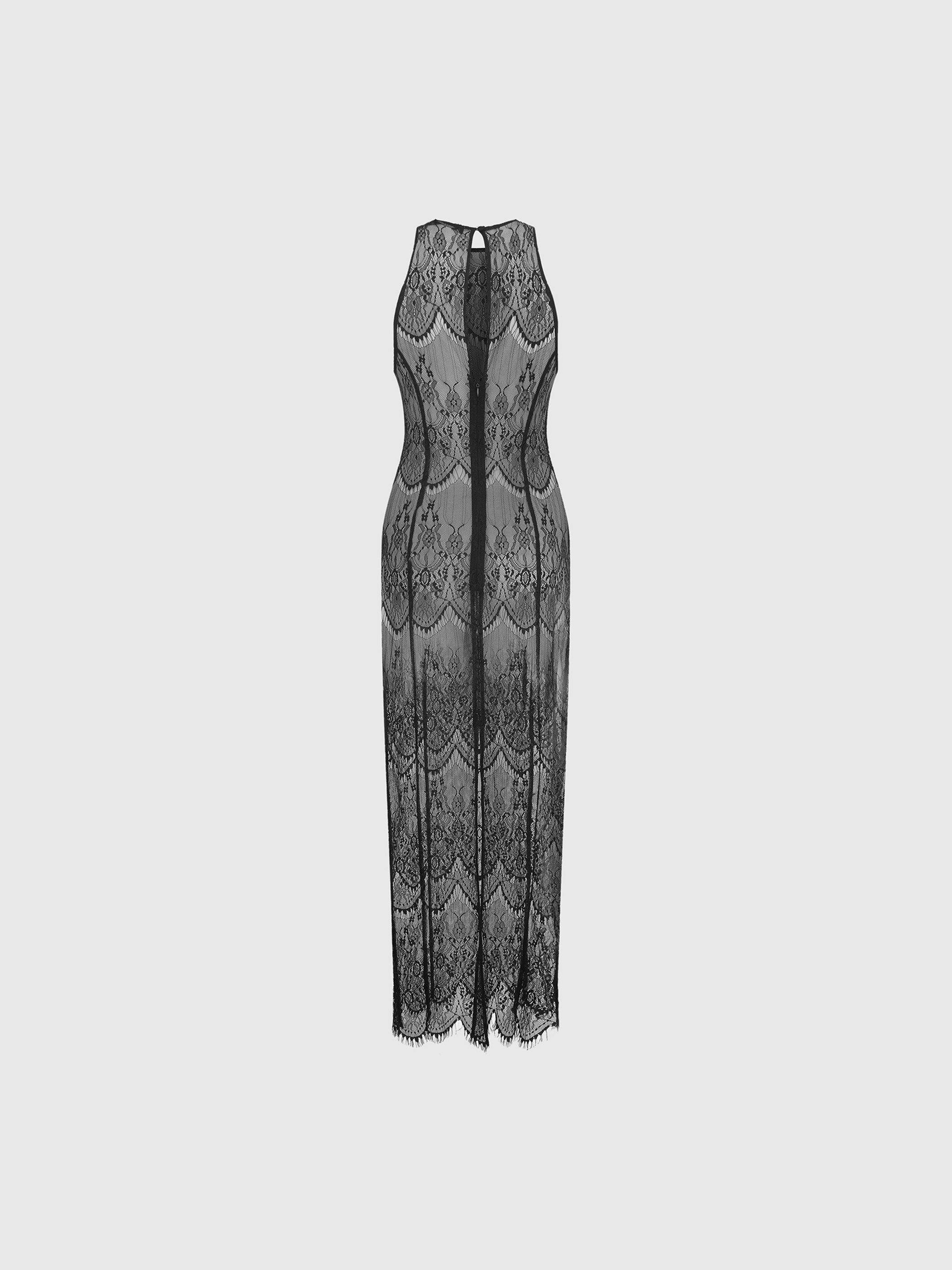 Платье макси прилегающего силуэта с американской проймой сочетает прозрачность и утонченность. Узоры черного кружева, декоративные фестоны, прозрачность делают платье идеальным для многослойных образов, подчеркивая индивидуальность.