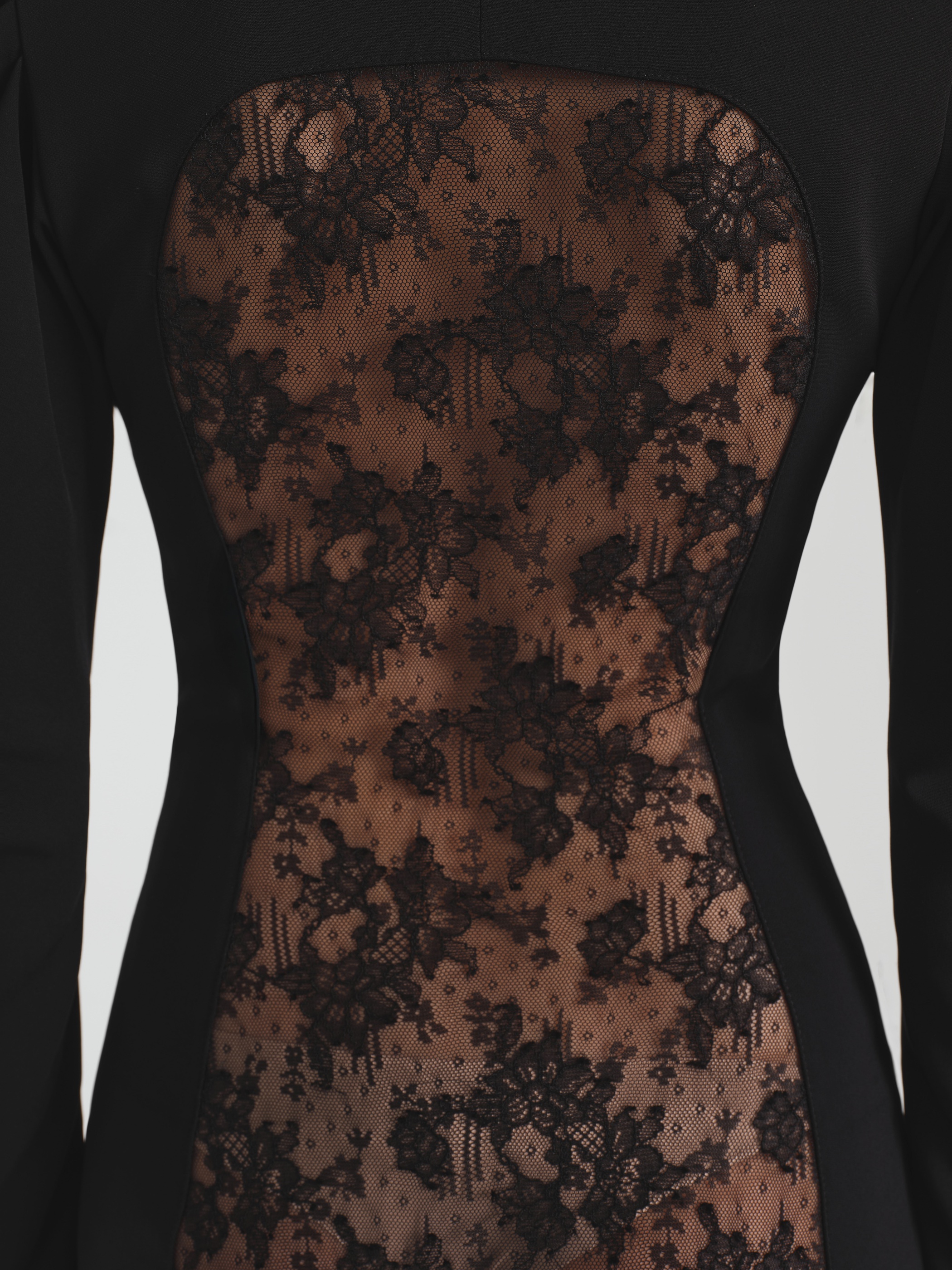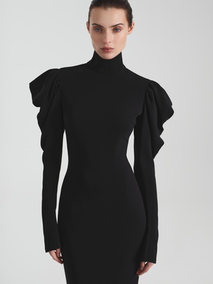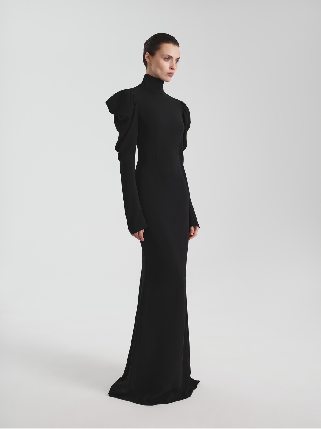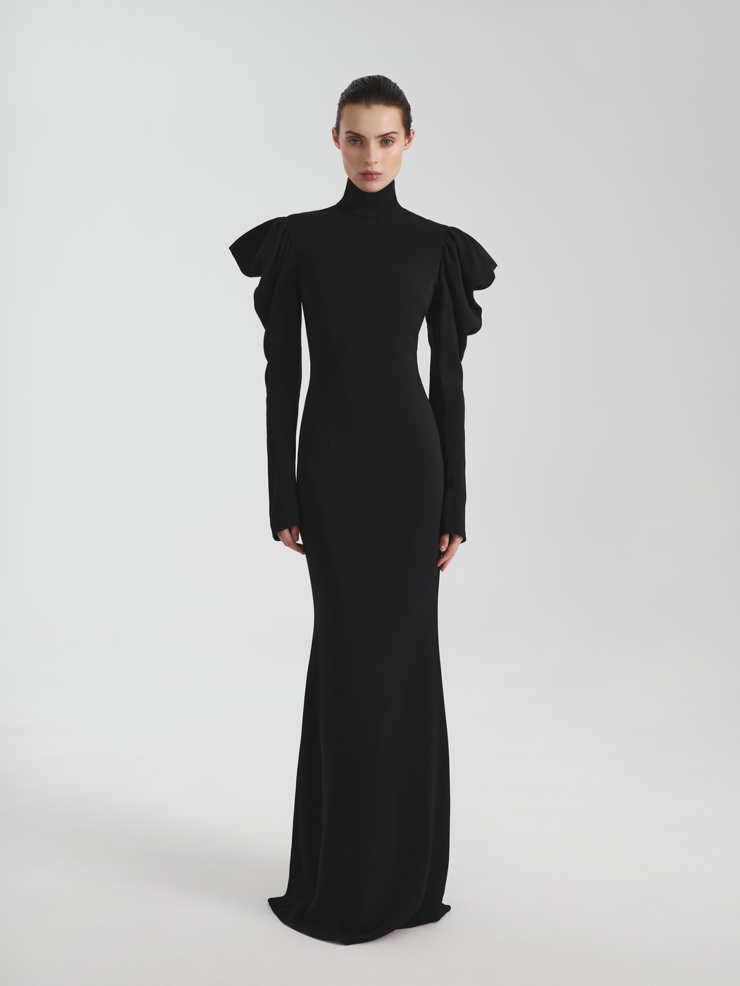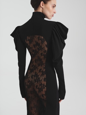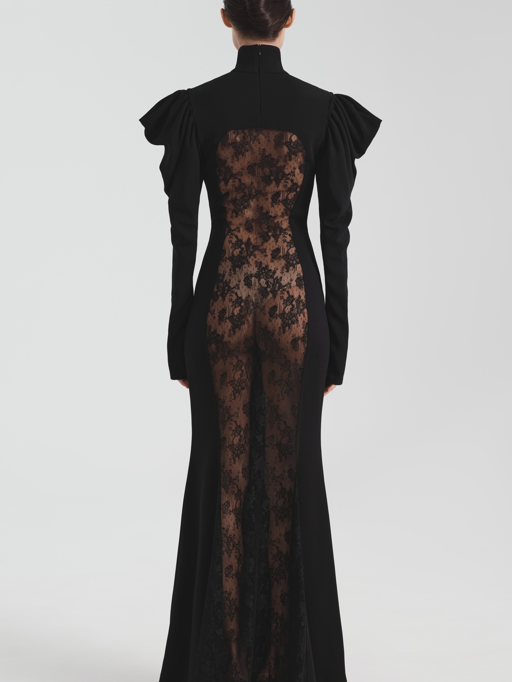 Черное платье макси с высоким воротником и объемными рукавами — элегантность, подчеркнутая деталями. Спинка украшена кружевной вставкой до пола, которая добавляет образу особого шарма. Приталенный силуэт идеально облегает фигуру, а плавное расширение юбки создает графичный силуэт. Объемные рукава добавляют театральности, сохраняя общую гармонию дизайна. Дополните образ туфлями на каблуке и минималистичными аксессуарами, чтобы подчеркнуть его роскошь и женственность.