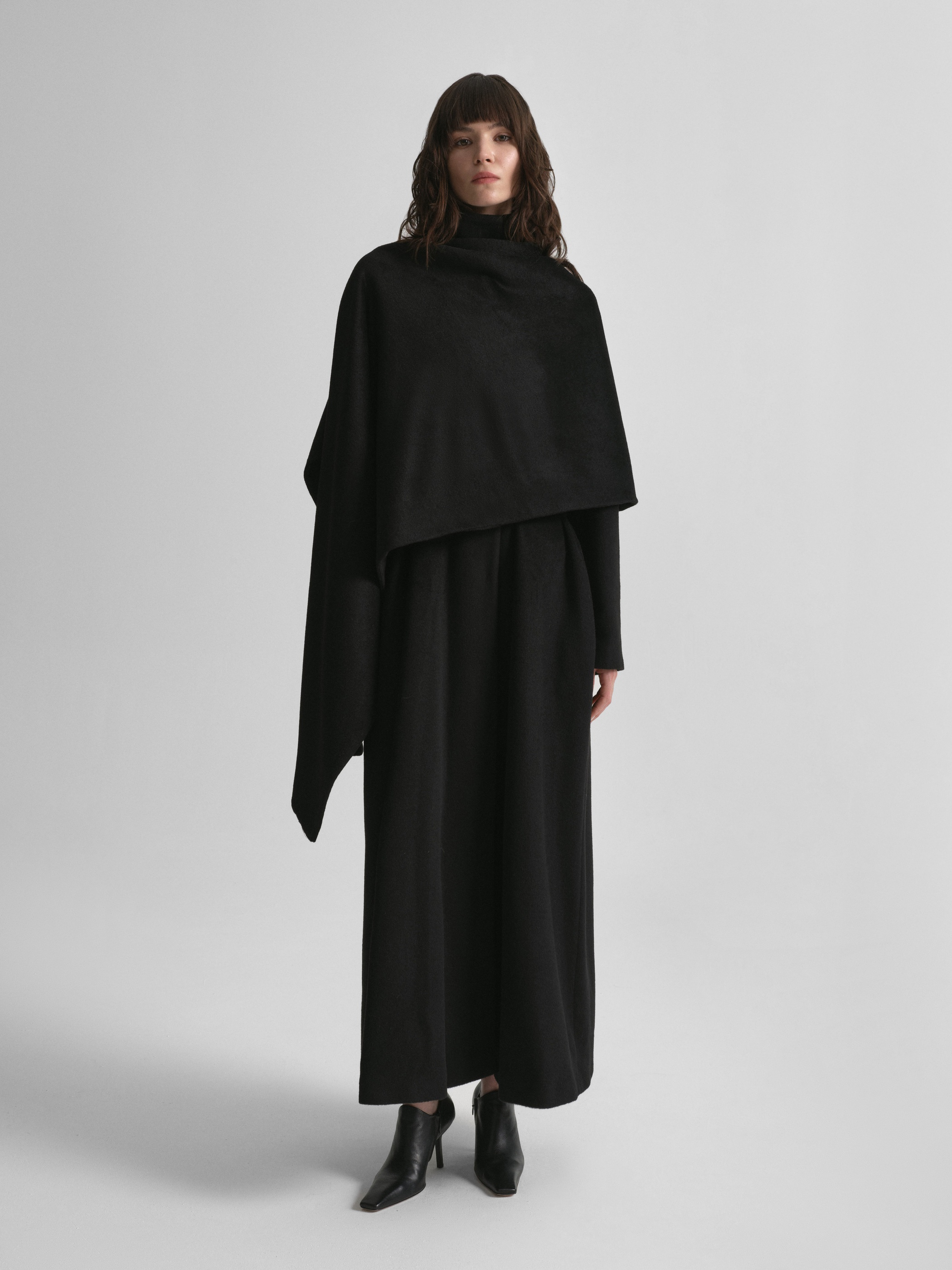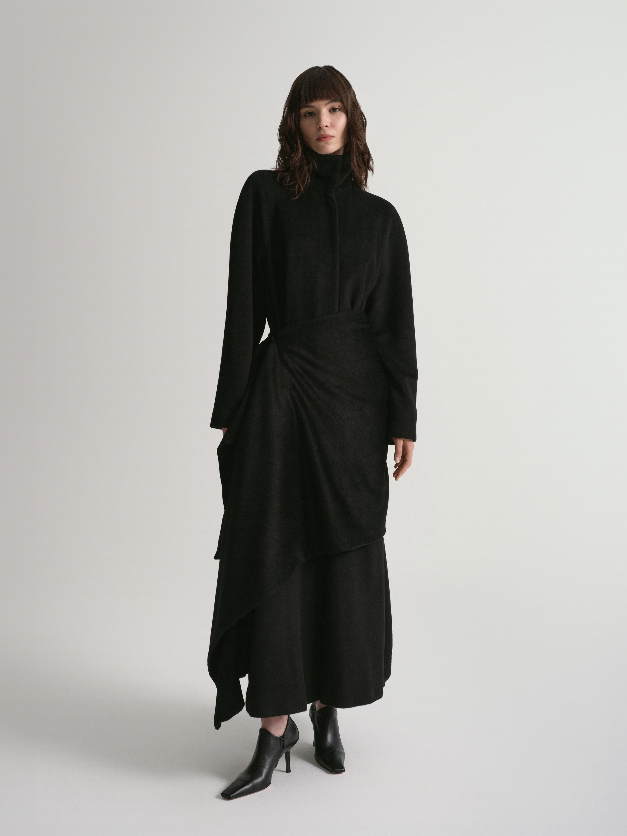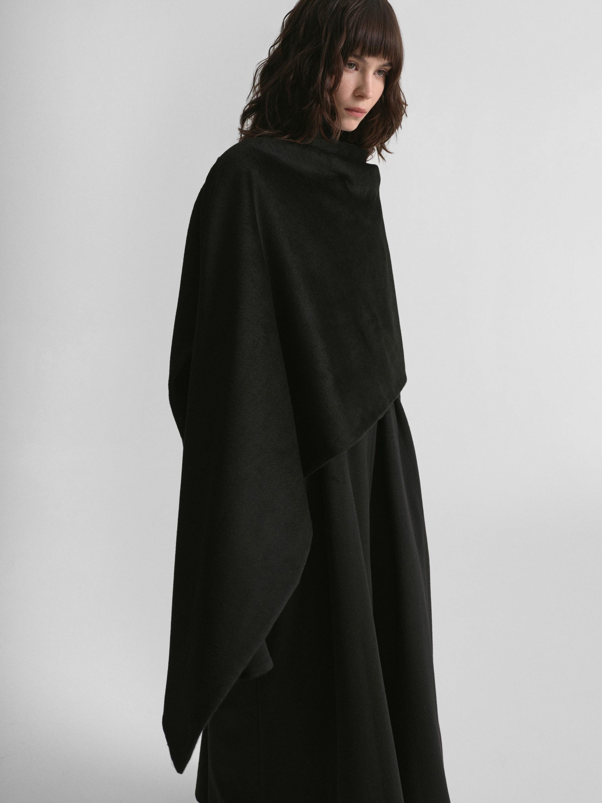 Пальто из драпа в минималистичном стиле, дополненное акцентным элементом — асимметричным разъемным шарфом. С помощью пояса можно создать приталенный силуэт.