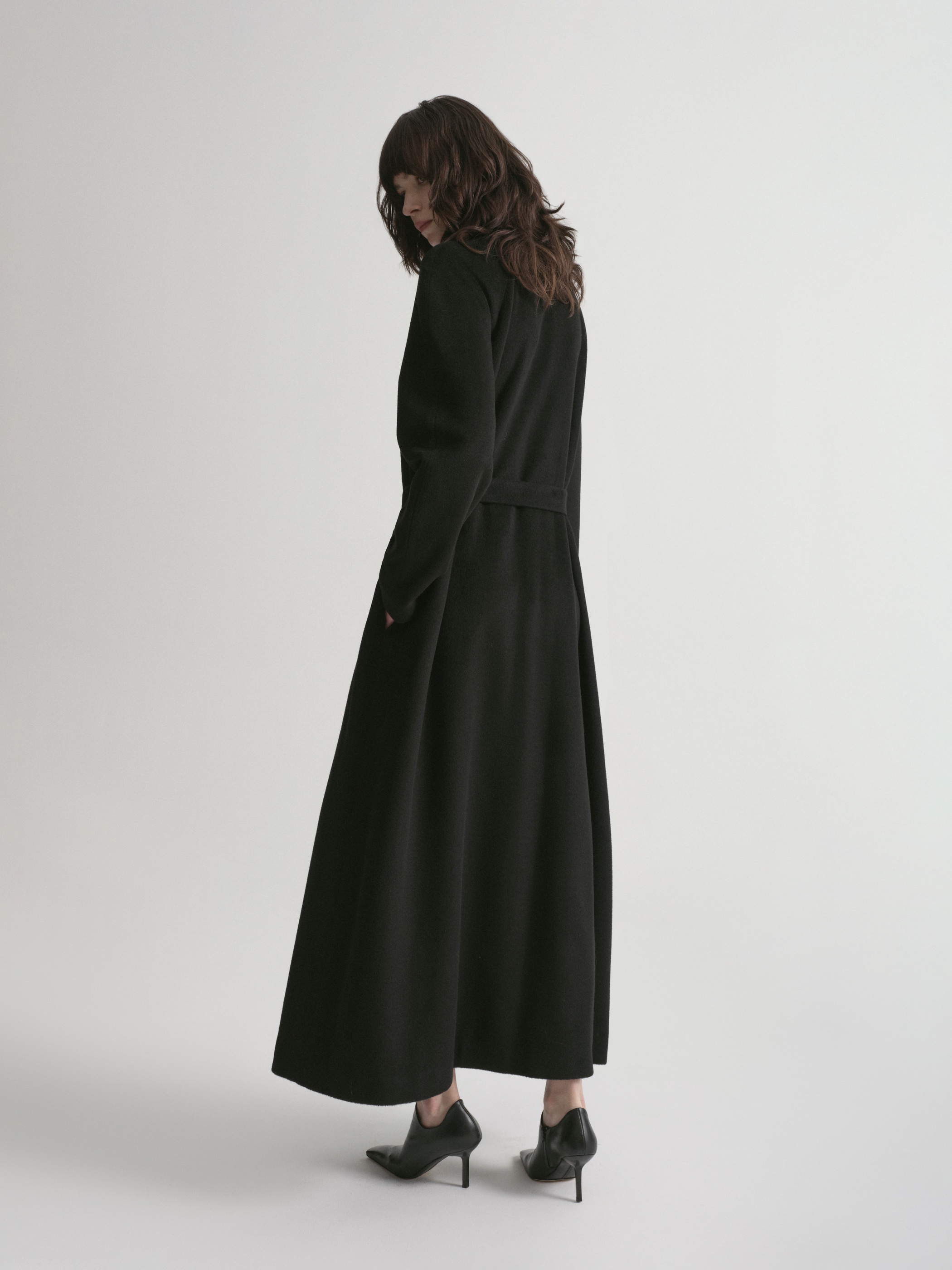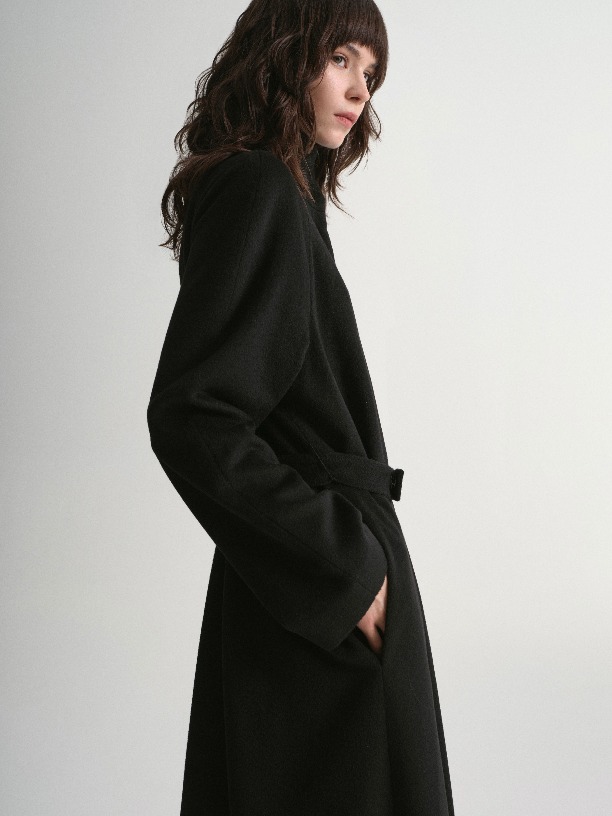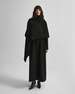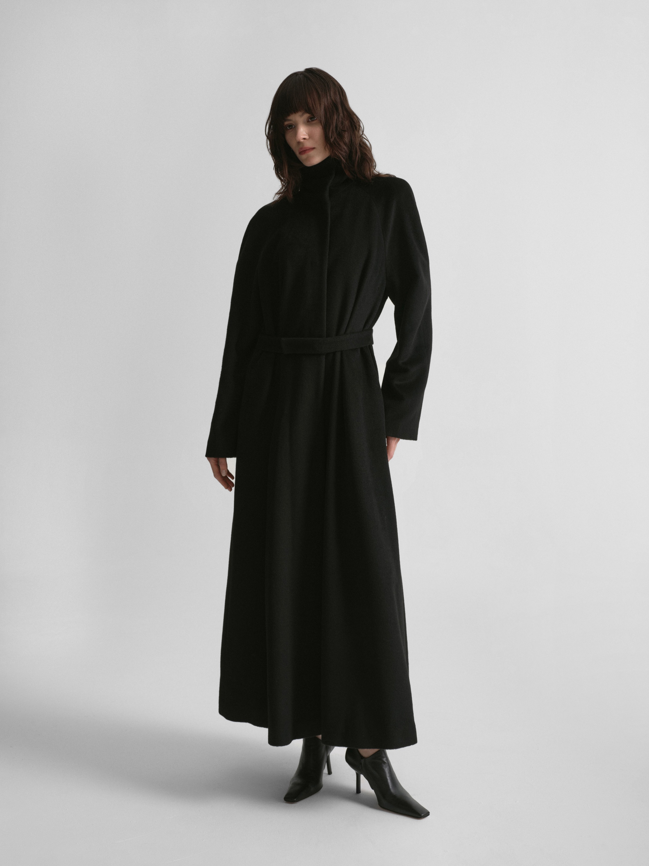 Пальто из драпа в минималистичном стиле, дополненное акцентным элементом — асимметричным разъемным шарфом. С помощью пояса можно создать приталенный силуэт.