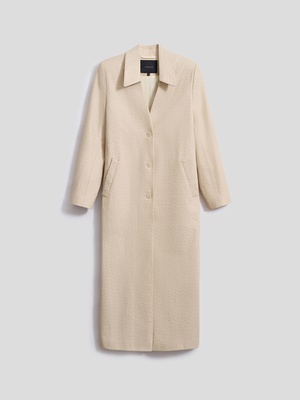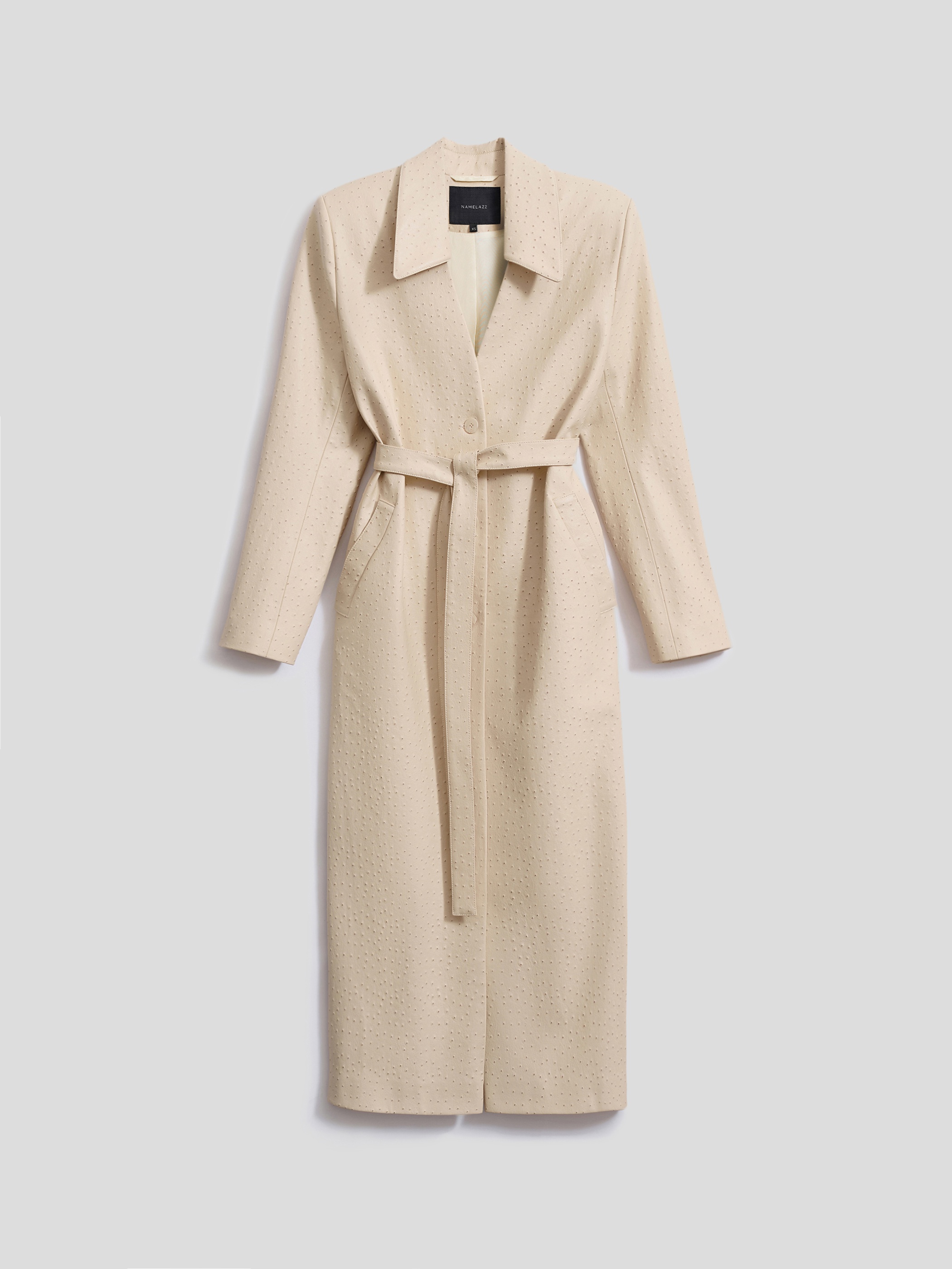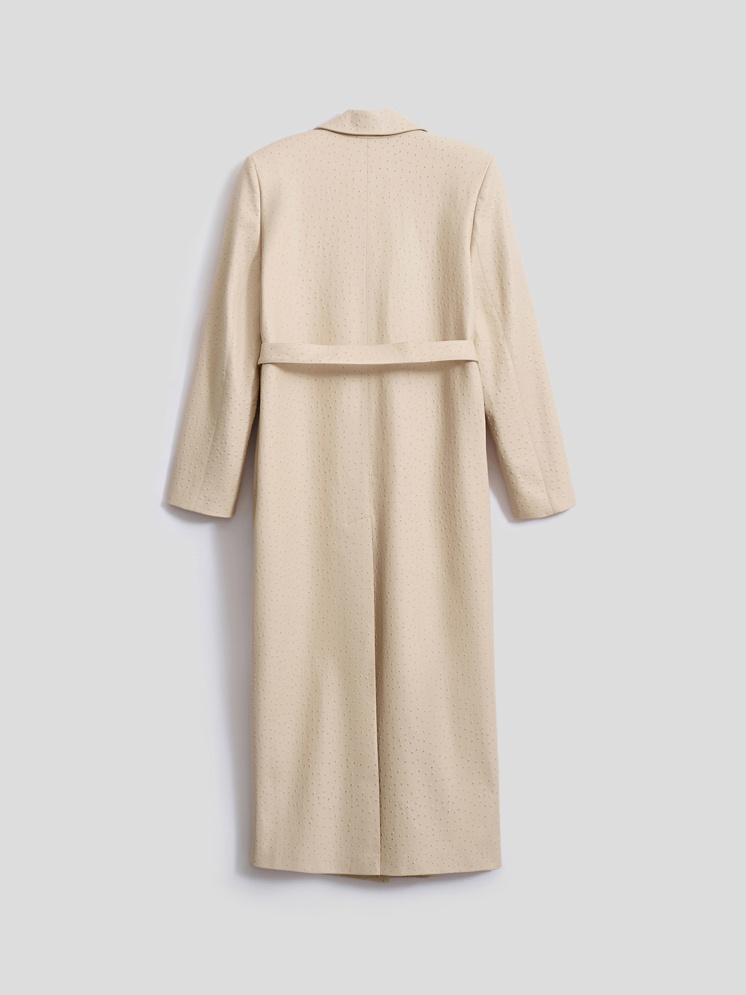 Тренч макси с тиснением под страуса — фактура, которая работает на образ без дополнительных усилий. Прямой силуэт с расширенной линией плеча и отложной воротник создают актуальную геометрию кроя. Пояс фиксирует талию, прорезные карманы с листочками добавляют функциональности. Застежка на пуговицы и петли, подкладка обеспечивает комфорт в носке. За счет выразительной фактуры тренч становится акцентом в любом образе.