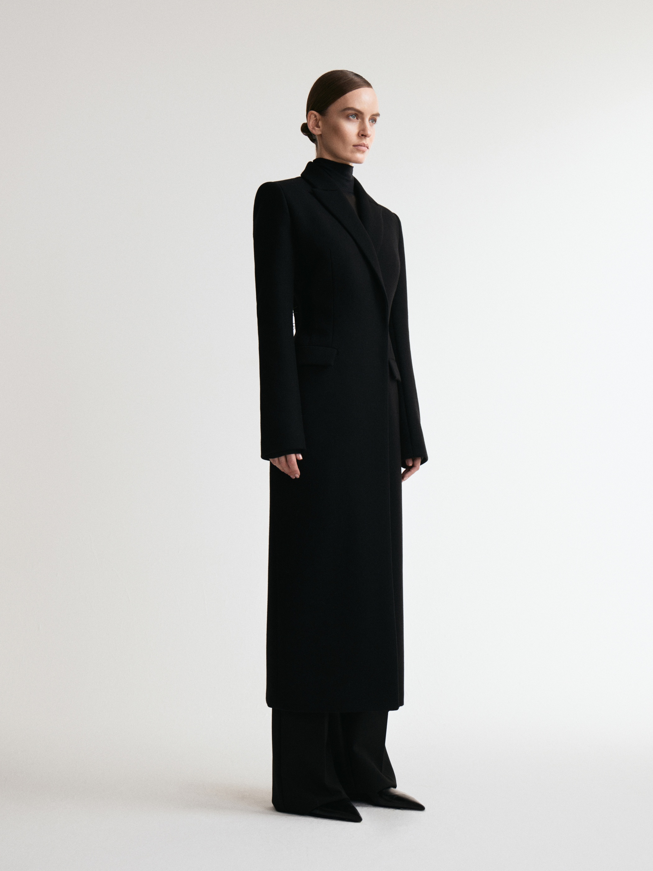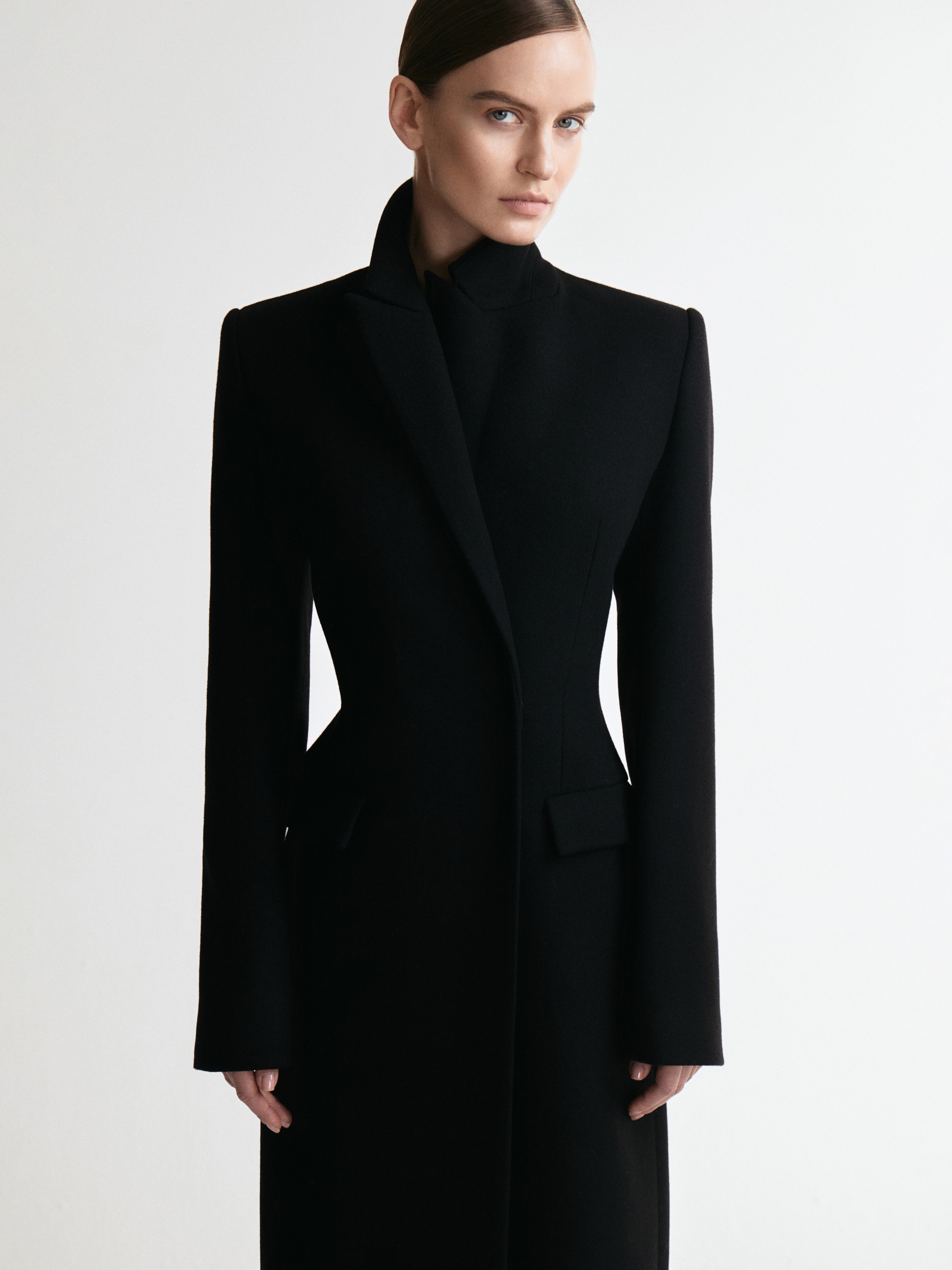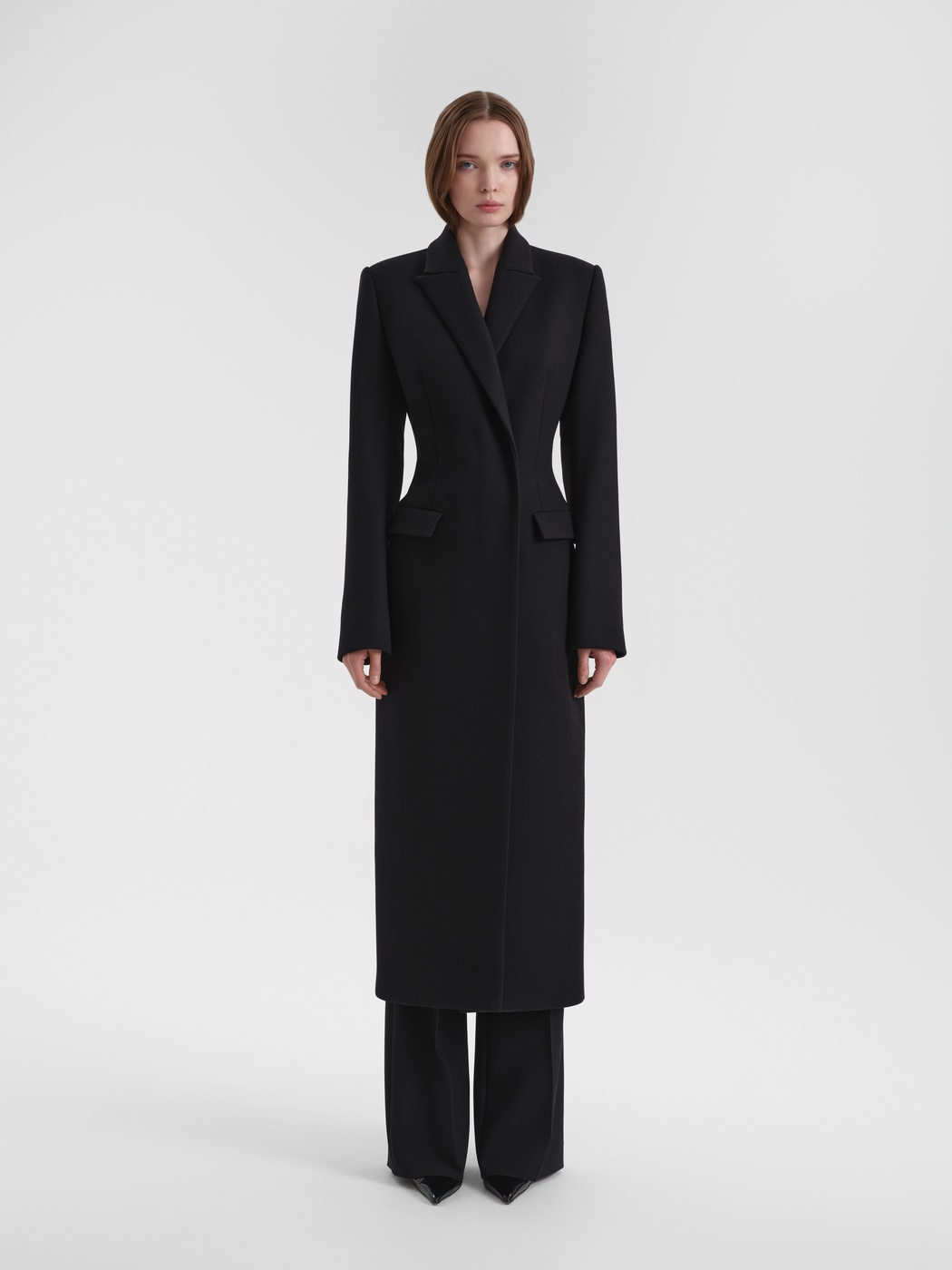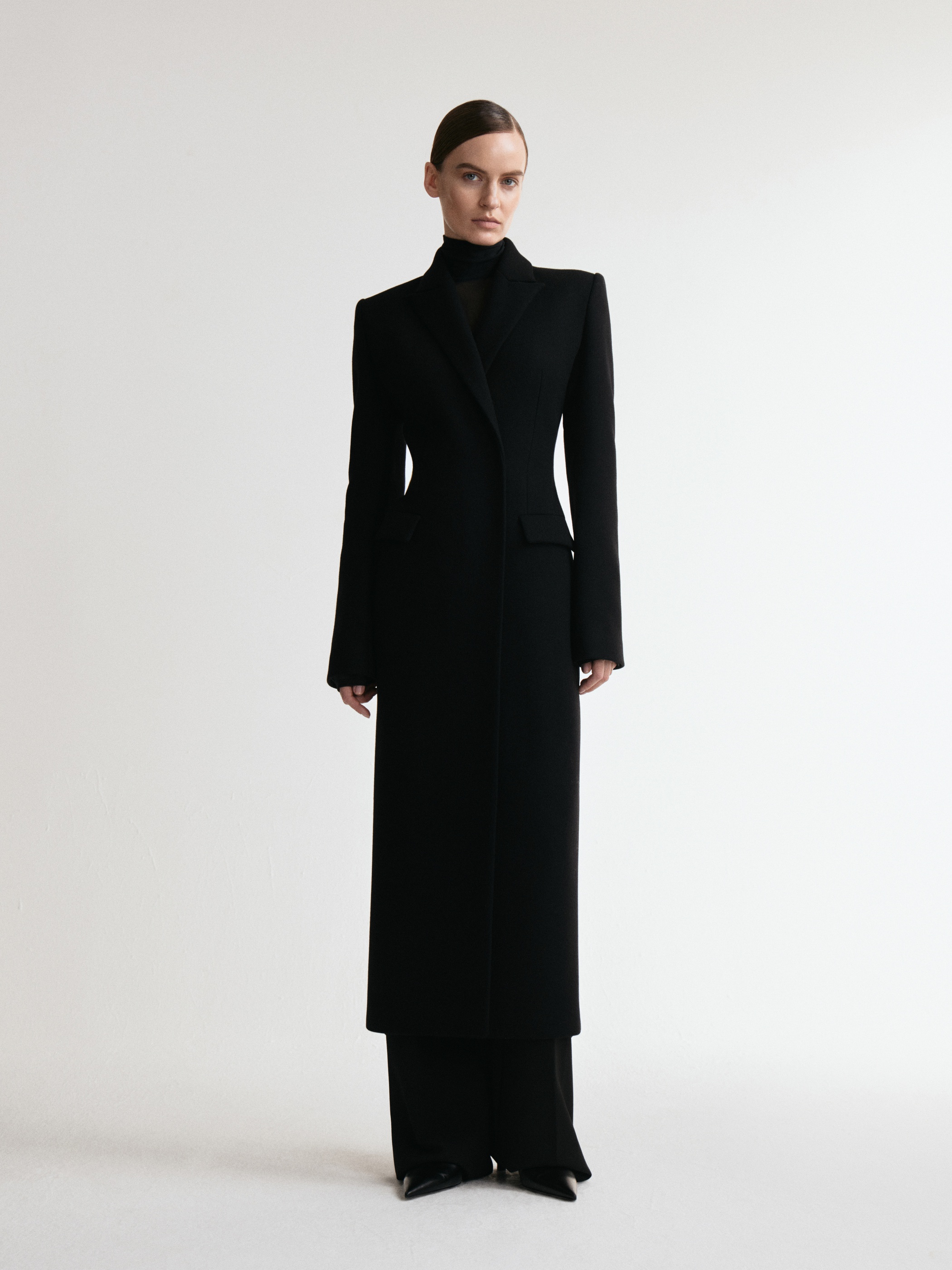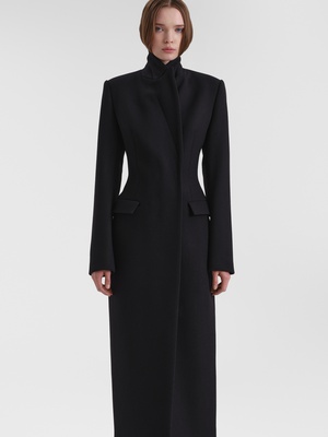 Строгое удлиненное пальто полуприлегающего силуэта. За баланс между стилем и уютом отвечают четкие линии, плечевые накладки и пальтовая ткань. Изделие застегивается на скрытую застежку на две пары кнопок.