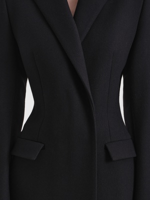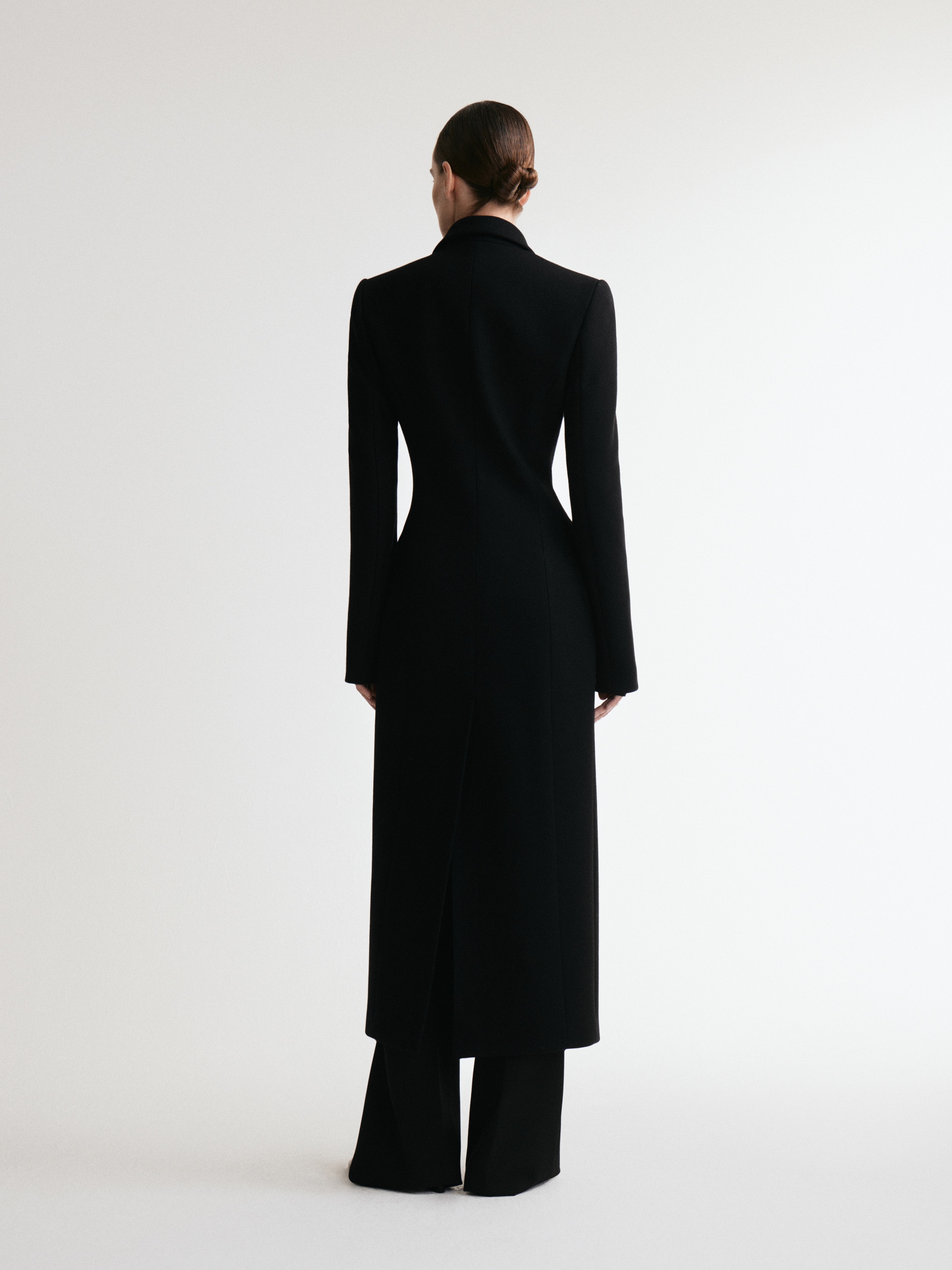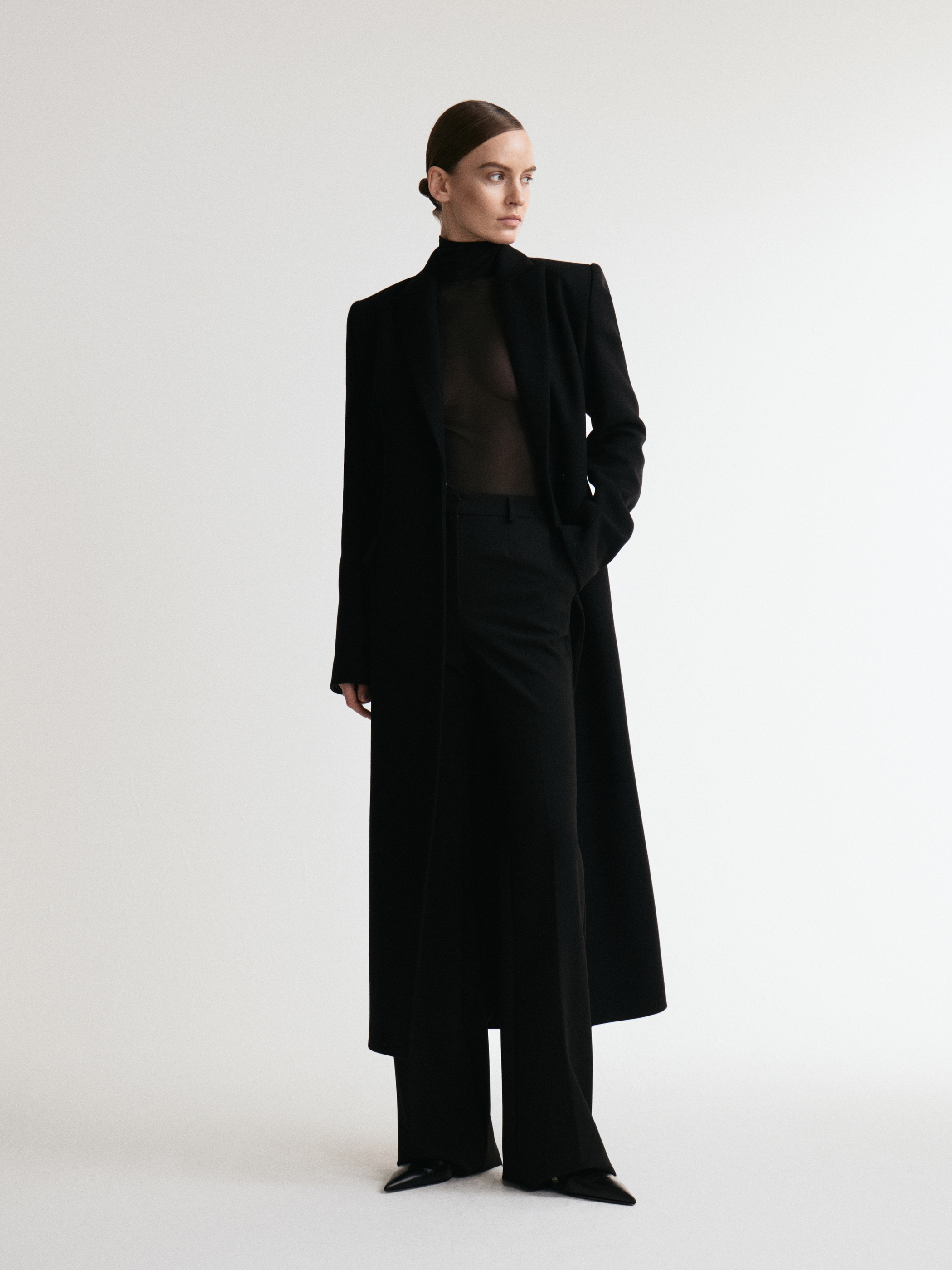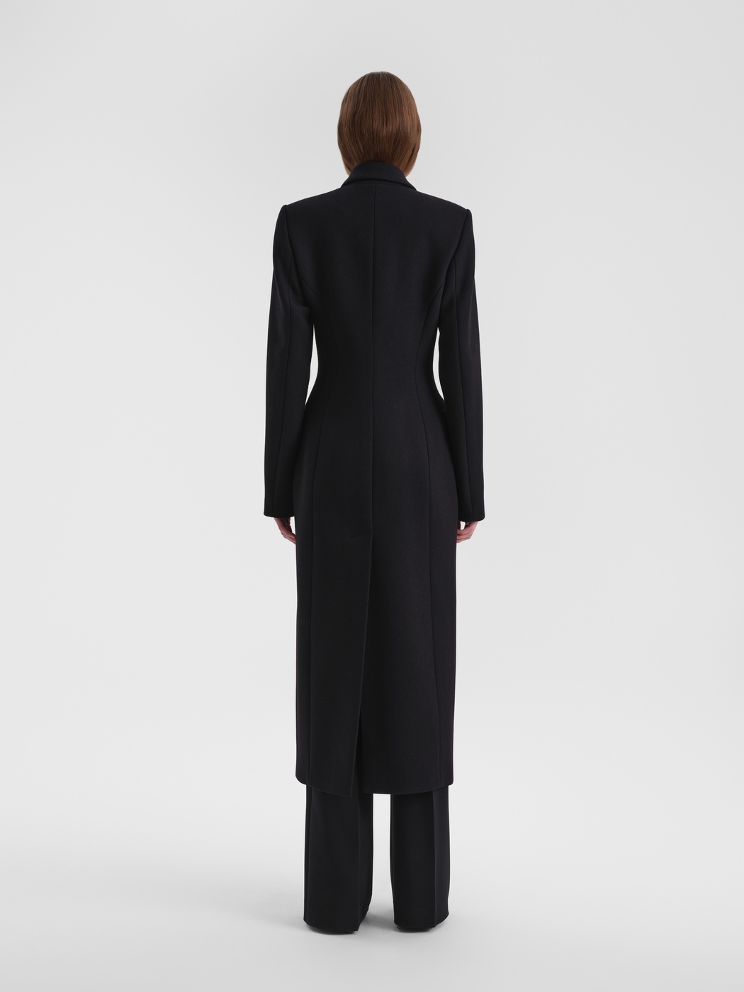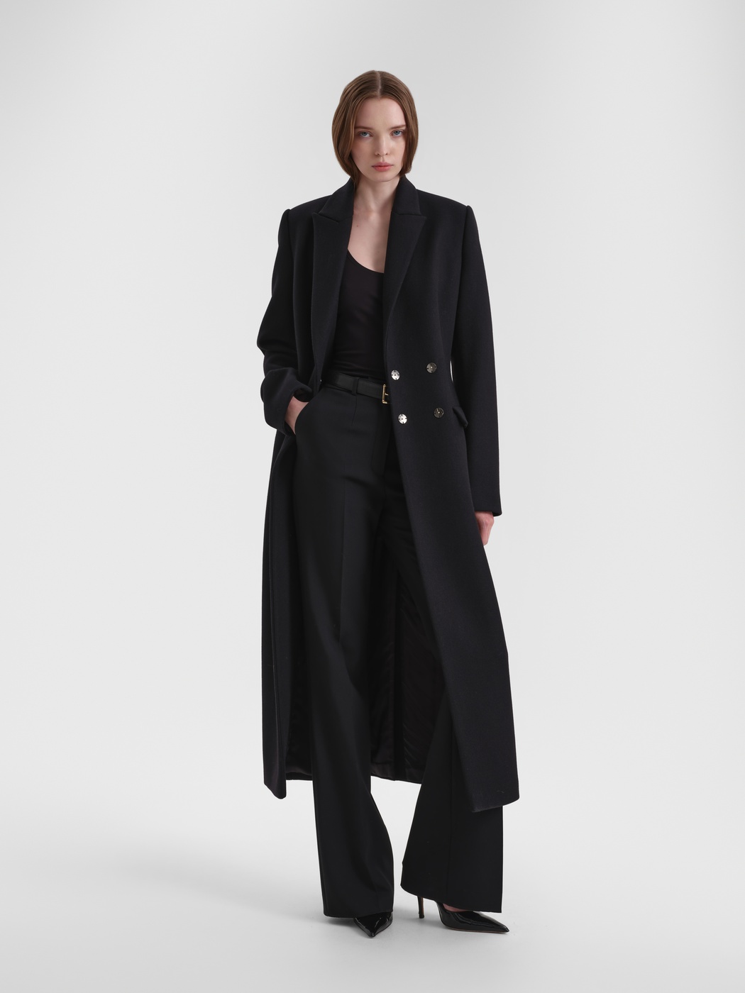 Строгое удлиненное пальто полуприлегающего силуэта. За баланс между стилем и уютом отвечают четкие линии, плечевые накладки и пальтовая ткань. Изделие застегивается на скрытую застежку на две пары кнопок.