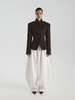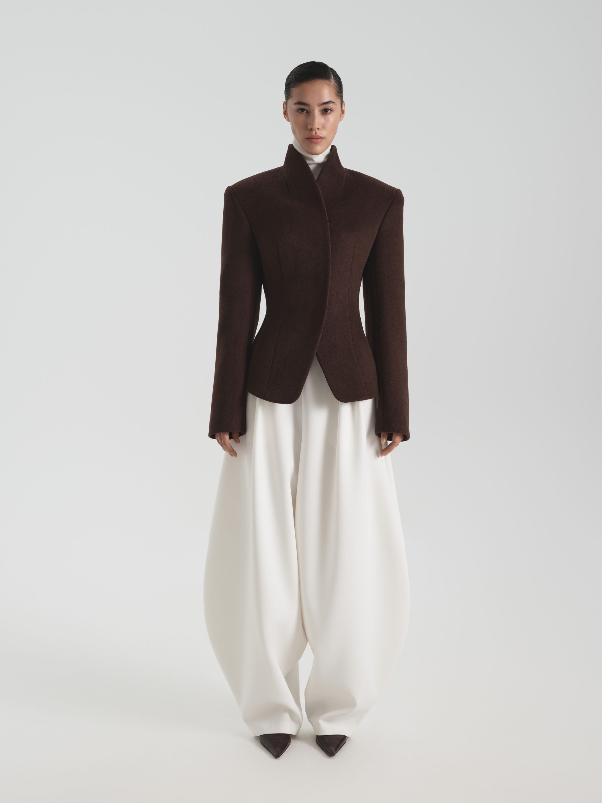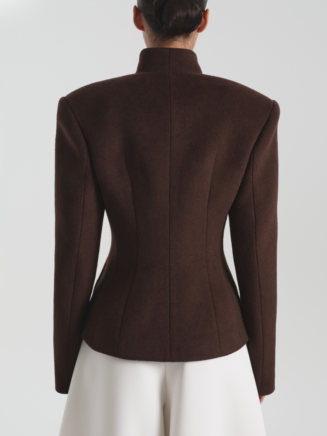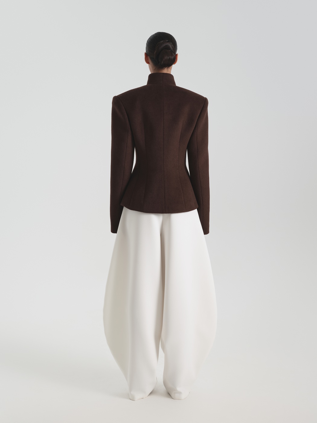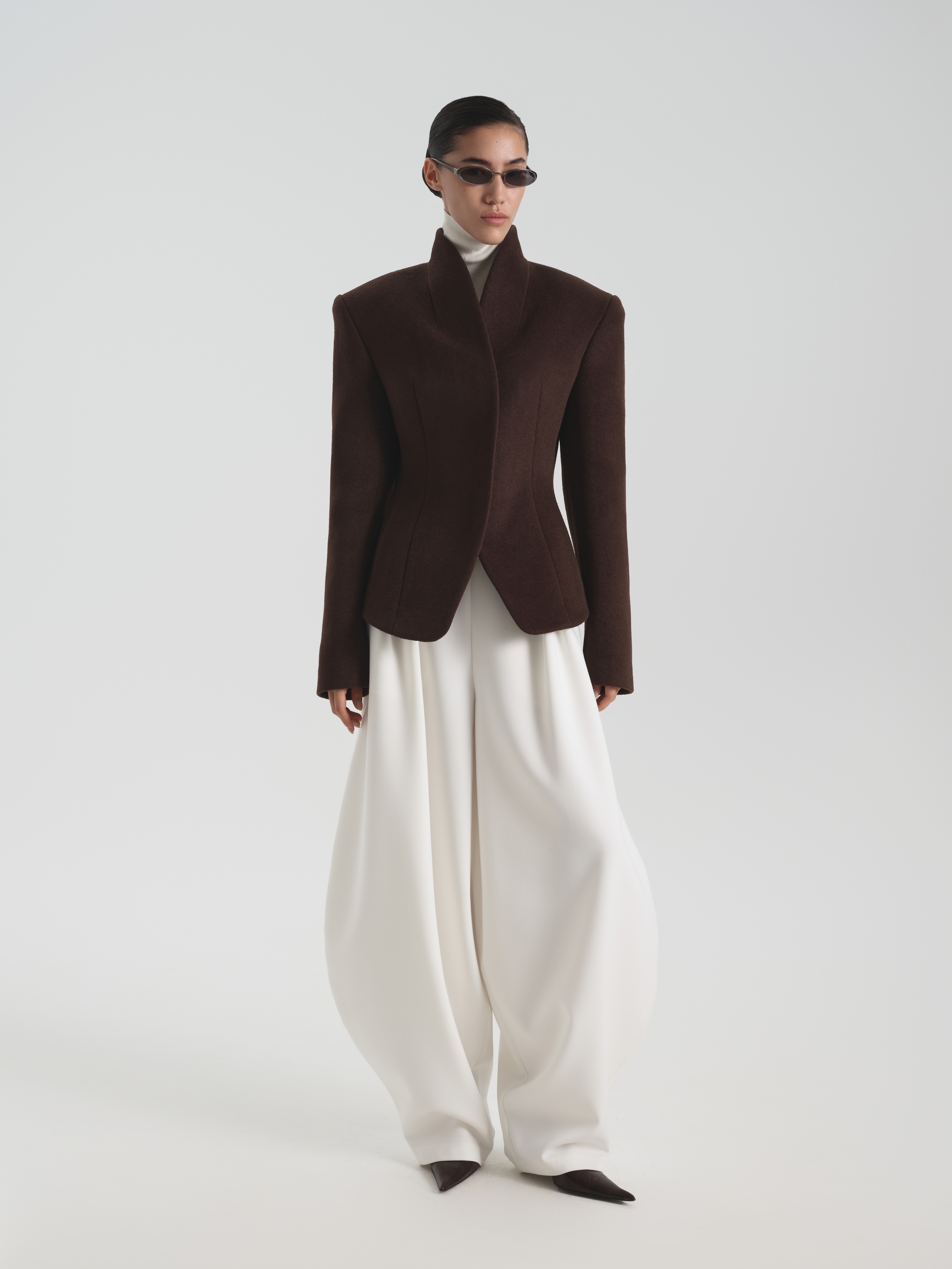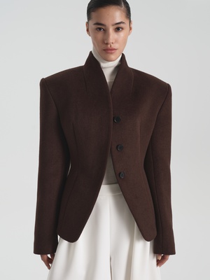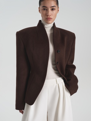 Пальто-жакет Namelazz выполнен в строгом минималистичном крое с лёгким объёмом в верхней части и мягкой линией плеча. Высокая стойка и скрытая застёжка создают цельный, непрерывный силуэт, а приталенная посадка сохраняет пропорции фигуры. Длинные рукава и аккуратные карманы обеспечивают комфорт в повседневной носке. Изделие легко сочетается с разными образами — от классических до повседневных.