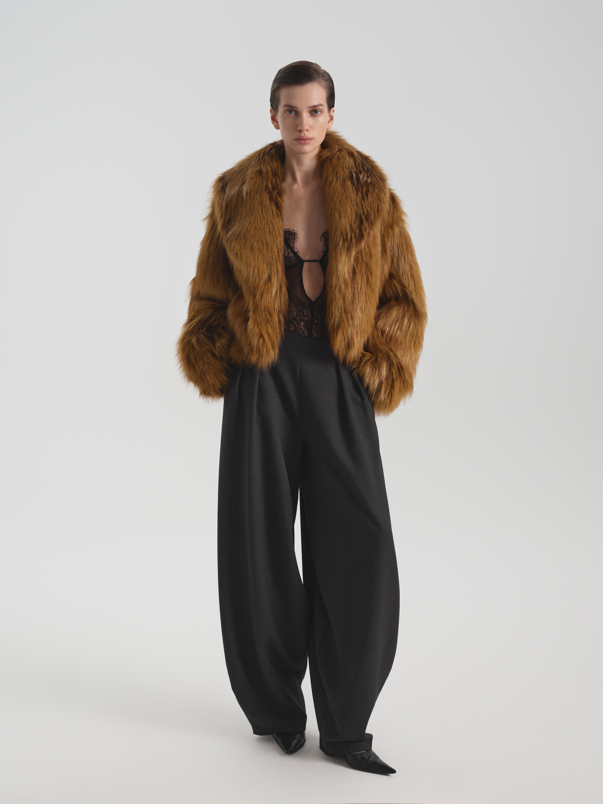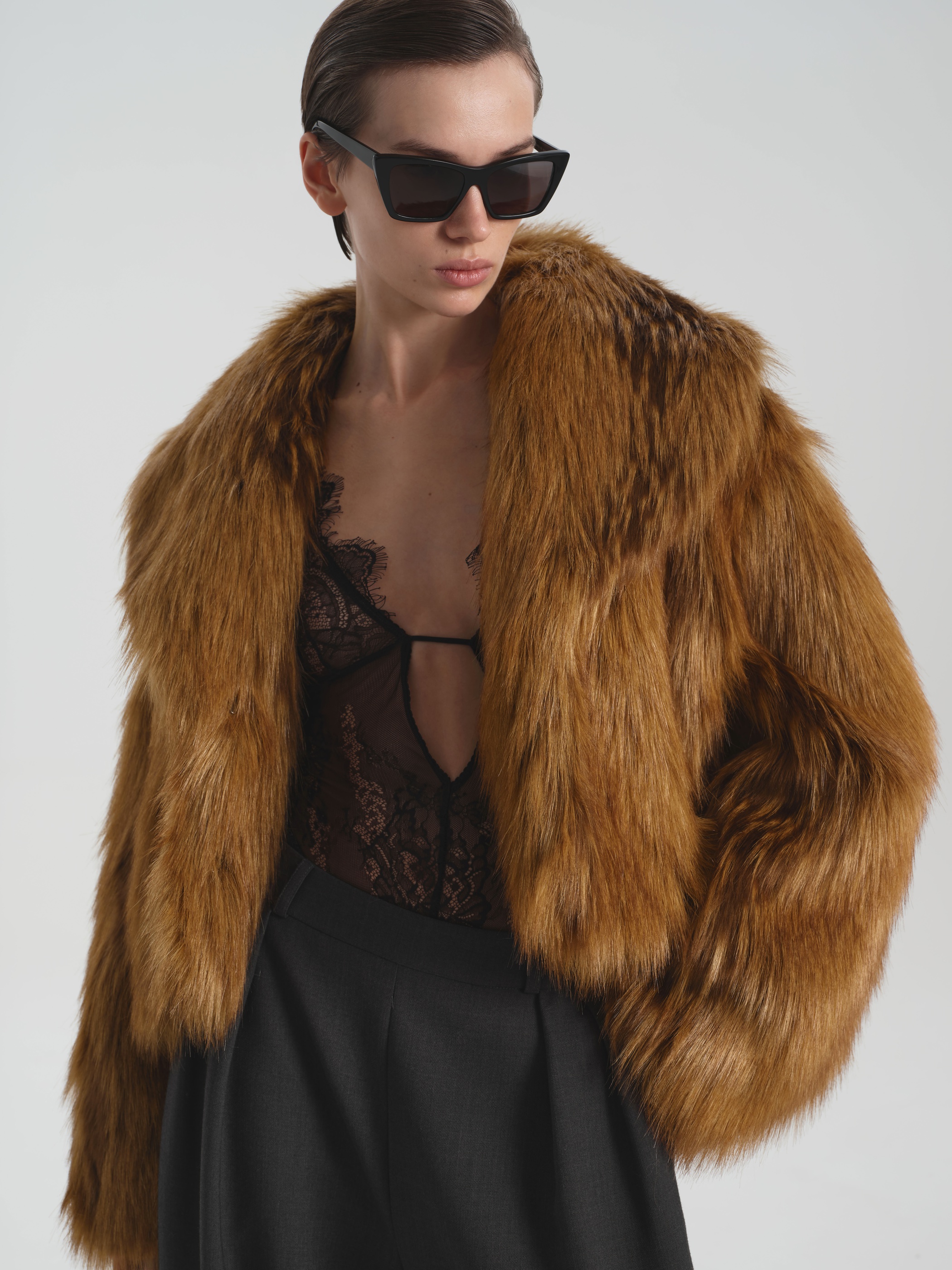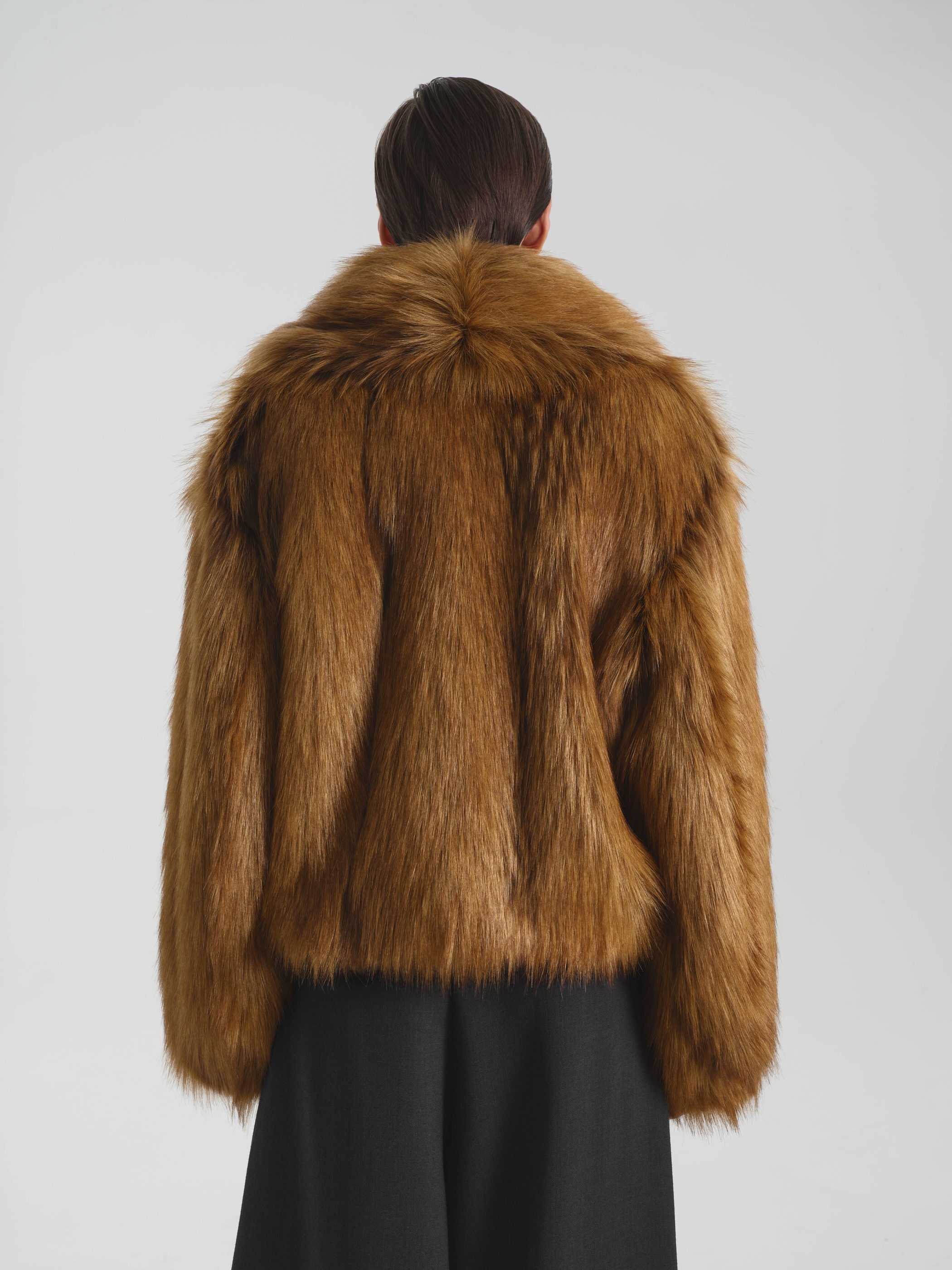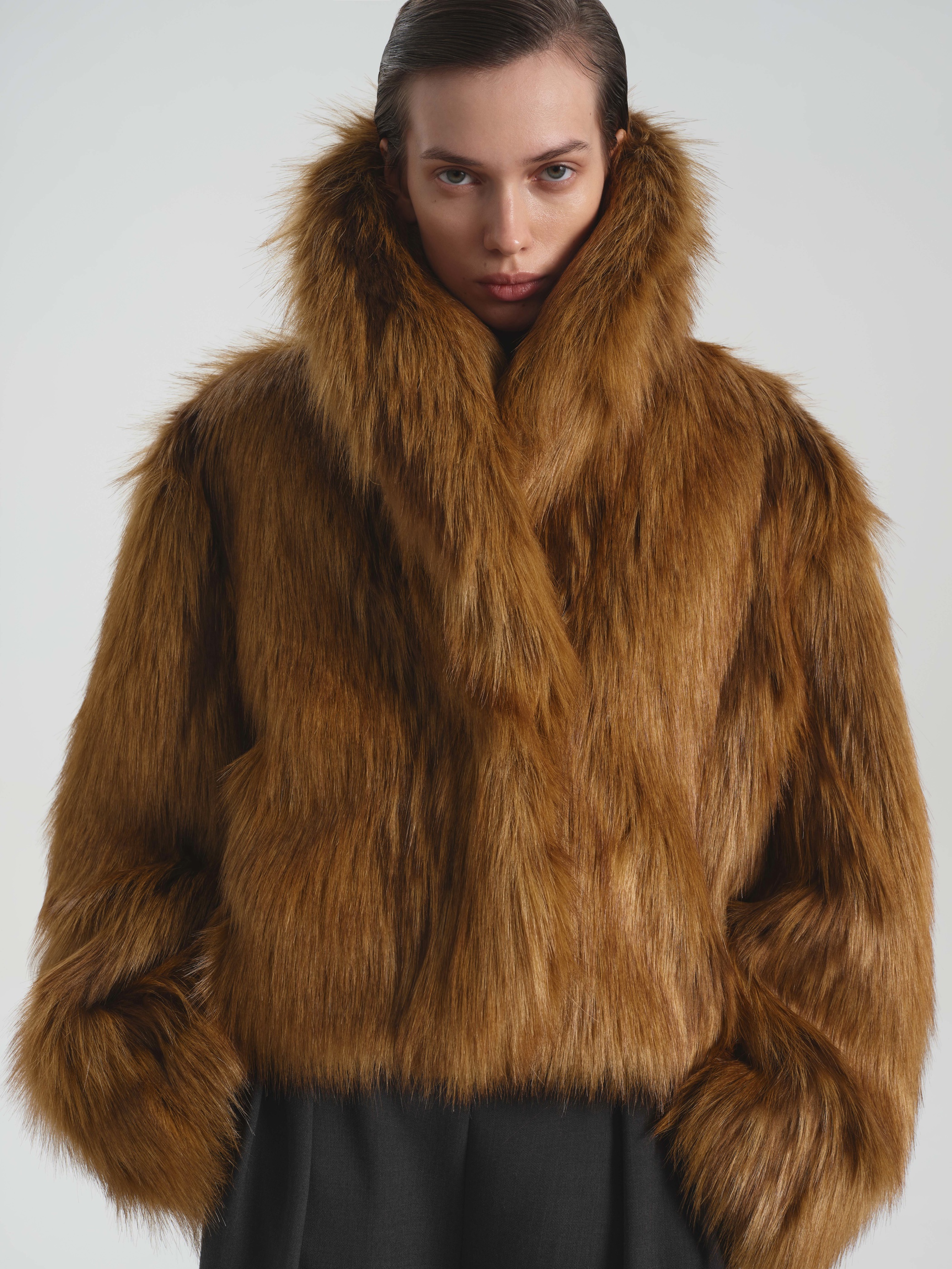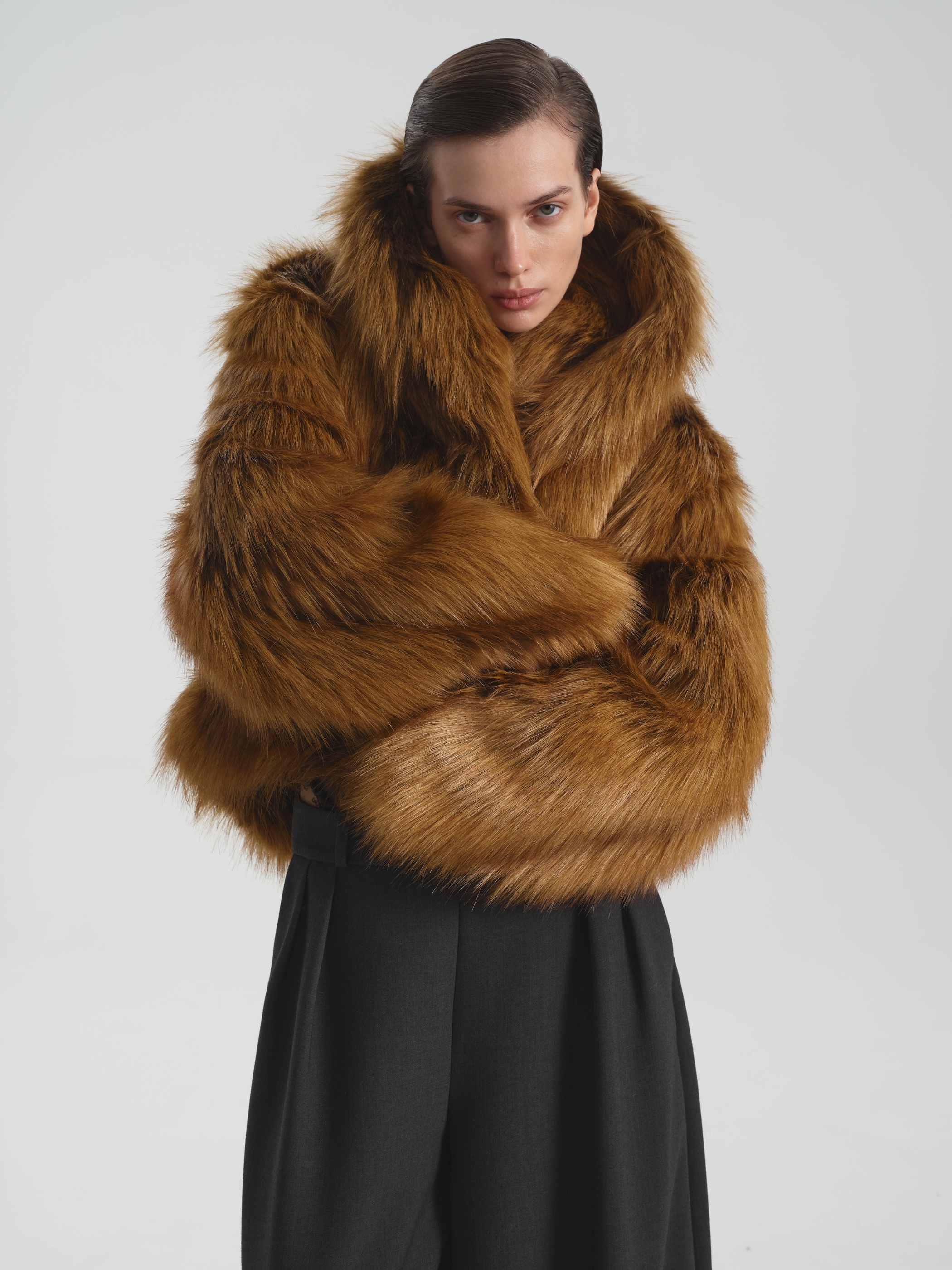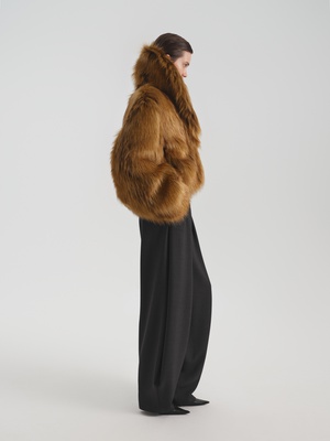 Укороченная шуба Namelazz из эко-меха с имитацией лисы — это лаконичный силуэт с намёком на винтажную элегантность. Мягкий О-образный крой и лёгкое расширение в плечах создают уравновешенную, слегка архитектурную форму, которая подчёркивает осанку, не сковывая движений. Воротник-шаль и плавный лекальный борт с тремя незаметными крючками обеспечивают чистую линию и удобную посадку. Рельефные швы не только добавляют выразительности, но и скрывают функциональные карманы. Благодаря сдержанной длине и умеренному объёму шуба легко сочетается с разными силуэтами — от прямых брюк до платьев миди.