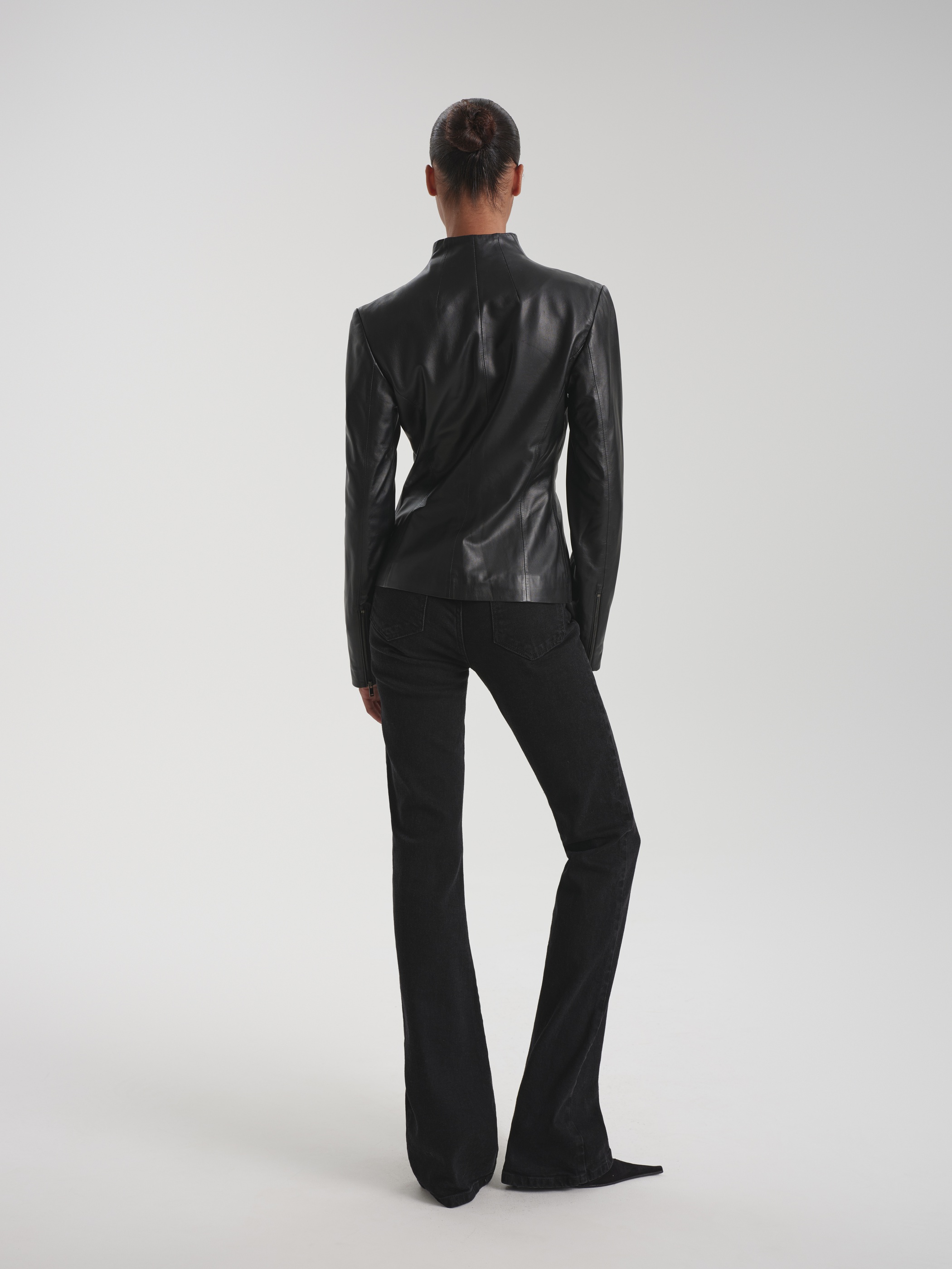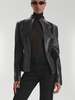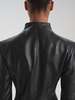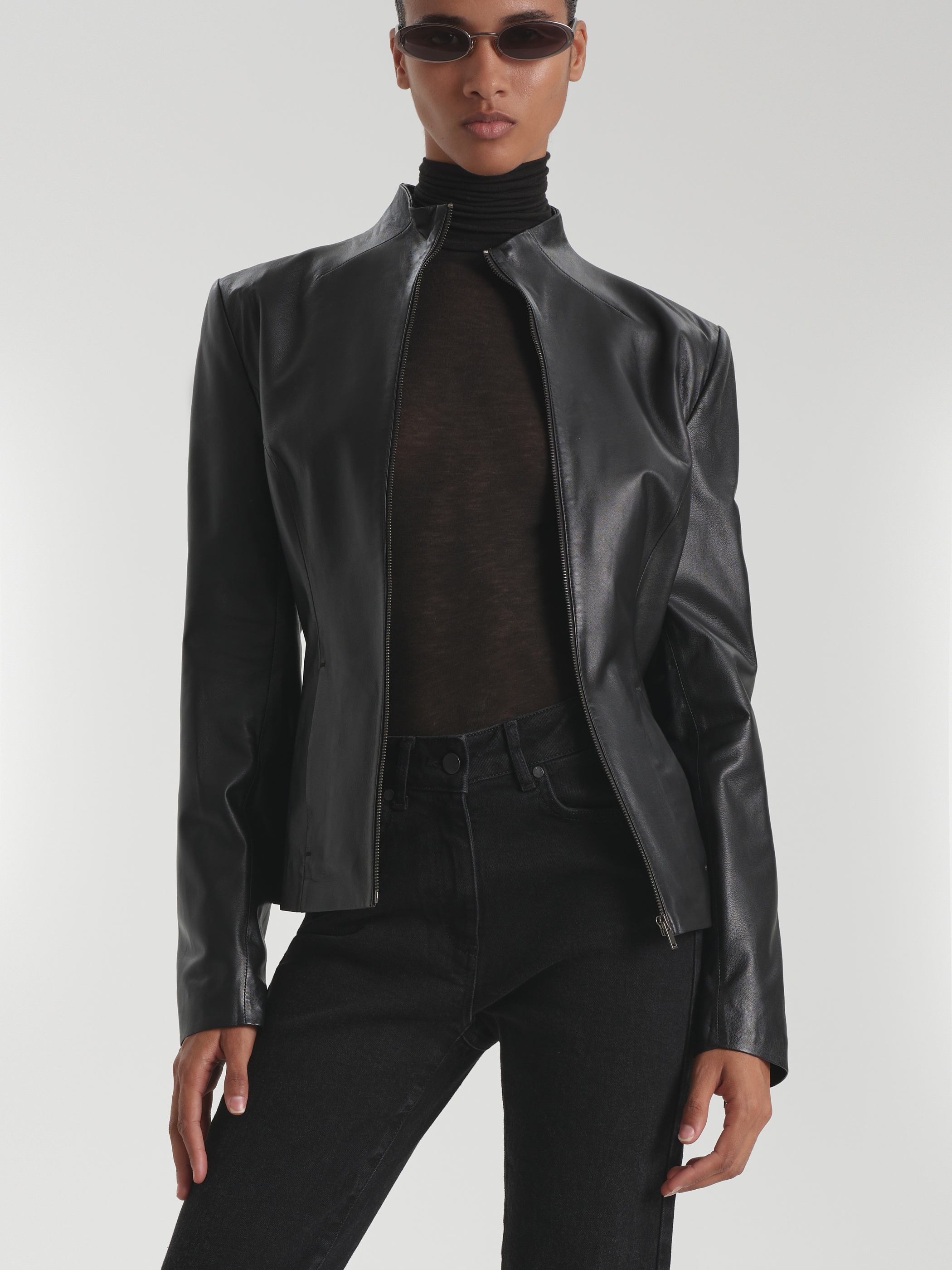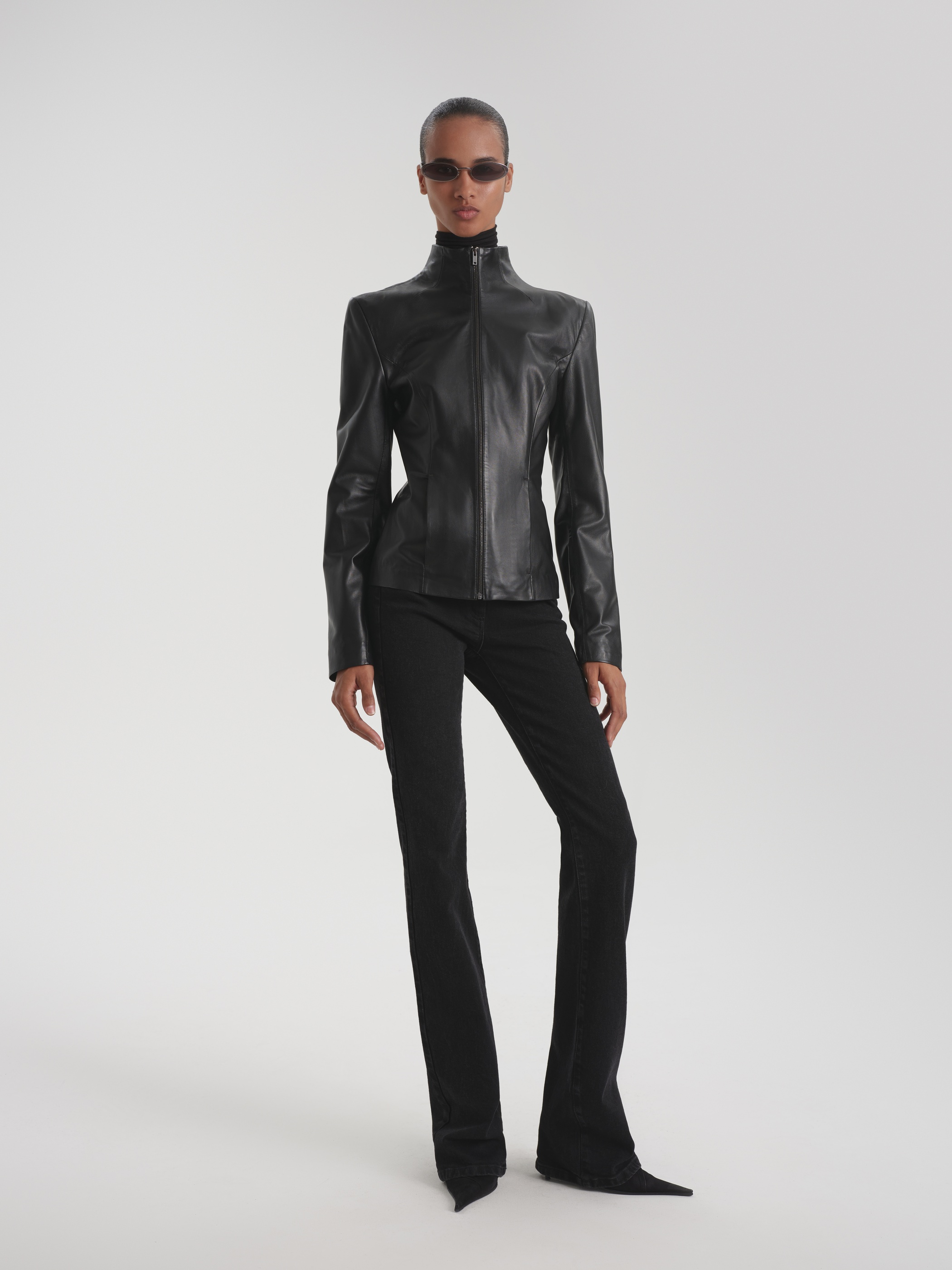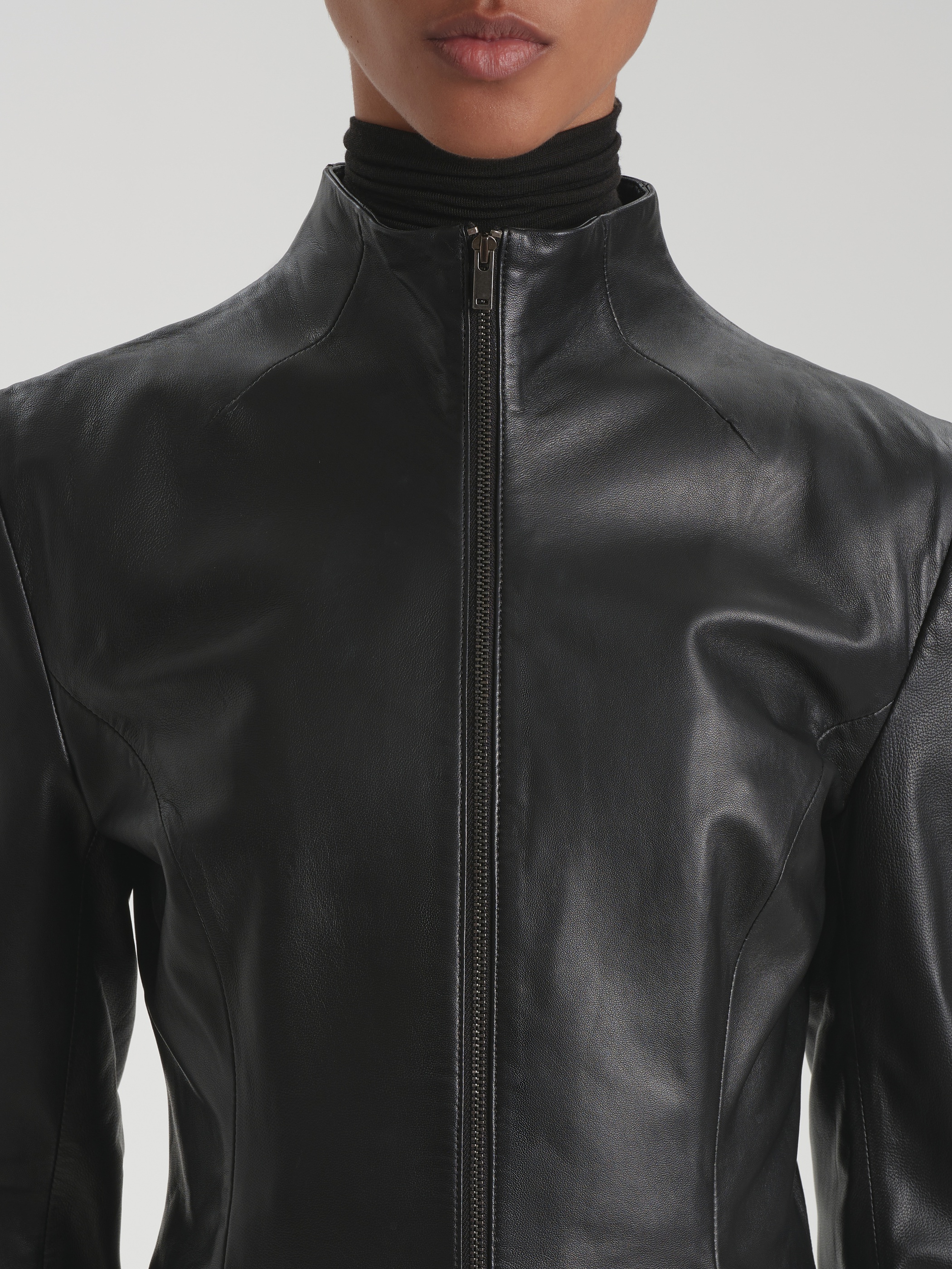 Жакет приталенного силуэта из весенней коллекции выполнен из натуральной кожи универсального цвета. Цельнокроенная стойка и подплечники подчеркивают верхнюю часть тела, создавая идеальный силуэт. Прилегающий силуэт, рельефы спереди и сзади — такая модель поможет создать как повседневный, так и вечерний образ в сочетании с брюками или джинсами. Для модели выбрали эластичную и мягкую кожу, которая сохранила все преимущества натурального материала благодаря бережной обработке.