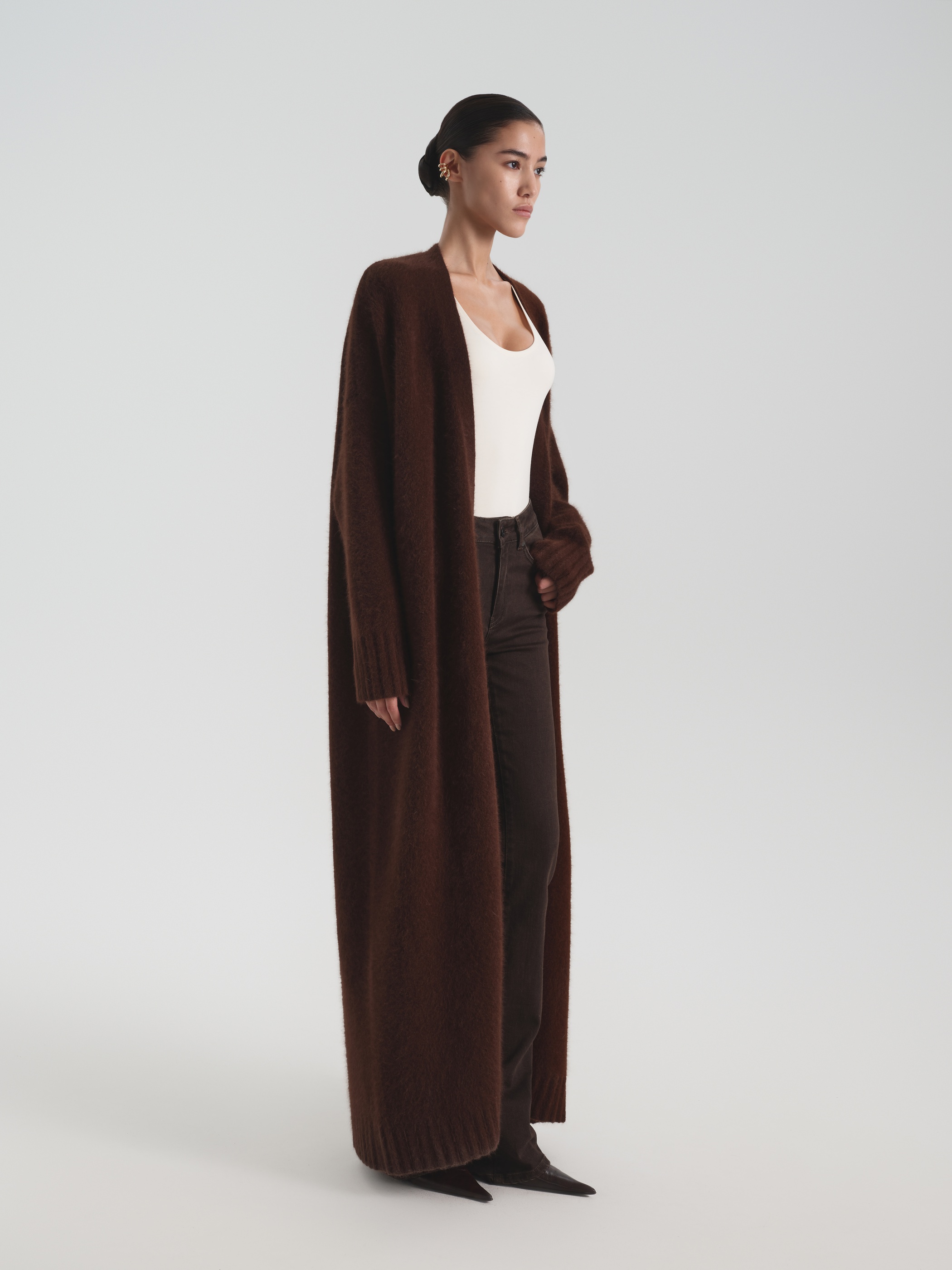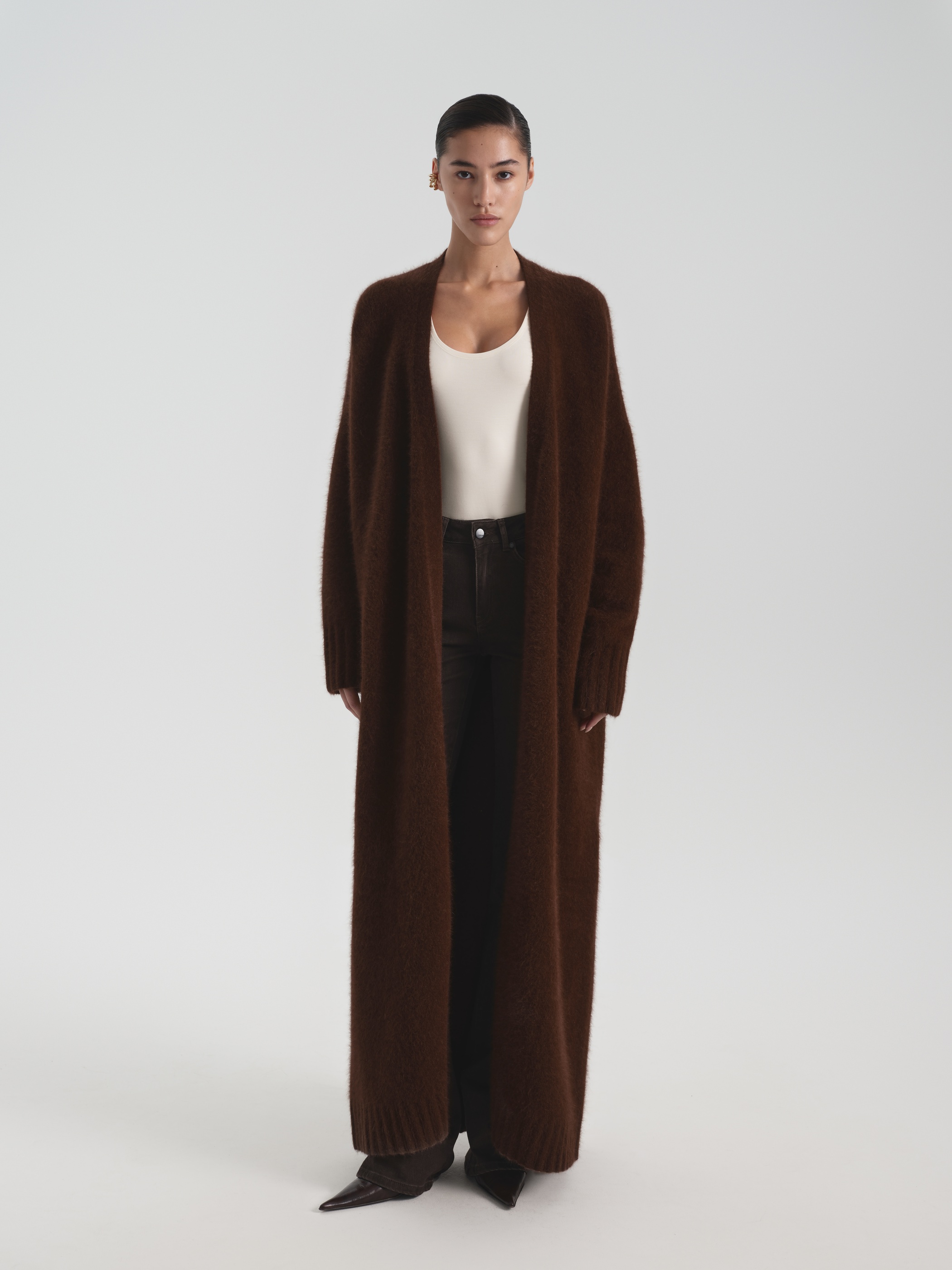 В данной модели мы уделили особое внимание составу пряжи. Материал состоит из шерсти разных текстур: ангора придает мягкость, шерсть – дополнительную защиту от холода, нейлон – упругость, а спандекс – эластичность. В итоге у нас получилась модель с вниманием как к визуальным данным, так и к комфорту.