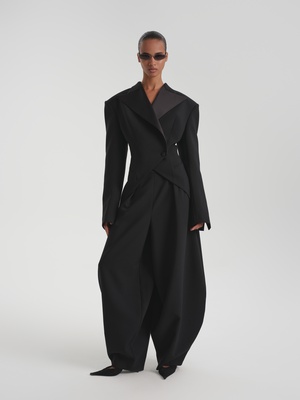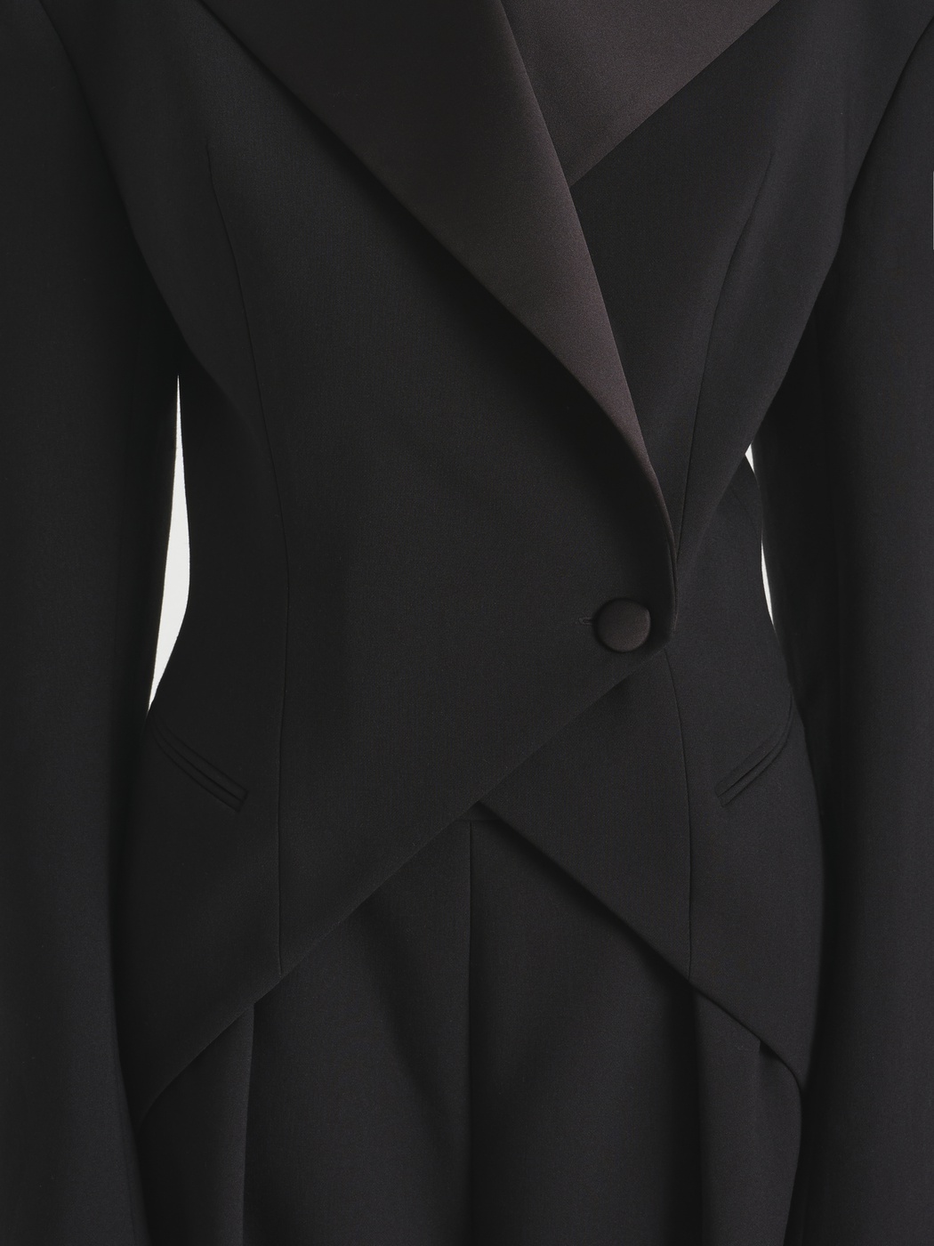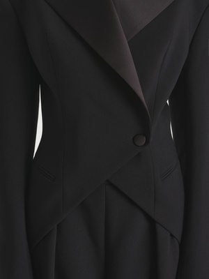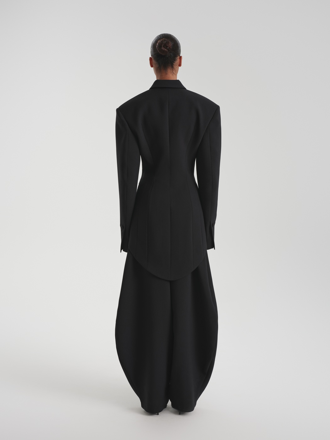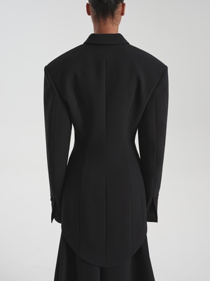 Черный жакет-фрак — это строгость, переписанная в современном ключе. Умеренный объем, приталенный силуэт и удлиненная спинка отсылают к классическому фраку. Расширенные плечи и длинные рукава подчеркивают форму, не перегружая образ. Отложной воротник с крупными лацканами и двубортная застежка — детали, выстроенные по канонам. Длина ниже бедер позволяет носить жакет как с брюками, так и с платьями.