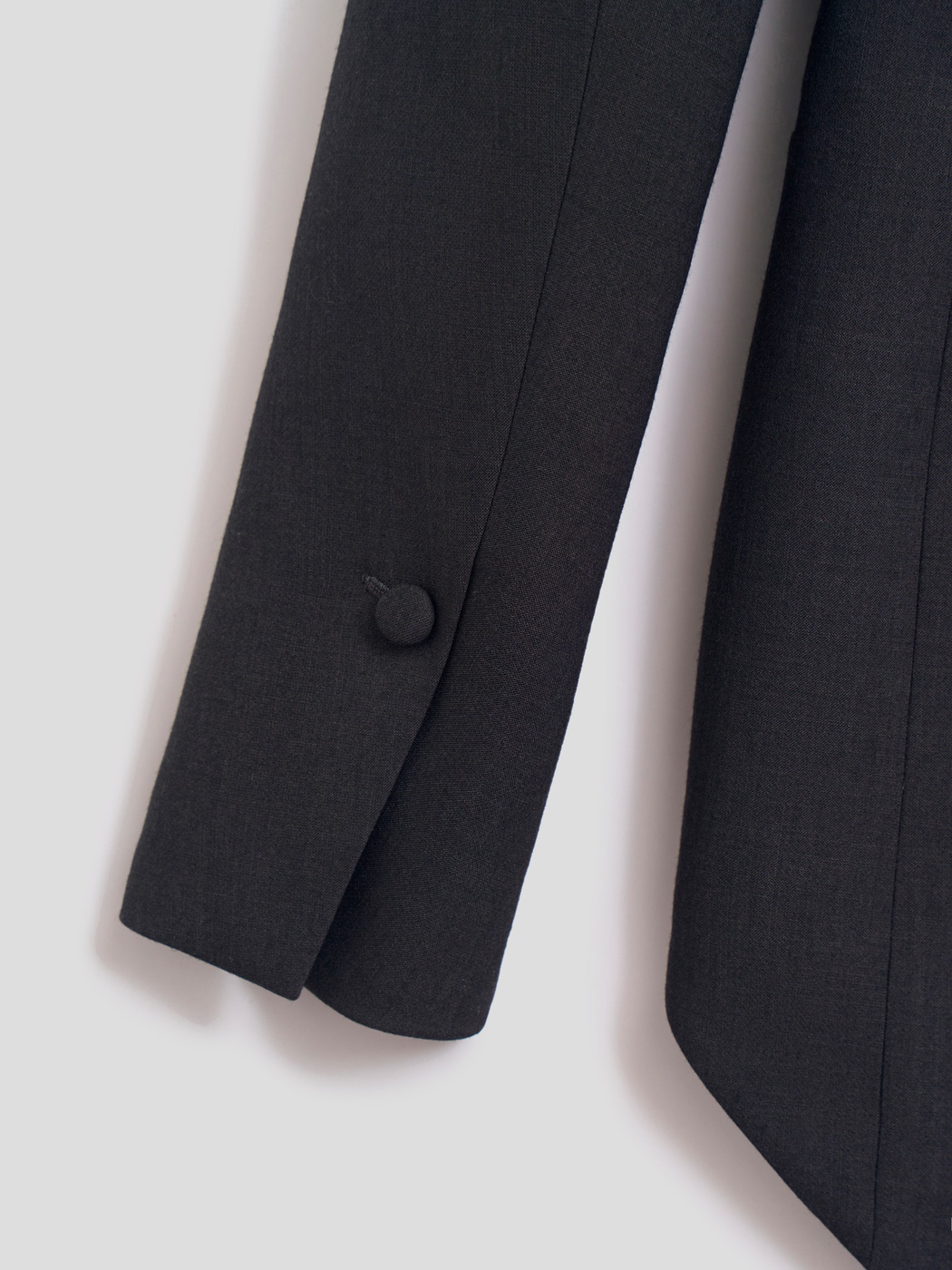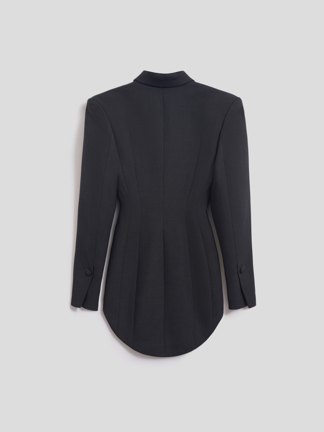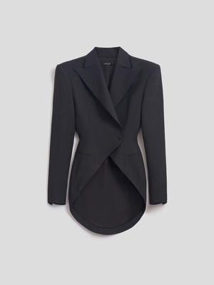 Жакет-фрак — это строгость, переписанная в современном ключе. Умеренный объем, приталенный силуэт и удлиненная спинка отсылают к классическому фрак. Расширенные плечи и длинные рукава подчеркивают форму, не перегружая образ. Отложной воротник с крупными лацканами и двубортная застежка — детали, выстроенные по канонам. Длина ниже бедер позволяет носить жакет как с брюками, так и с платьями.