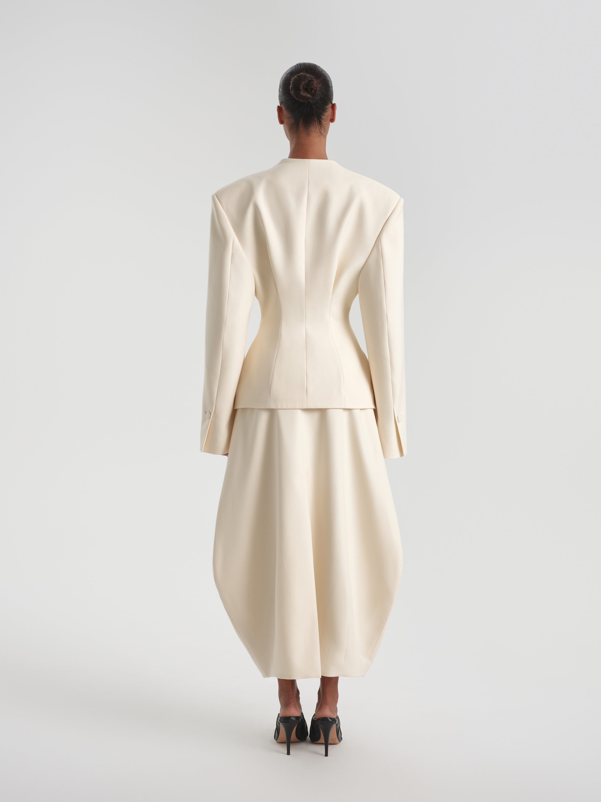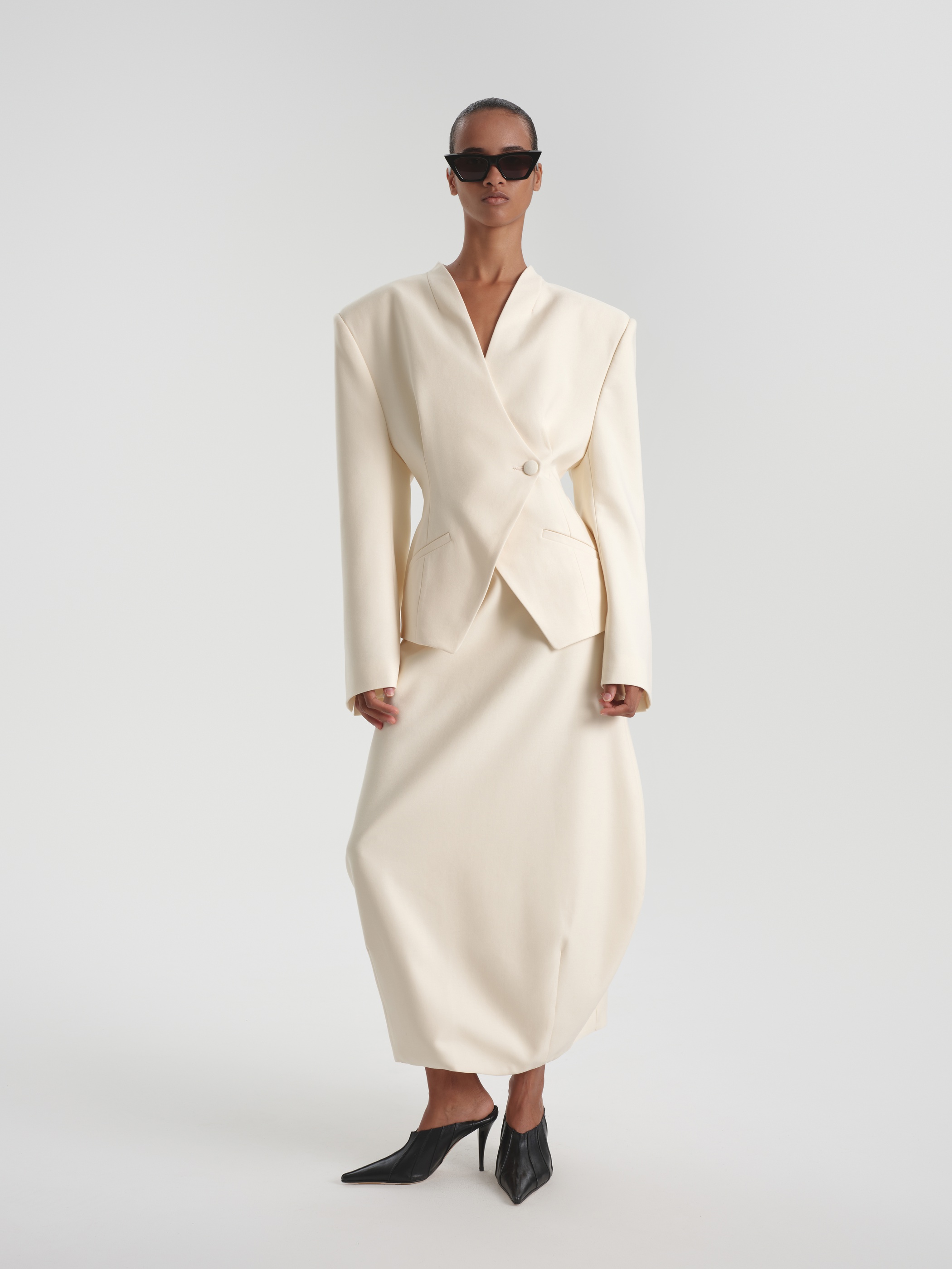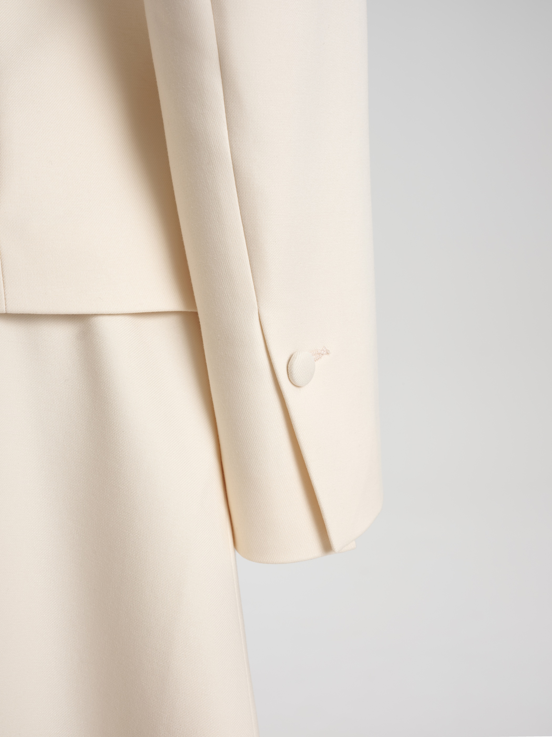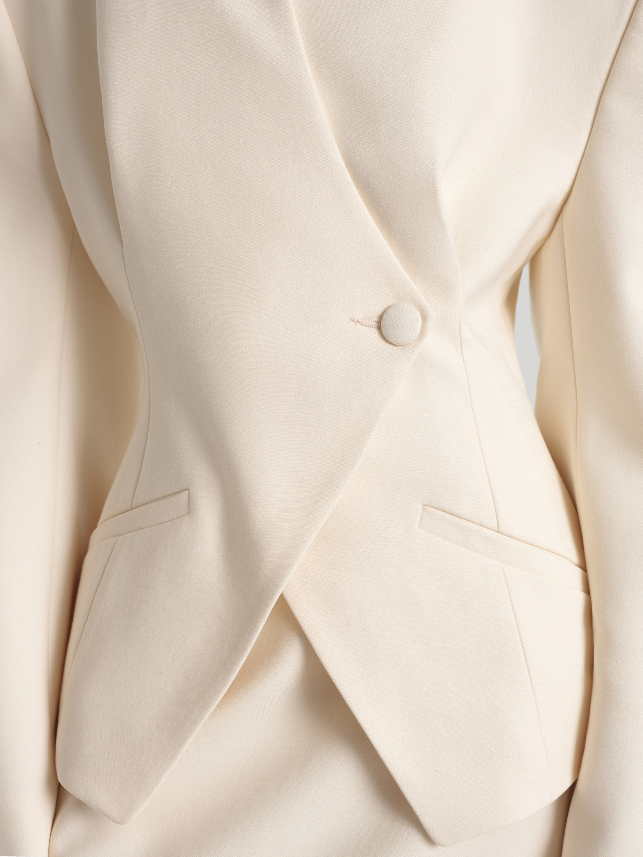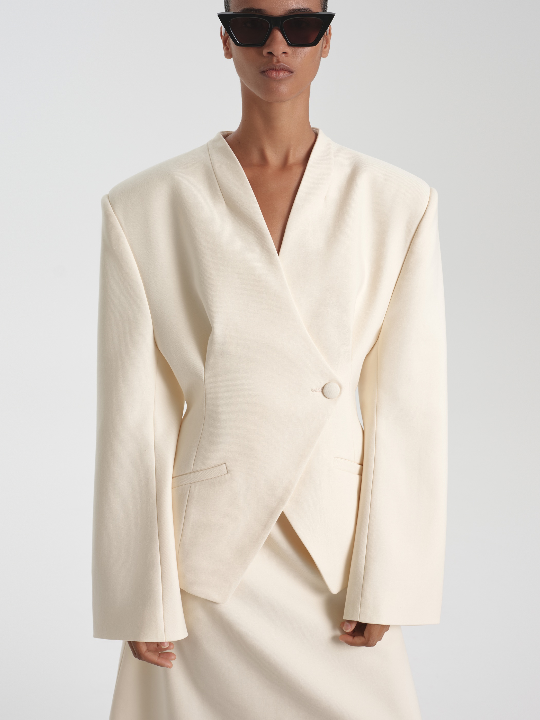 Узнаваемый силуэт жакета в новом прочтении. Для новой модели жакета мы сохранили приталенный силуэт при этом расширив линию плеч плечевыми накладками и укоротив модель до середины линии бедра. Модель с объемным силуэтом, цельнокроеным воротником-стойкой и асимметричным низом создаёт выразительный образ. Идеальный выбор для стильных офисных и вечерних образов.